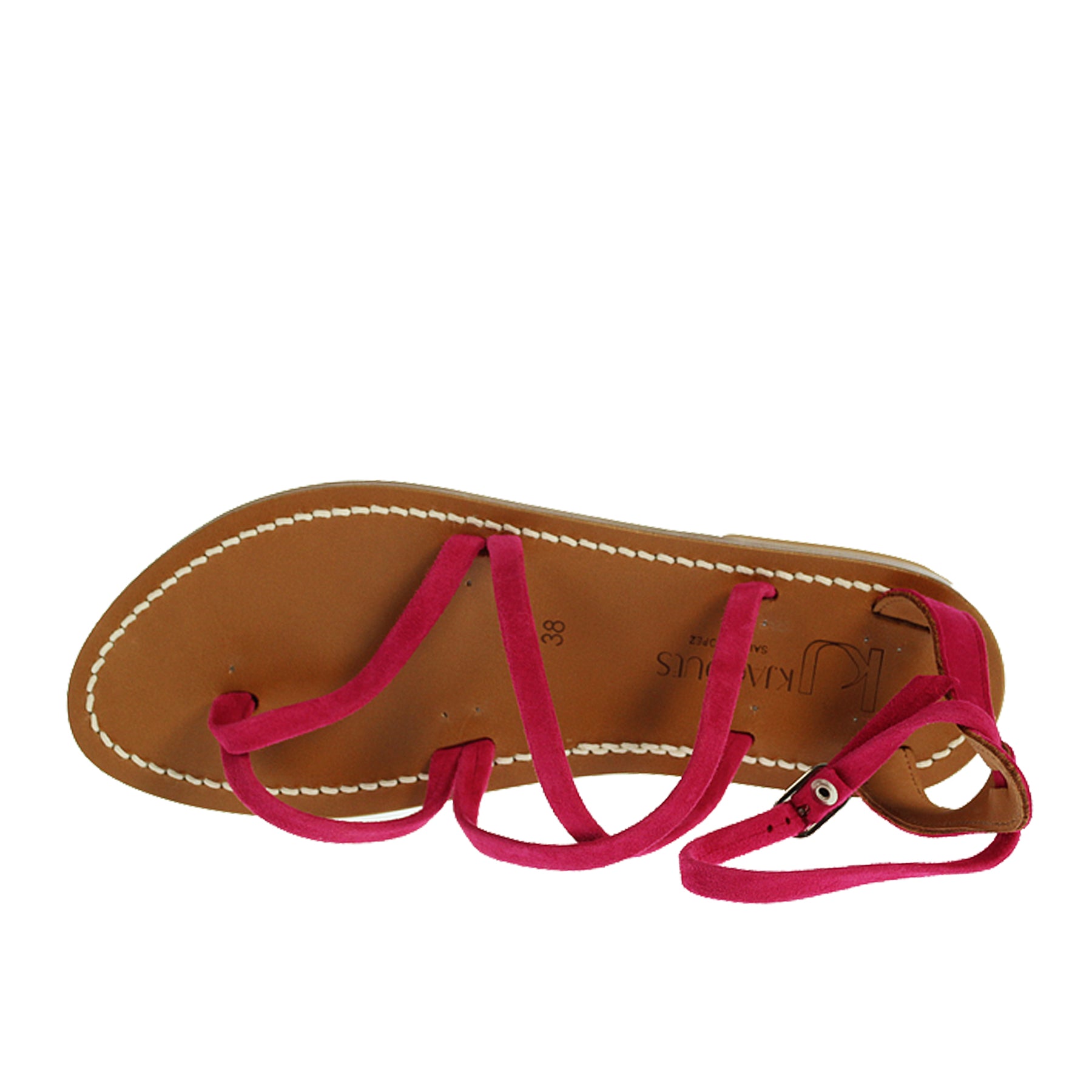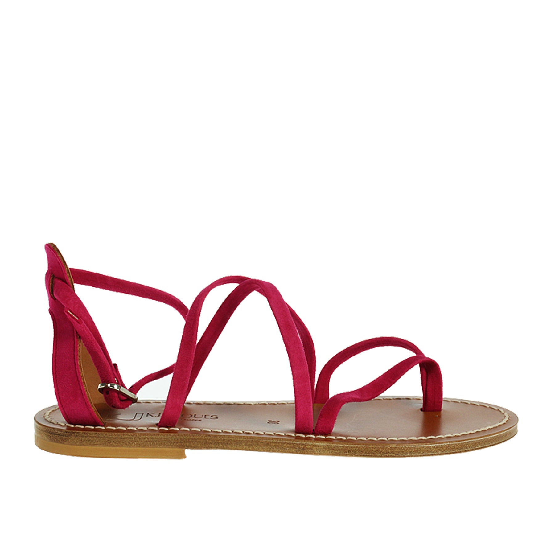 Sandalo piatto K.Jacques, in camoscio fucsia, ad infradito, con cinturino alla caviglia, fatte a mano, con suola in cuoio, sandalo iconico che viene fabbricato a Saint Tropez dal 1933, design intramontabile e perfetto per l'estate, suola in vero cuoio, made in francia