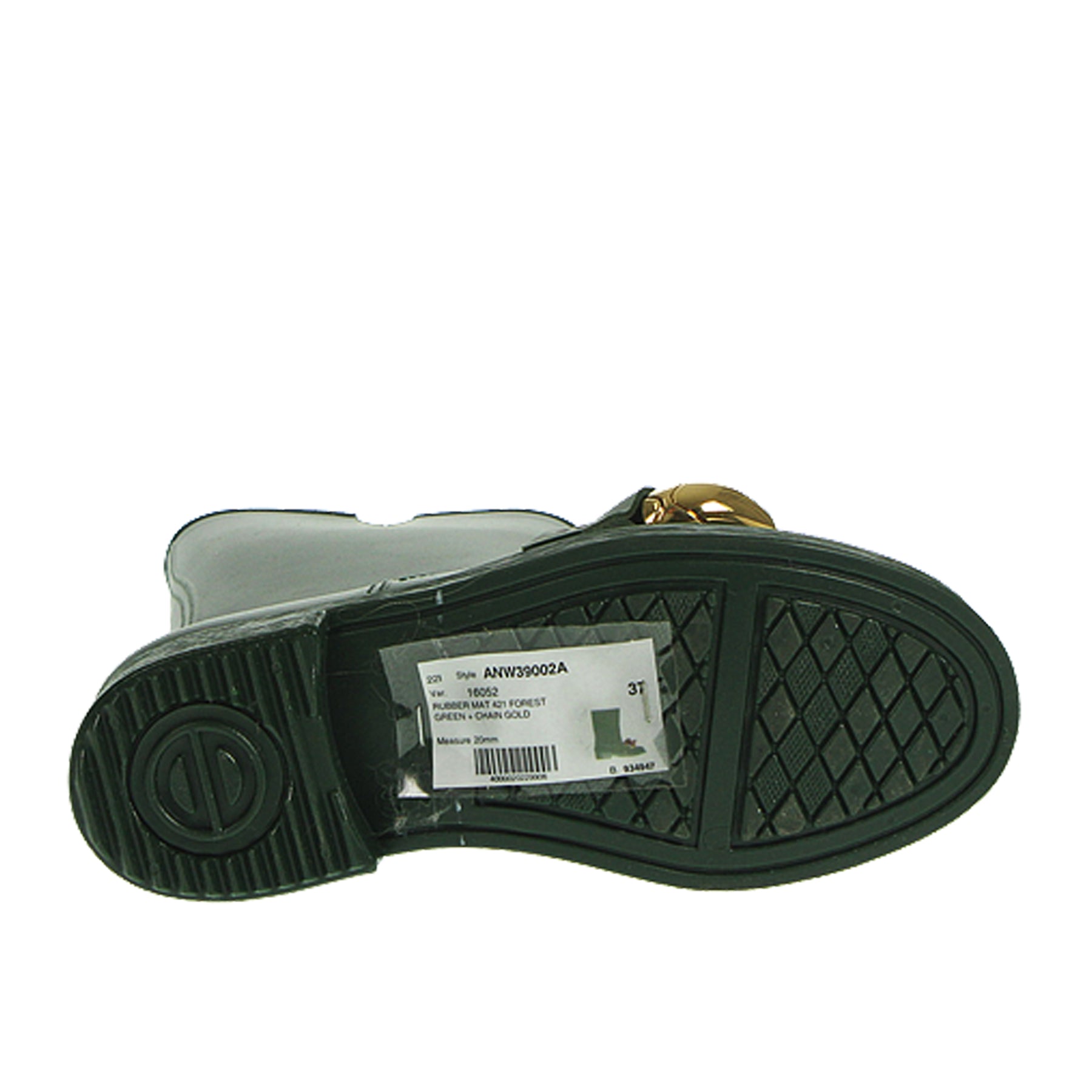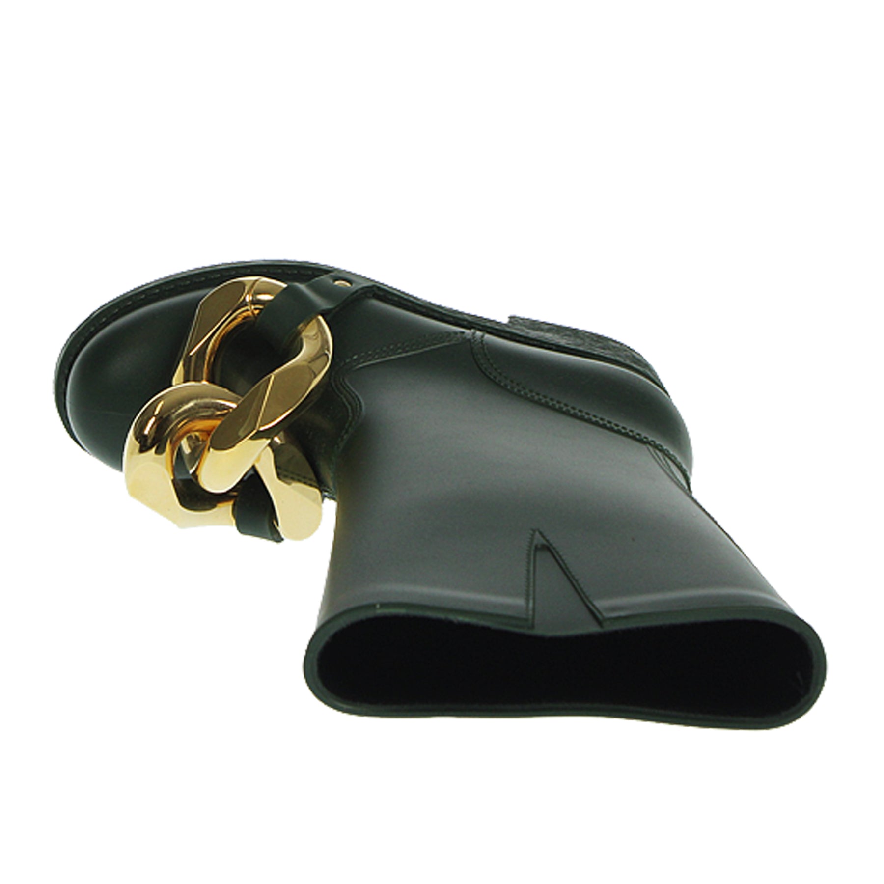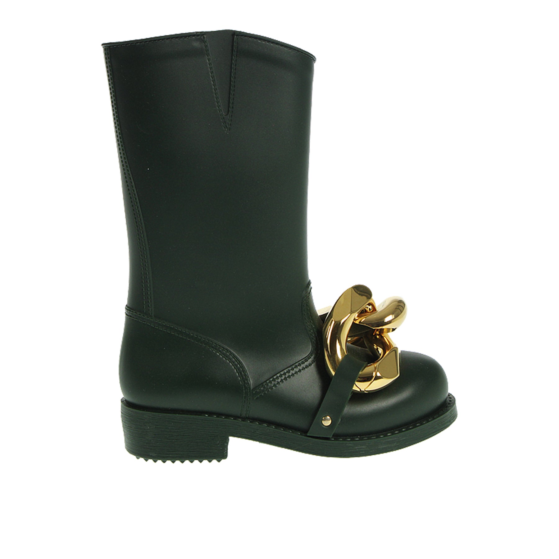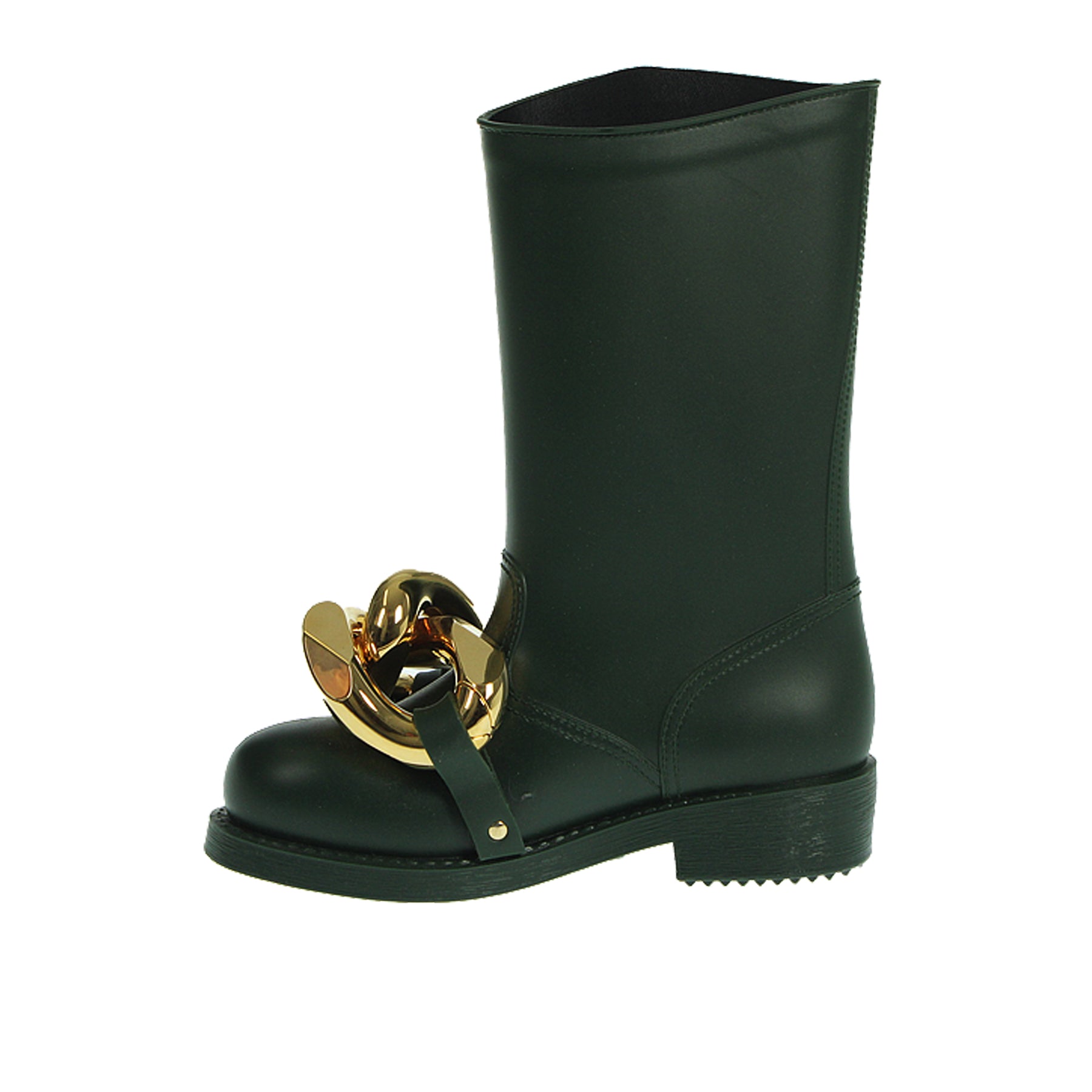 Stivale JW Anderson, in gomma, colore verde scuro, con fibbia dorata sul davanto, suola in gomma
