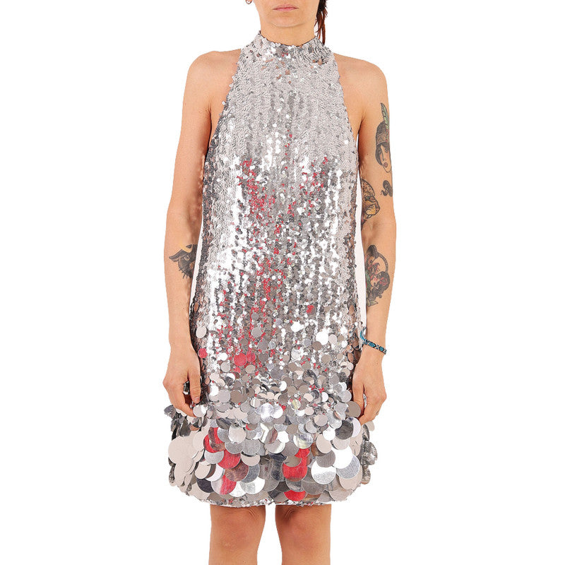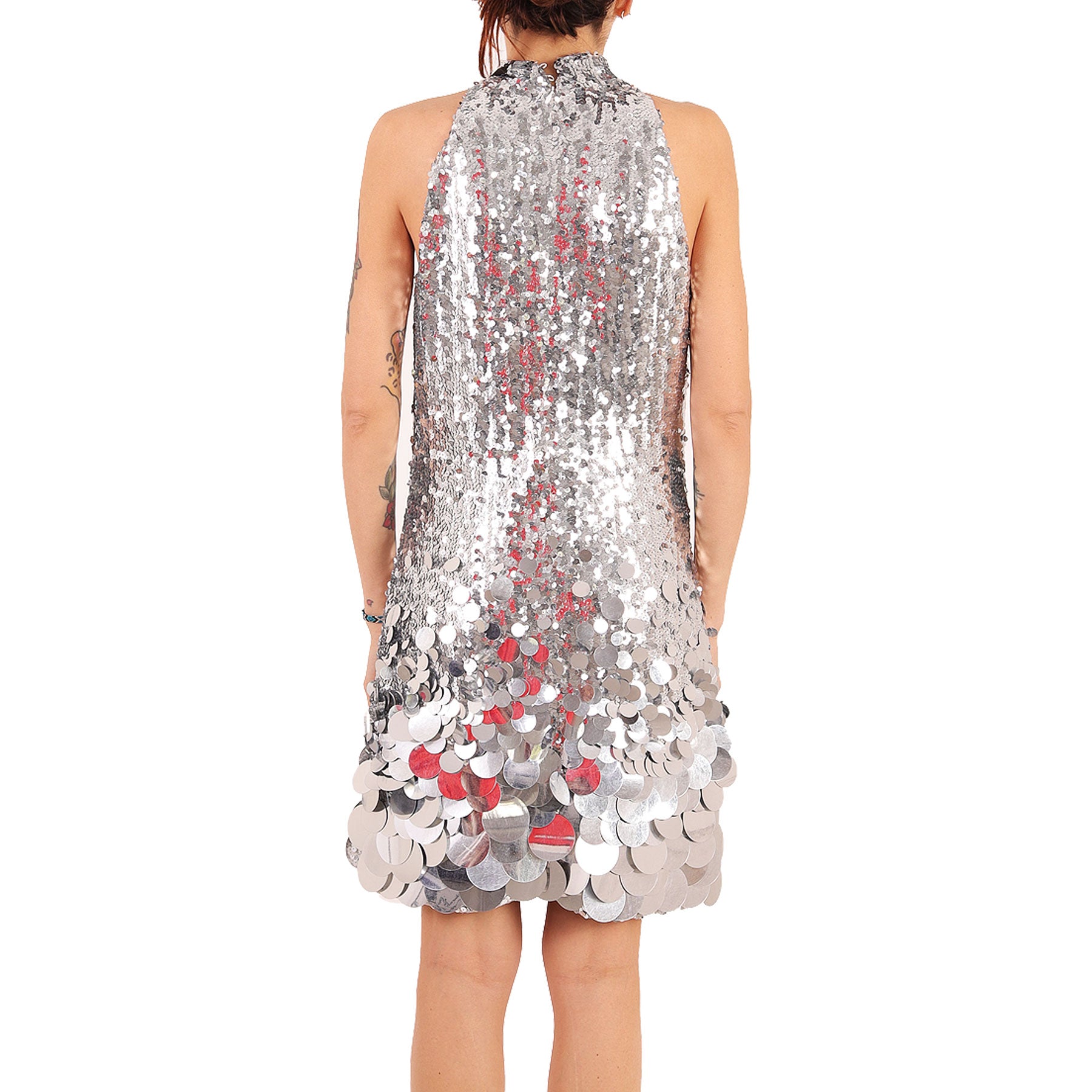 Amen dress, silver, sequins, sleeveless, back closure, lined.