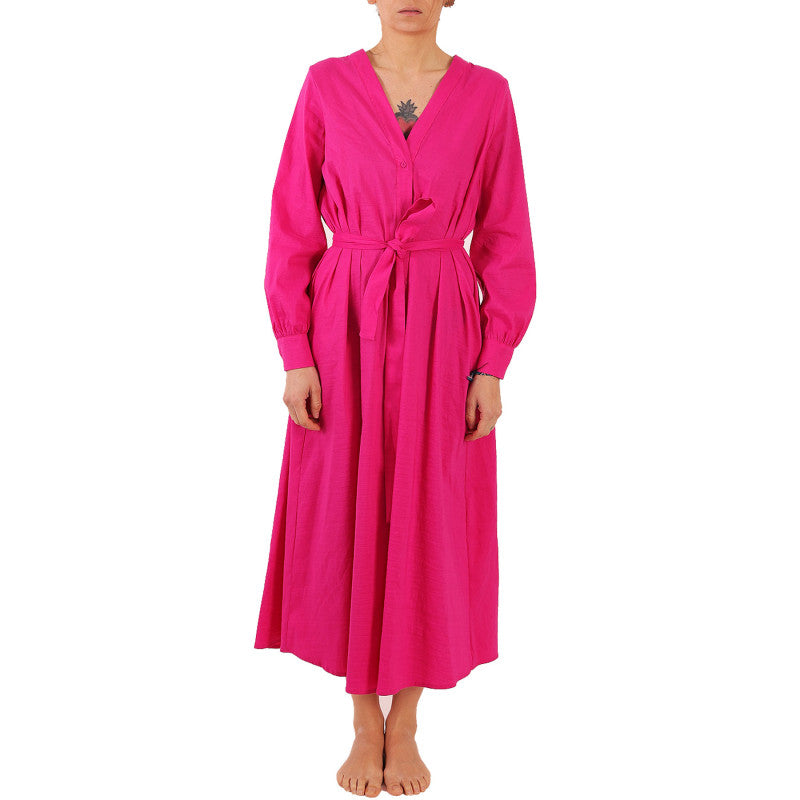 Dress, Momoni, fuchsia, with buttons, V-neck, belted waist, in a linen and cotton blend.