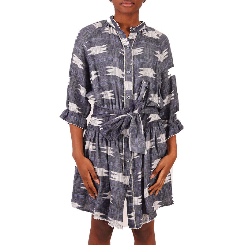 Dress, Bazar Deluxe, in linen, patterned, blue and white, with belt at the waist, with buttons.