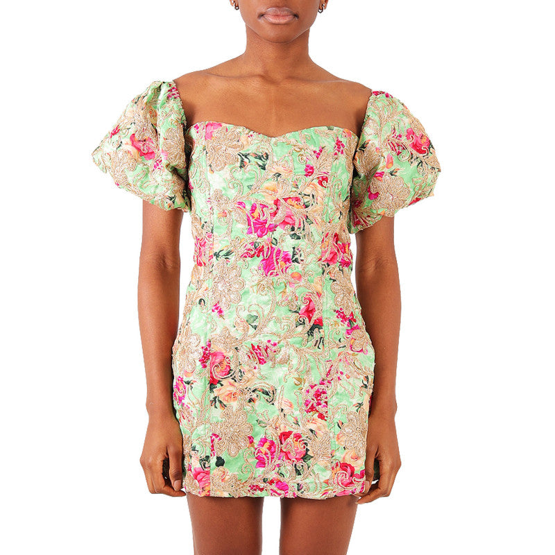 Leonie dress, floral, multicolor, with gold embroidery, short puff sleeves, with braiding on the back, lined.