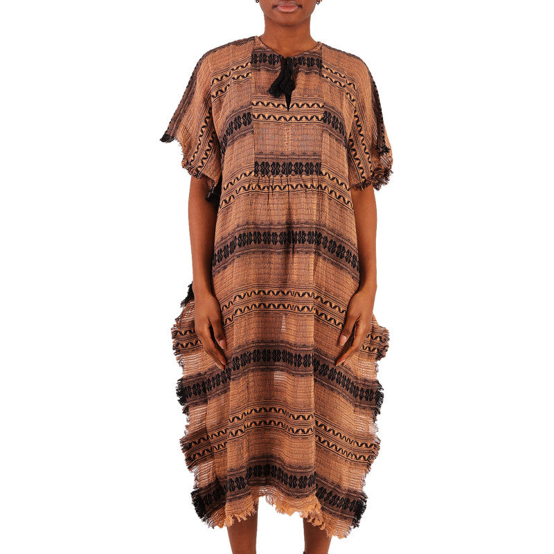 Dress, Leonie, kaftan, orange and black, patterned, side slits, internal lining.
