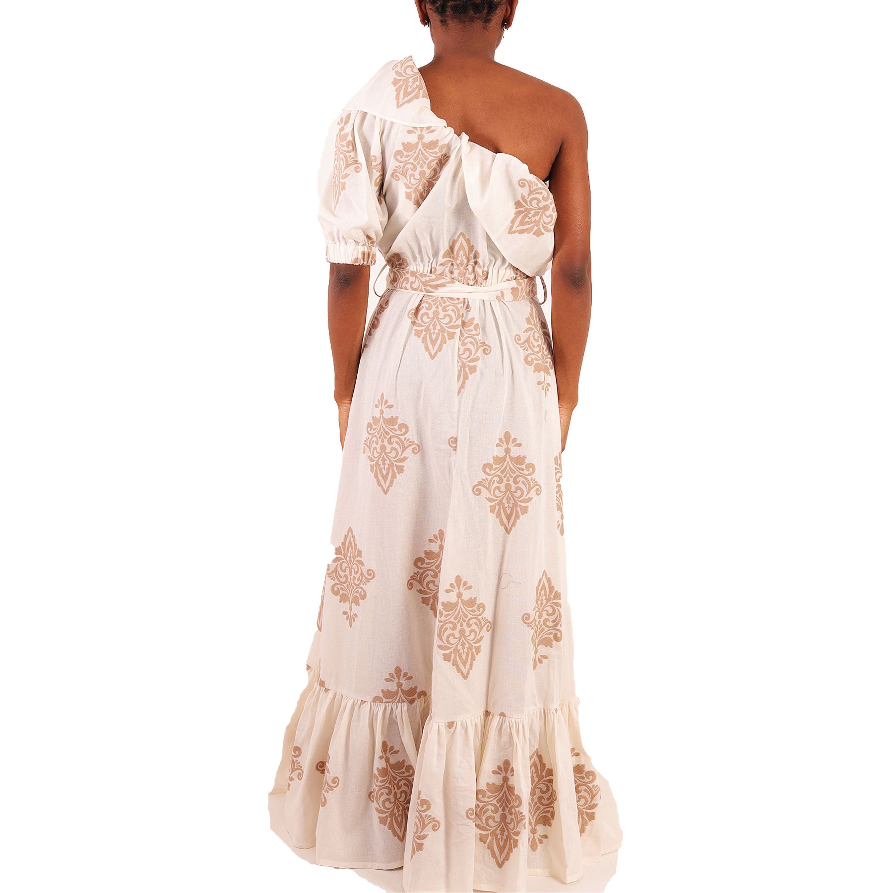 Dress, Lavi, long, cream-colored, with beige embroidery, one shoulder, with long sleeves, with a belt at the waist, in a cotton blend.