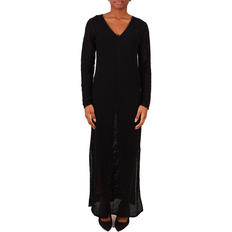 Notshy dress, long, black, openwork, V-neck, in a linen and cotton blend, with long sleeves and side slits.