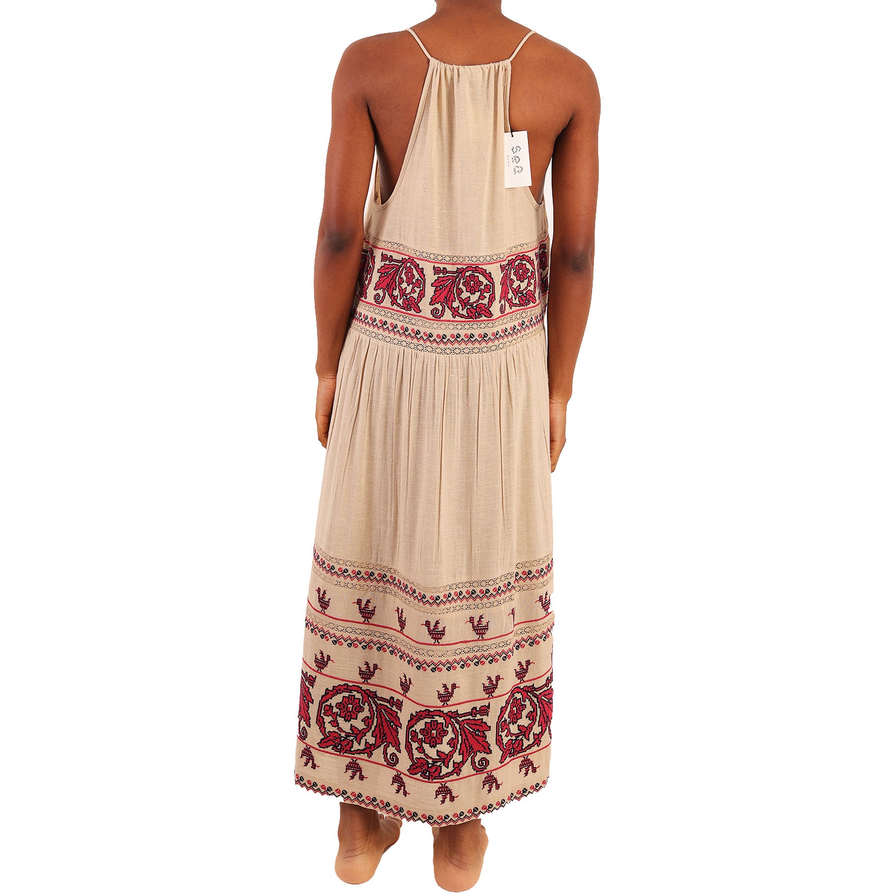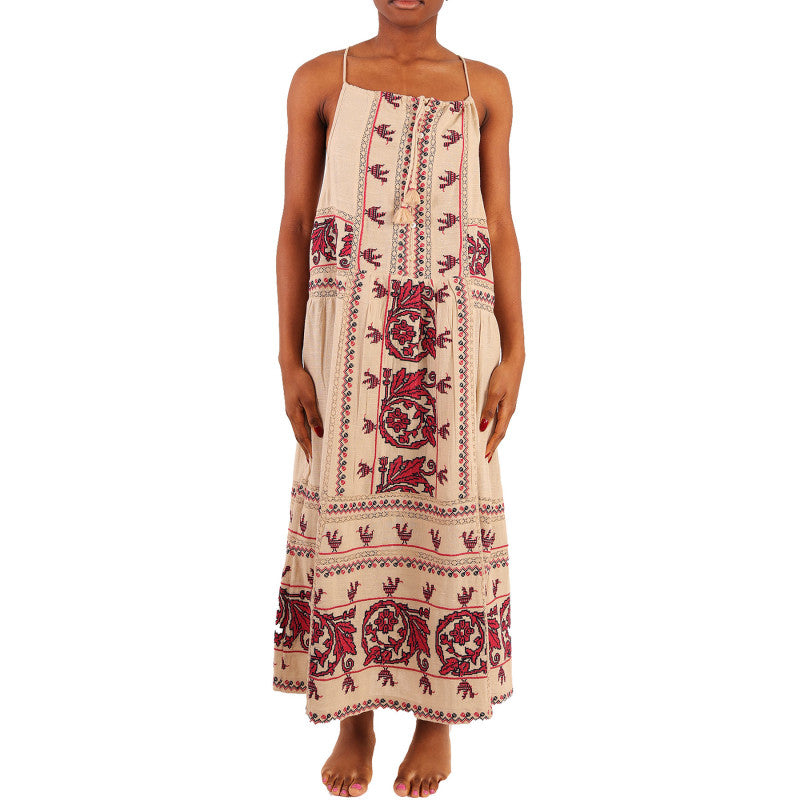 Dress, Sea New York, long, beige with red embroidery, openwork, sleeveless, in viscose and cotton.