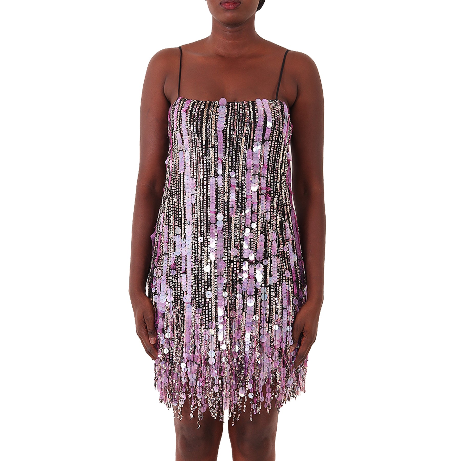 Amen dress, in sequins, black, silver and purple, with thin shoulder straps, sleeveless, side zip, fringes at the bottom