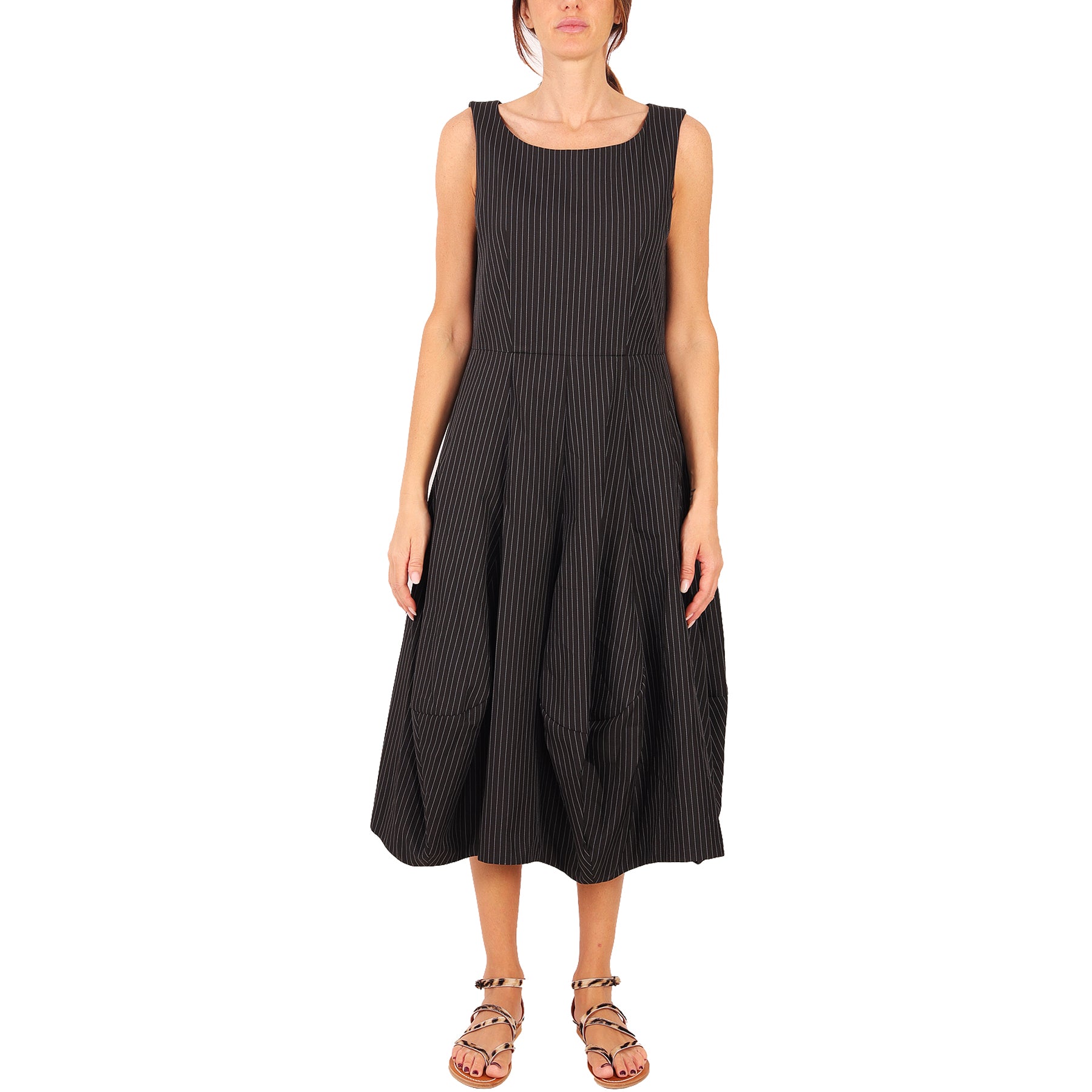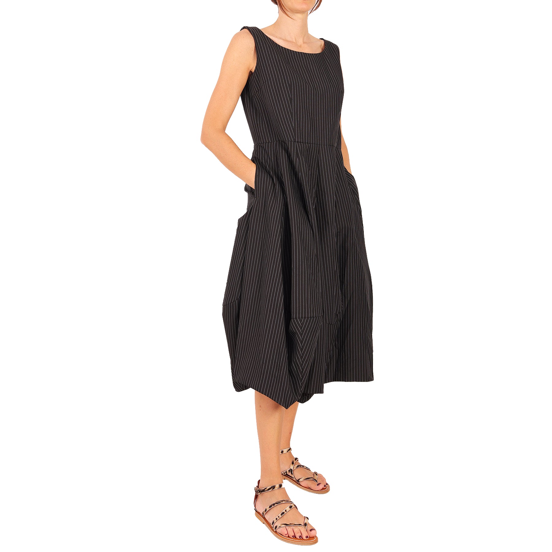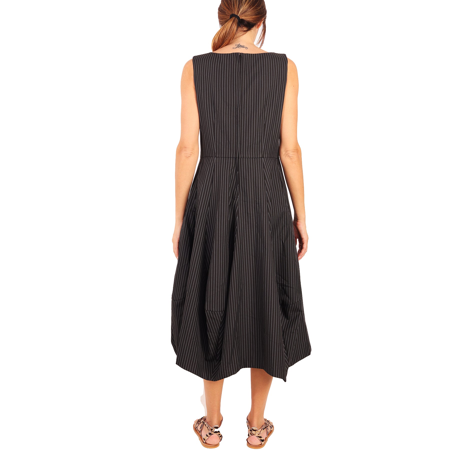Comme des Garçons dress, in polyester, black pinstripe, sleeveless, round neckline, full skirt, zip fastening on the back