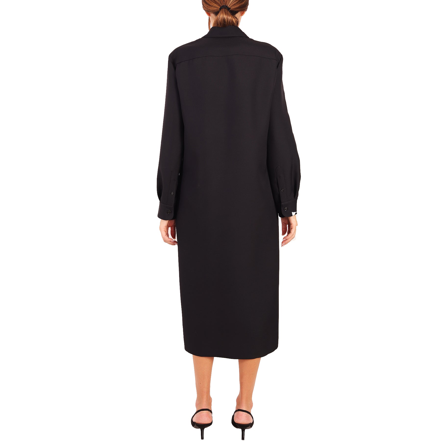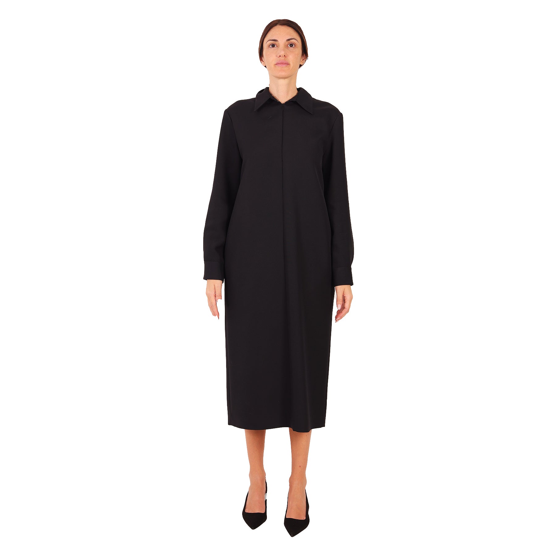 The Row dress, in wool and viscose, shirt style, long sleeves, front zip fastening