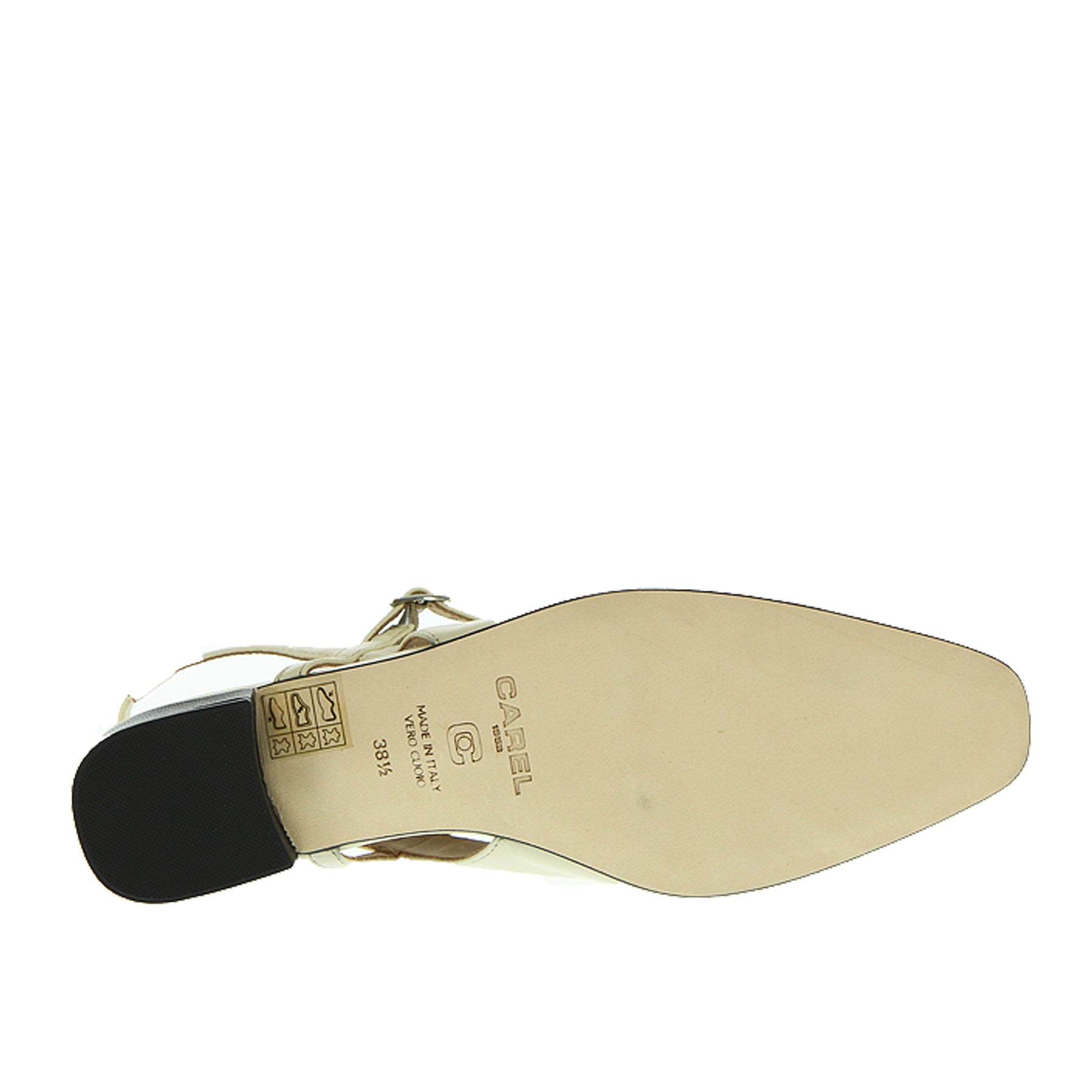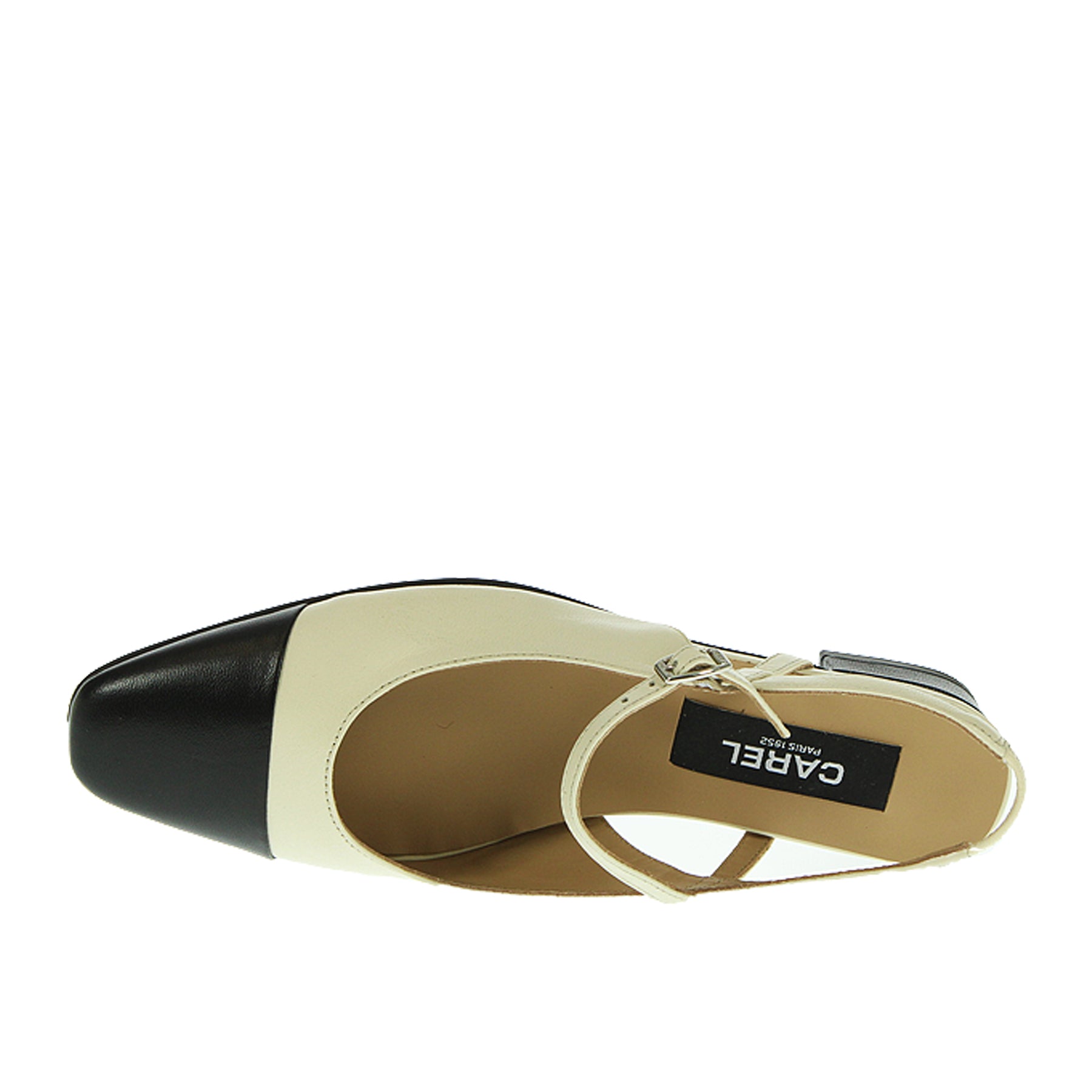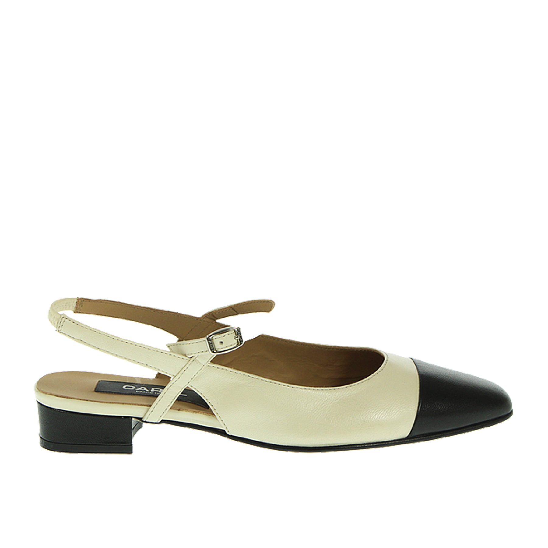 Carel ballerina, in leather, cream color, with black toe, ankle strap, leather sole