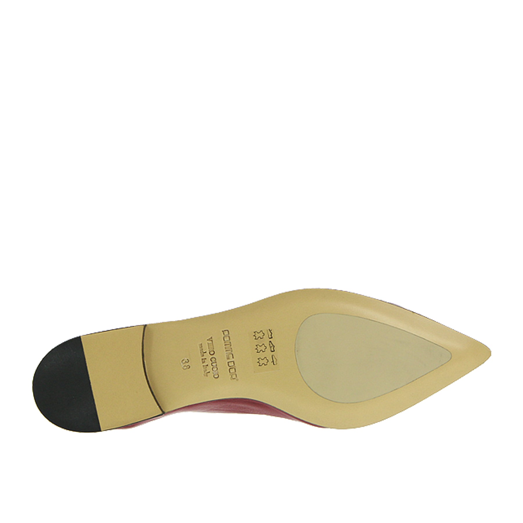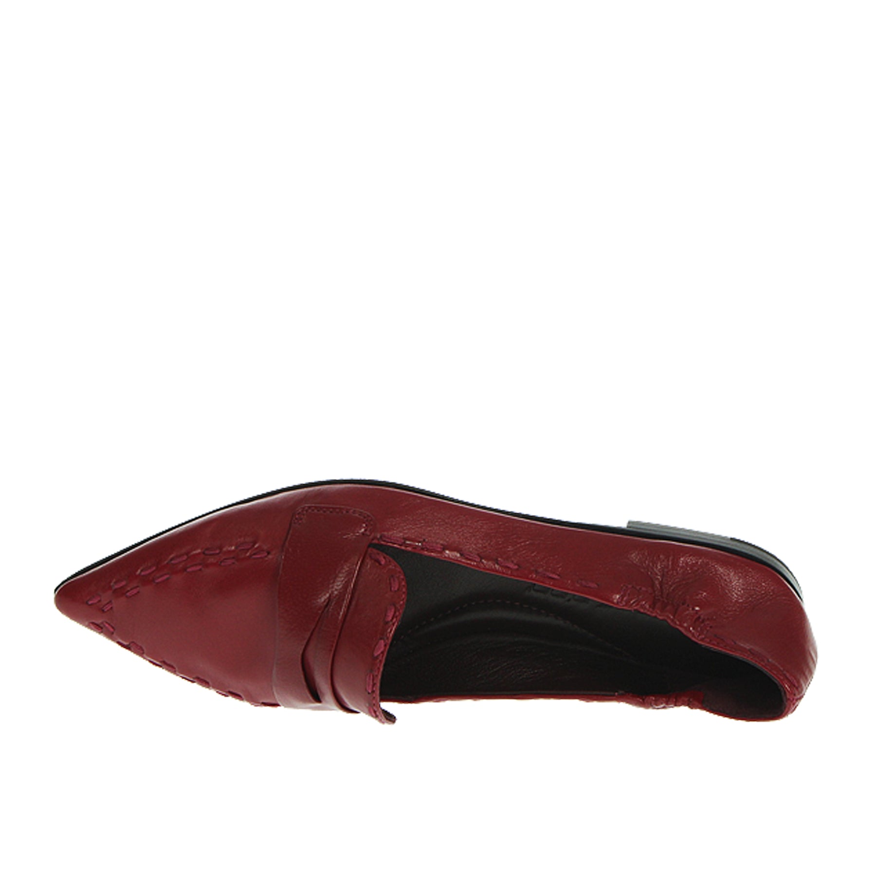 Ballerina in pelle, colore bordeaux, a punta, elastico al tallone, con cuciture in evidenza, suola in cuoio