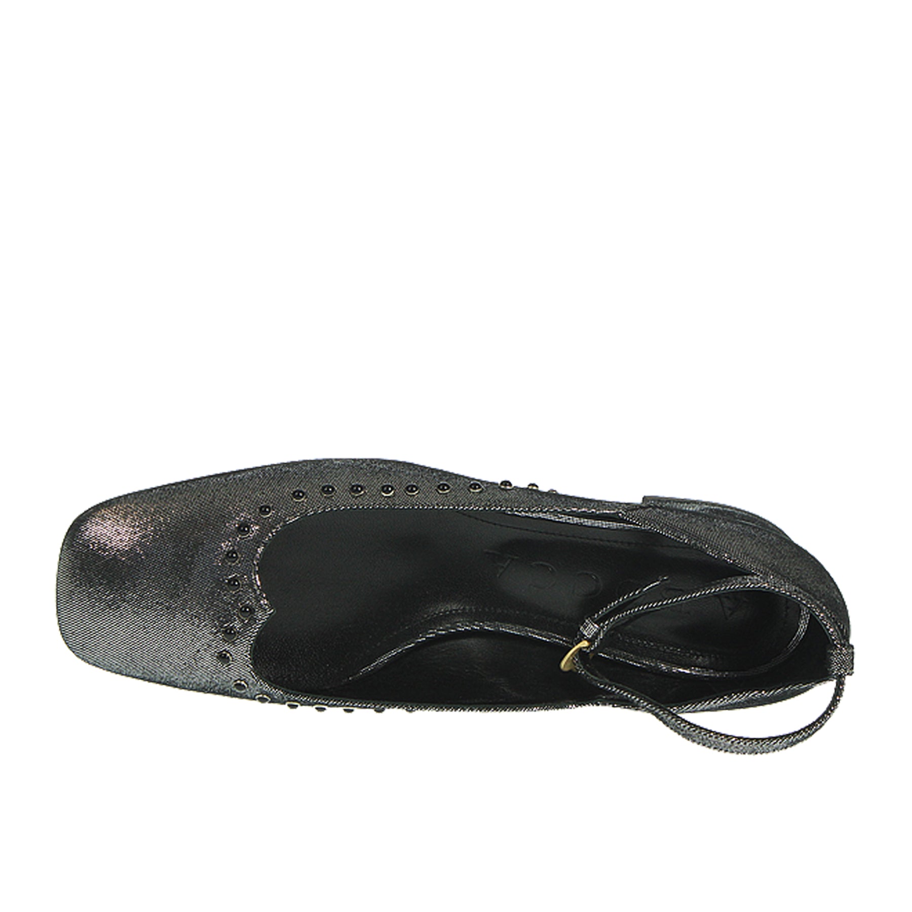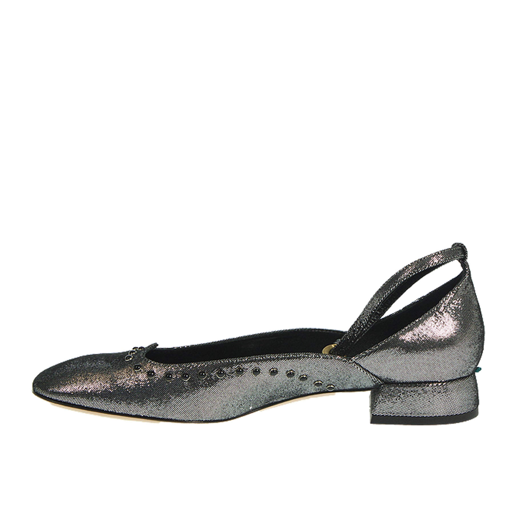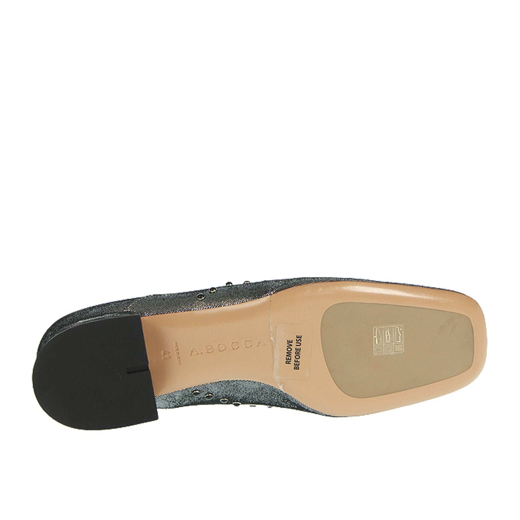 Ballerina A. Bocca, in tessuto, colore argento, con borchiette nere, con punta squadrata, con cinturino alla caviglia, suola in cuoio con inserto in gomma