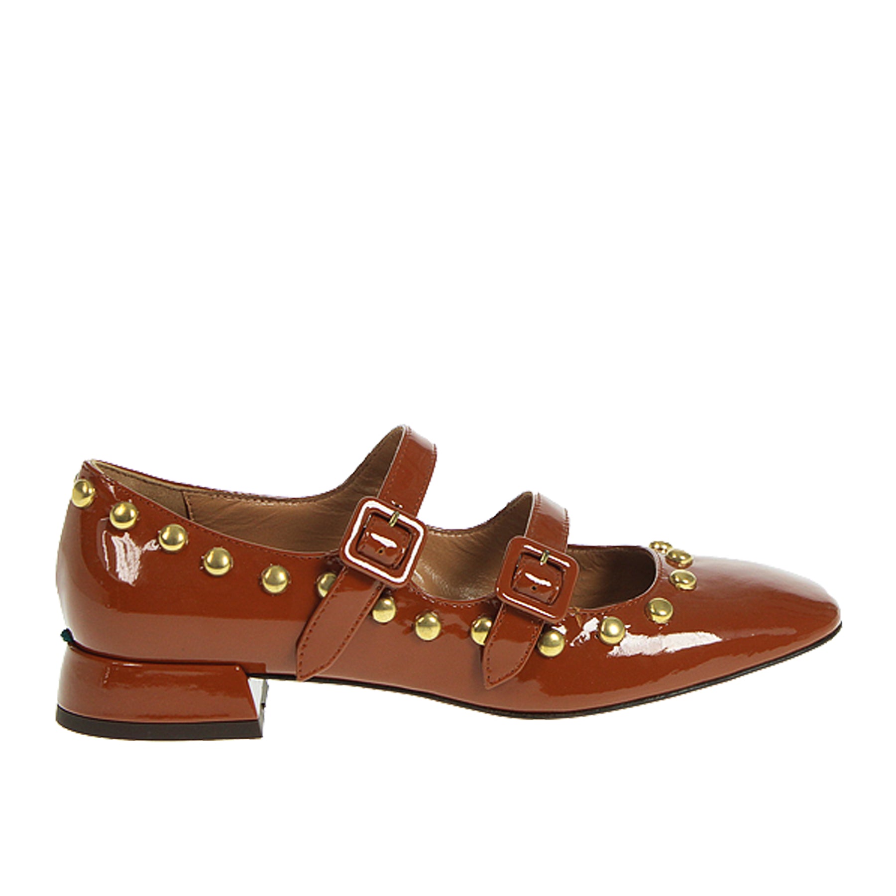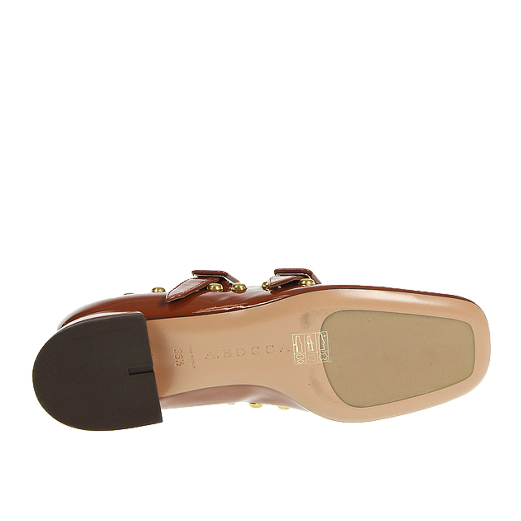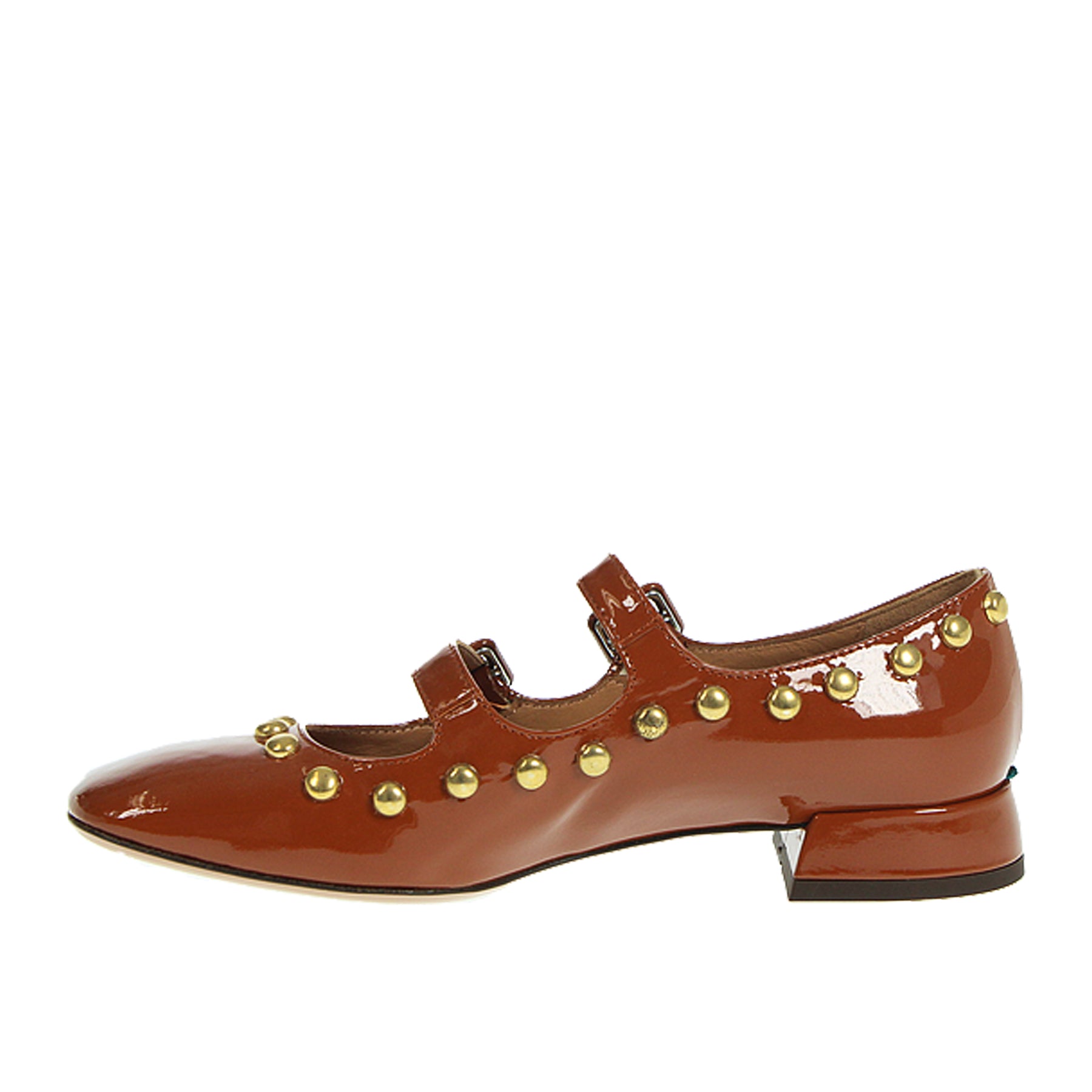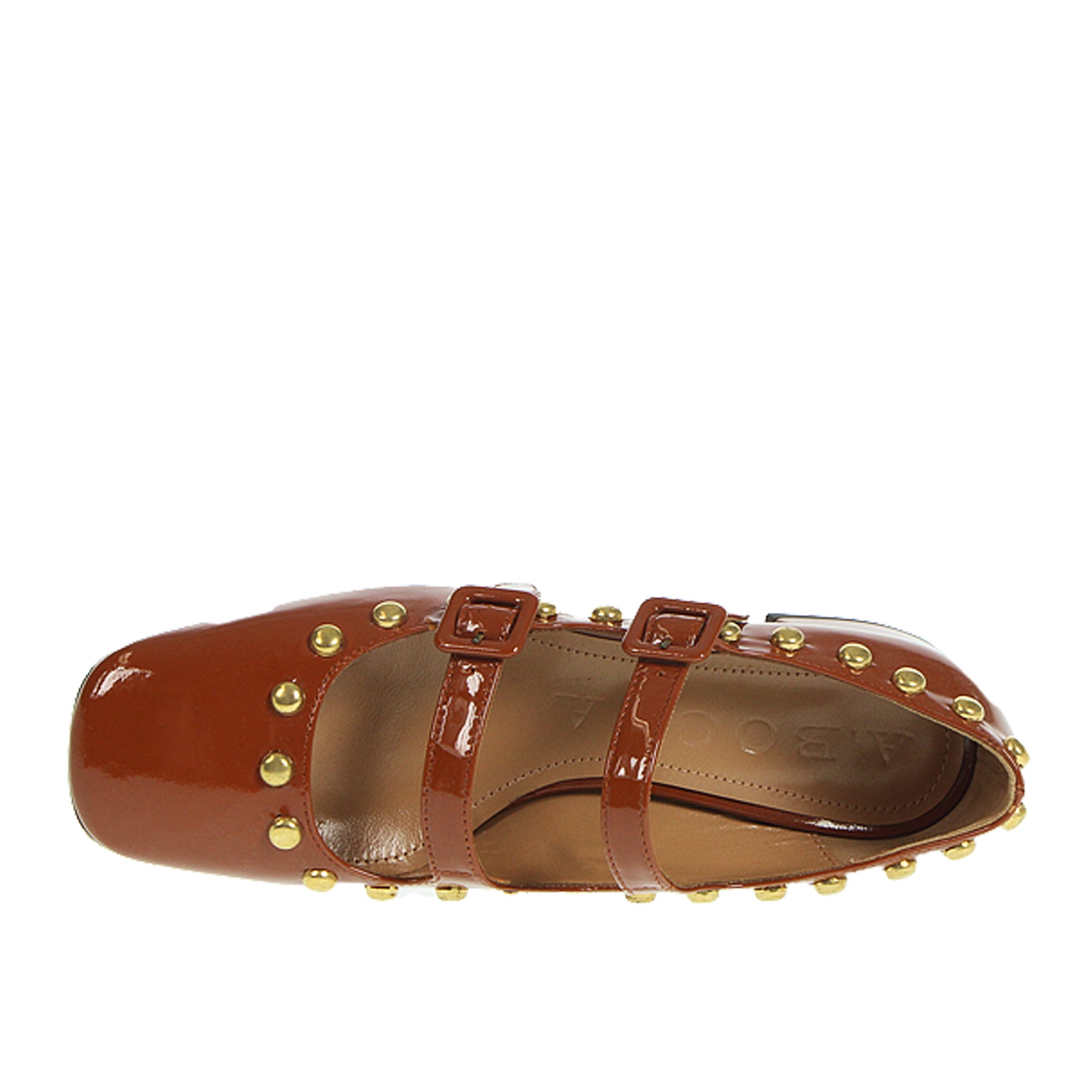 Ballerina A. Bocca, in vernice, colore marrone bruciato, con cinturini sul dorso, con borchie dorate, altezza tacco 2,5 cm, suola in cuoio con inserto in gomma