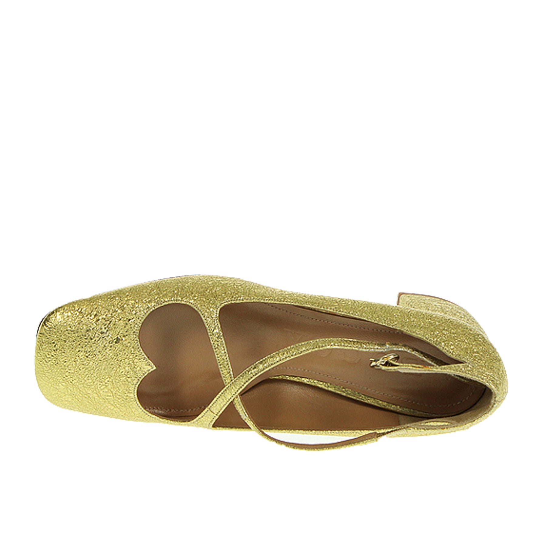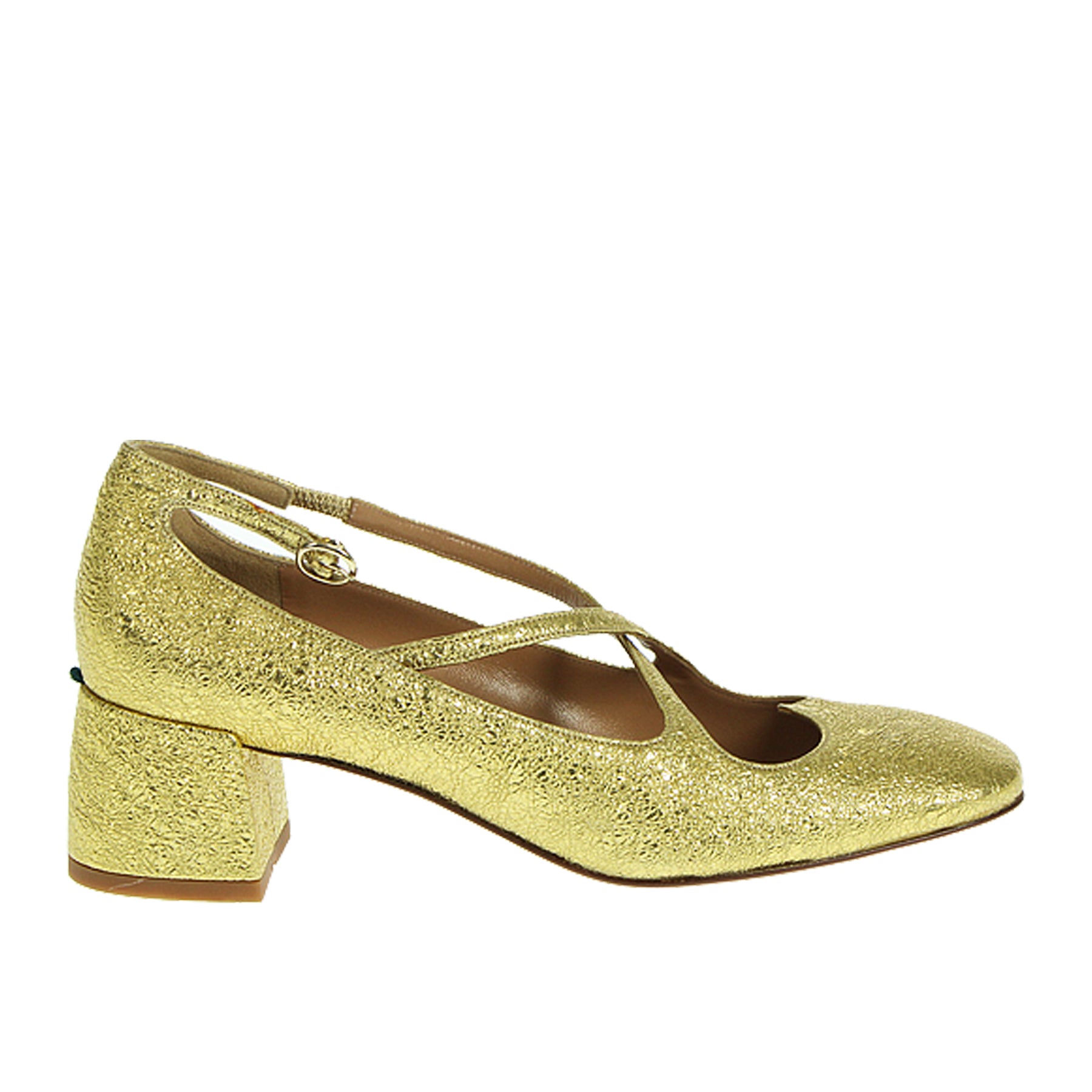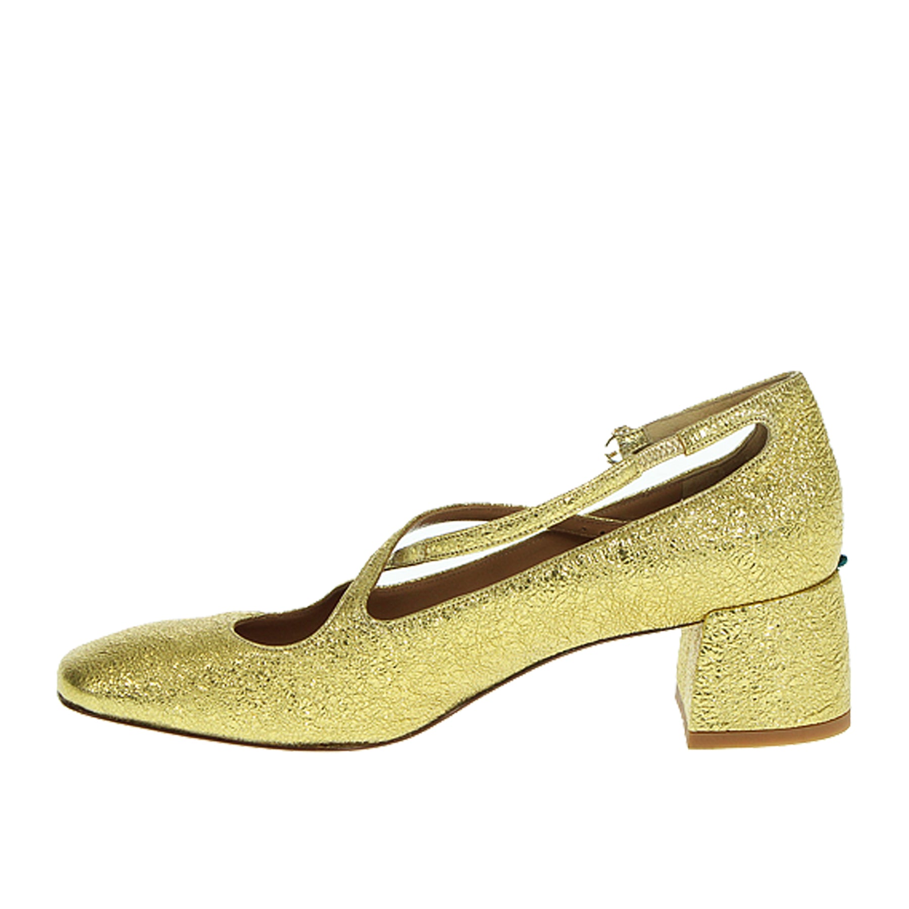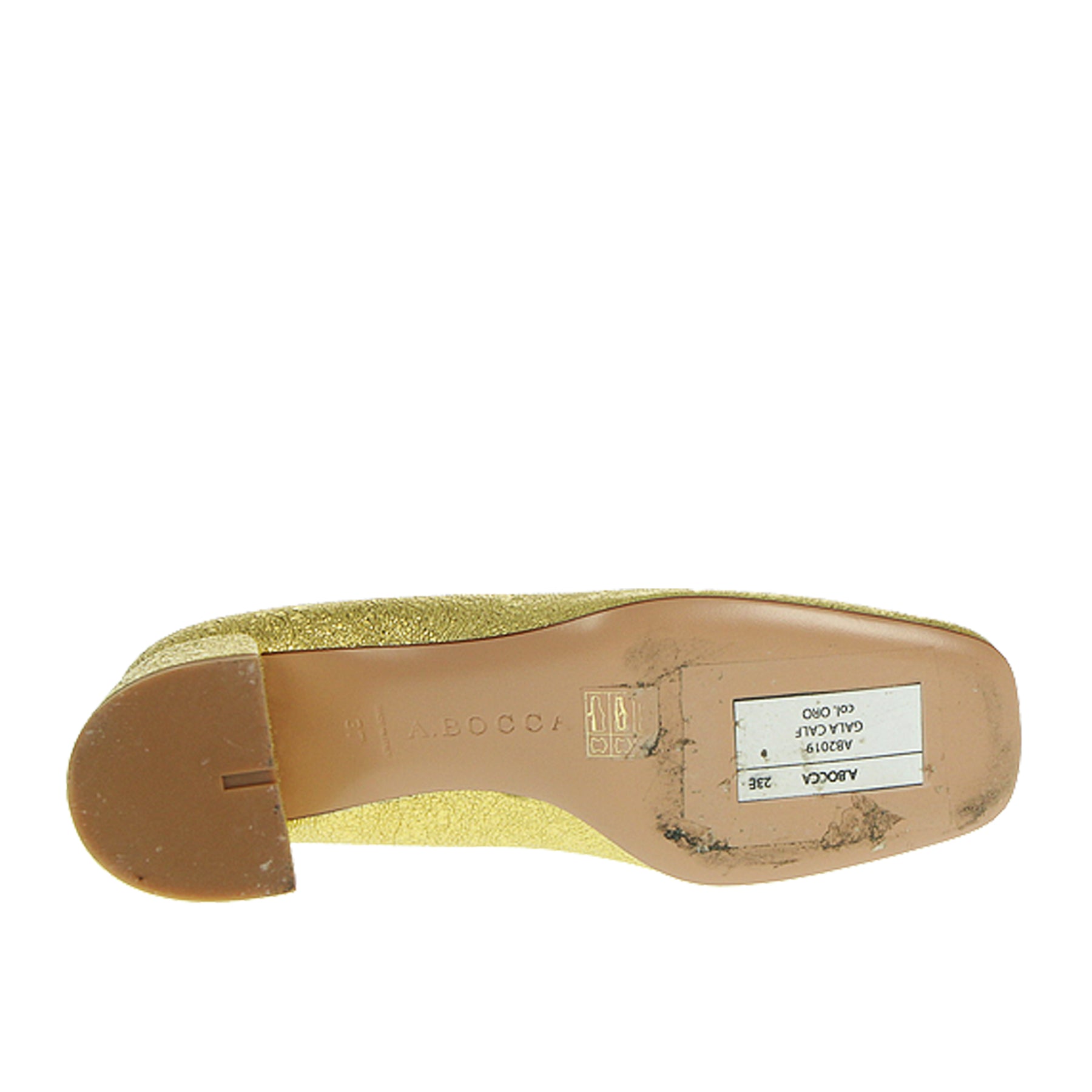 Ballerina A. Bocca, in pelle effetto stropicciato, oro, con cinturini ad incrocio sul dorso, altezza tacco 5 cm, suola in cuoio