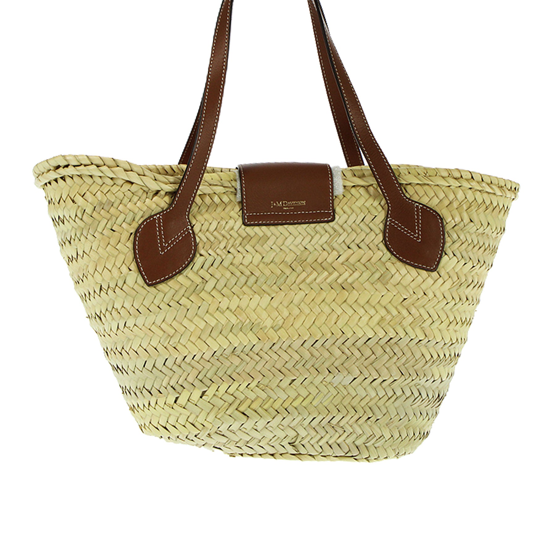 J&ampM Davidson medium basket bag in woven raffia with double brown leather handles and gold buckle closure.