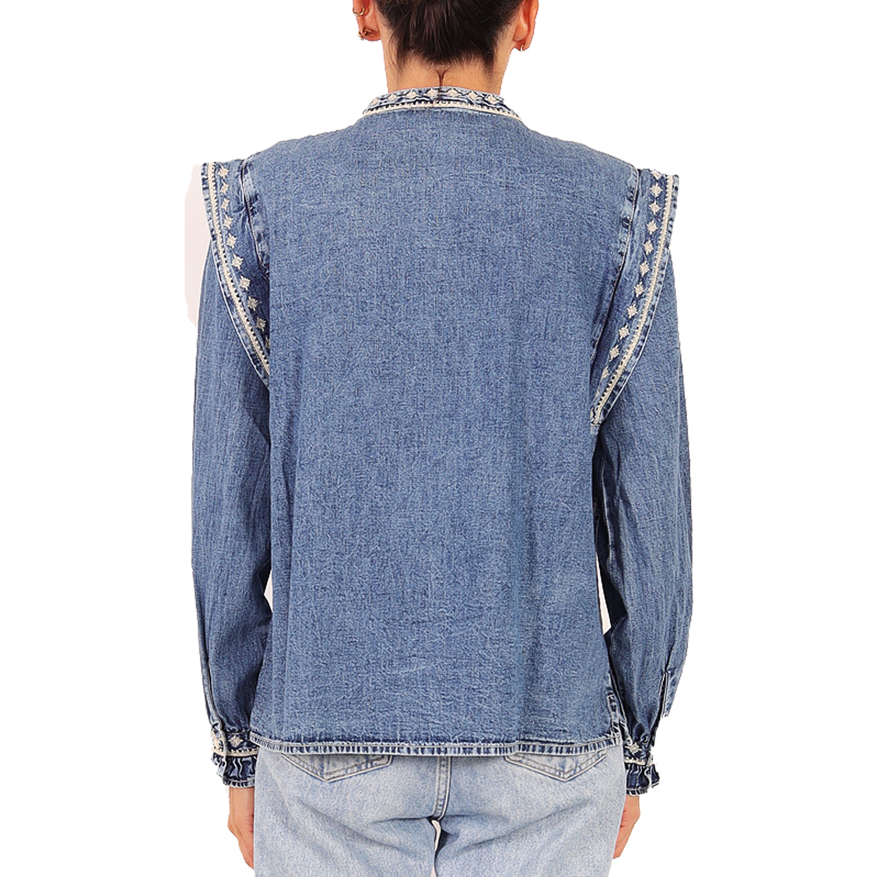 Camicia Maison Hotel, in denim, azzurra, con ricami panna, chiusura con bottoni automatici, con maniche a sbuffo