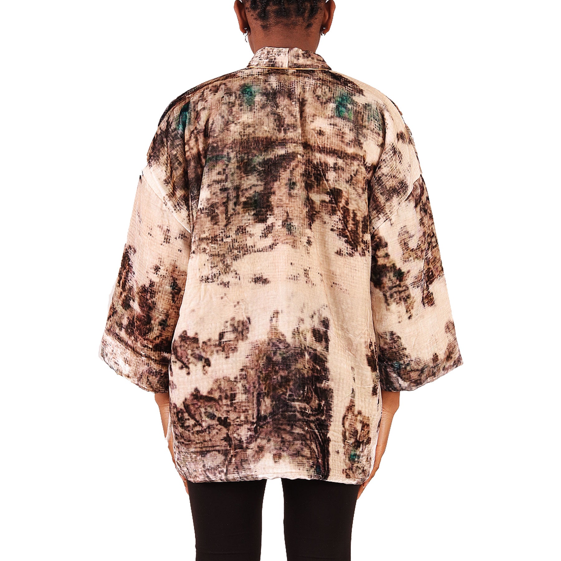 Kimono, Mes Demoiselles, in velvet, patterned, beige and black, tied at the front, with pockets.