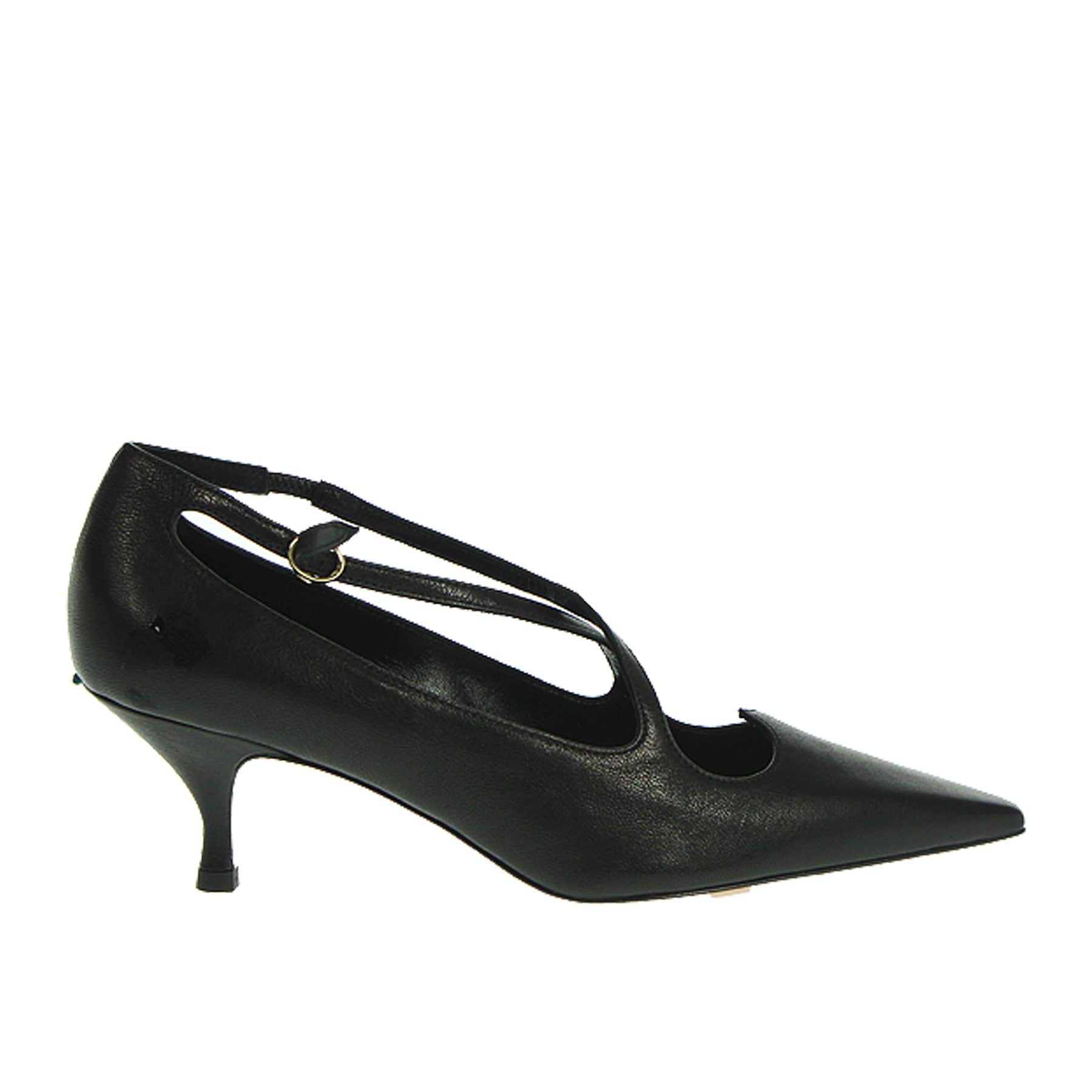Decolletè a punta A.Bocca, in pelle nera, con cinturini intrecciati sul dorso, tacco kitten, altezza tacco 6 cm, suola in cuoio con inserto in gomma