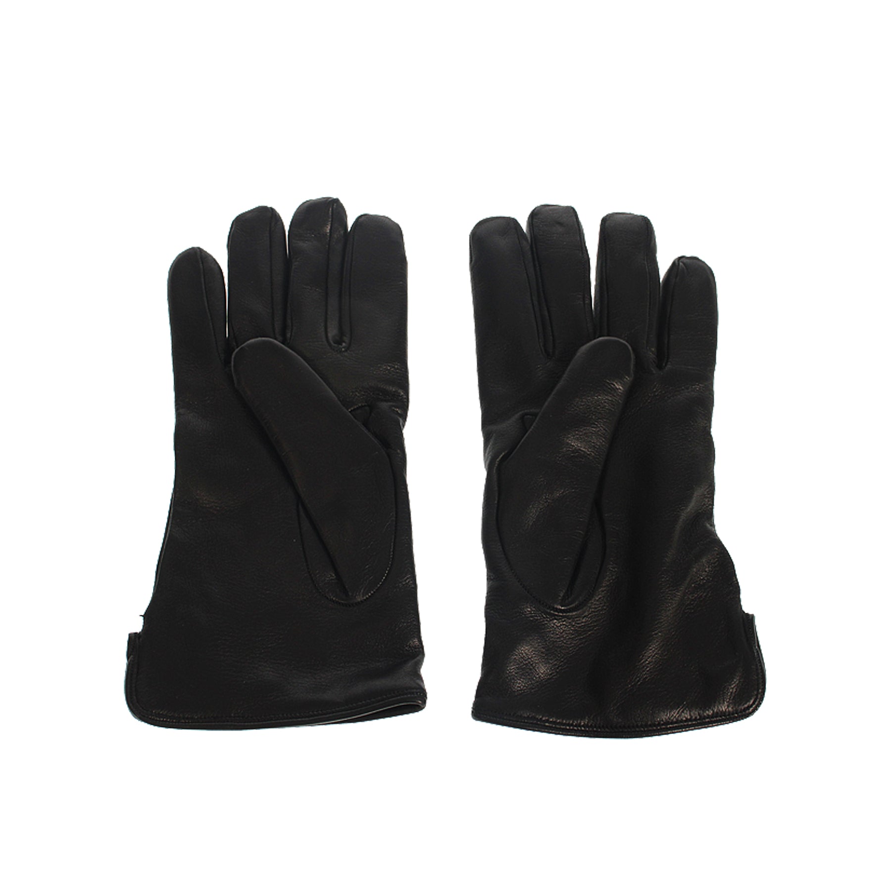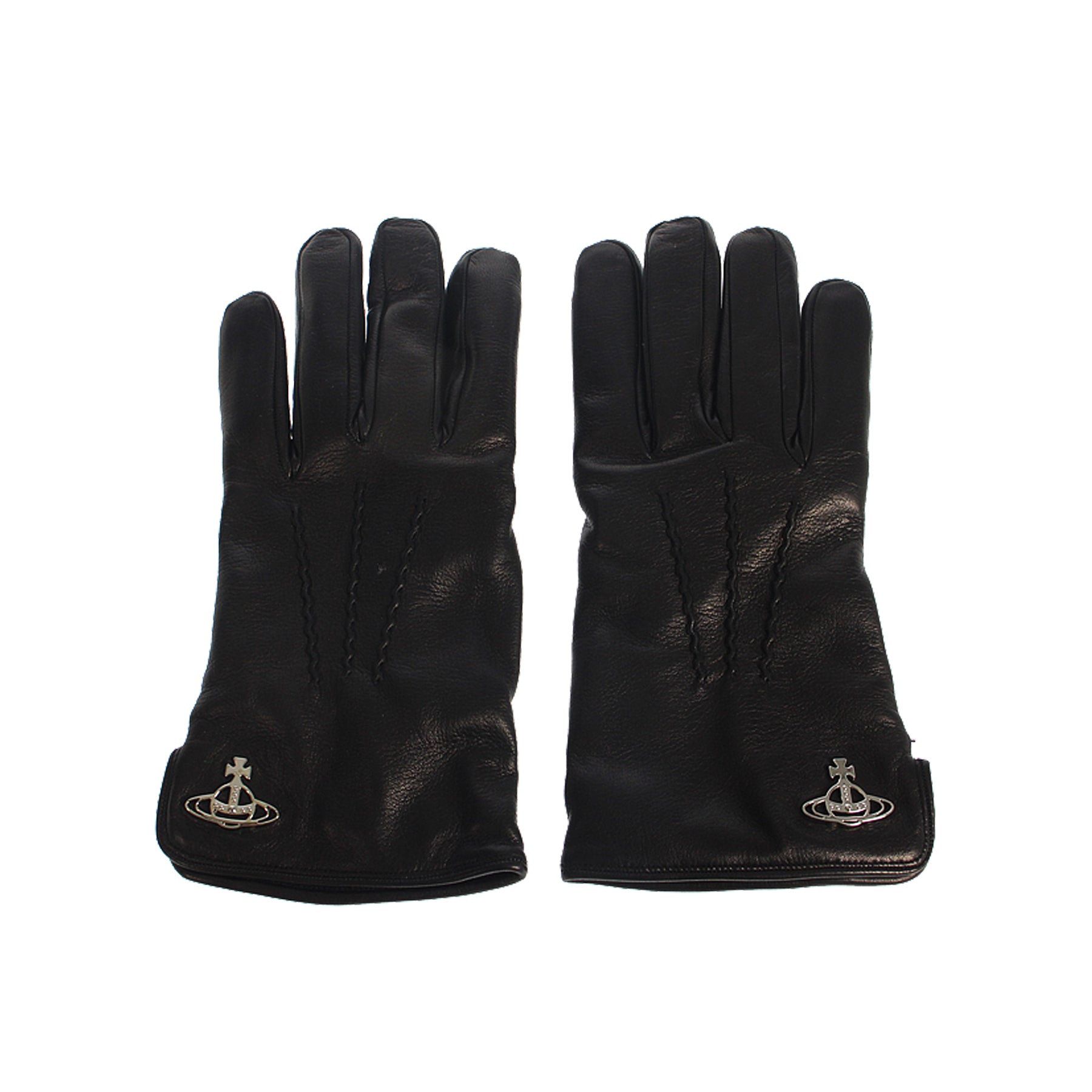 Guanti in pelle Vivienne Westwood, colore nero, interno in lana, cuciture ricamo sul dorso, strobo argento applicato, retail € 240,00