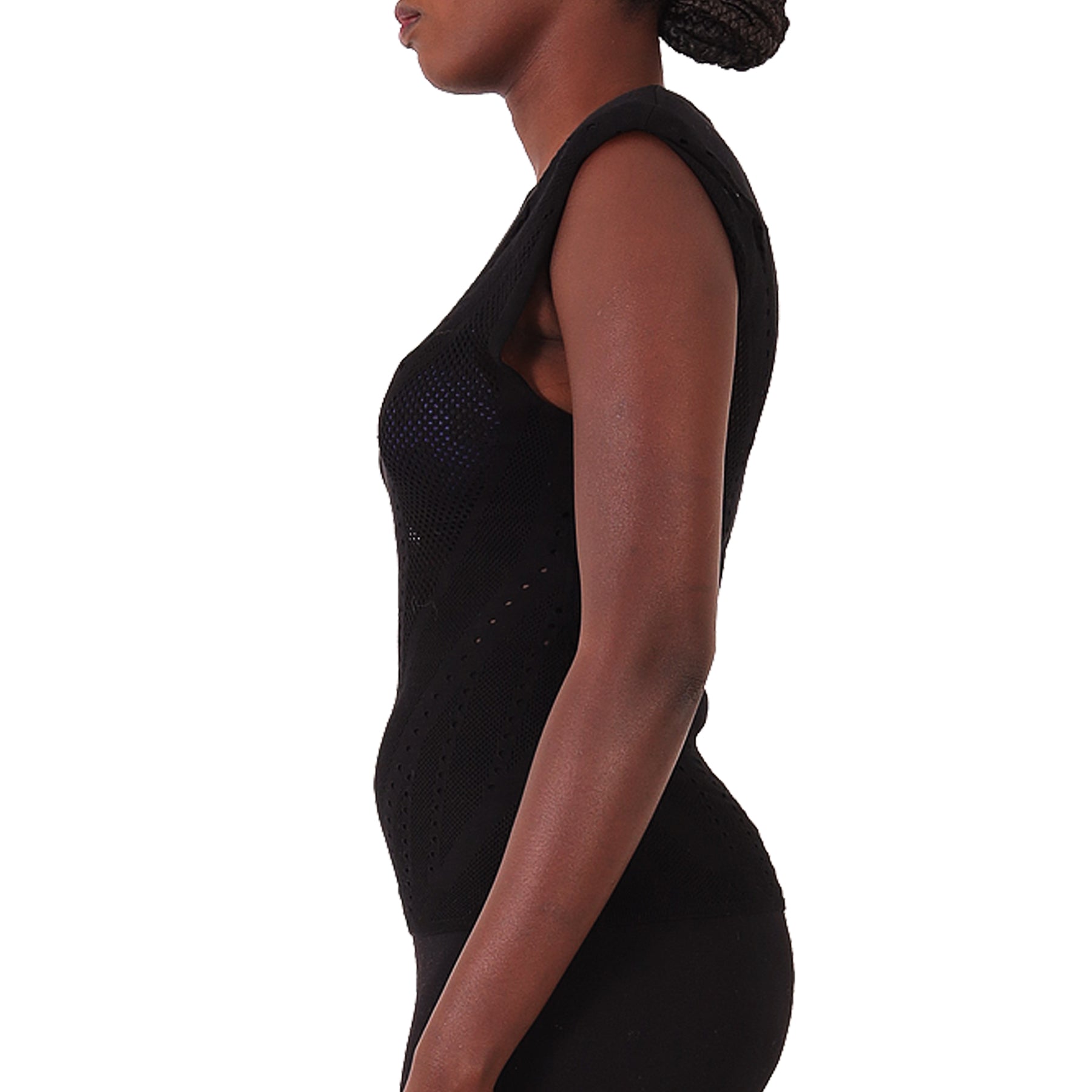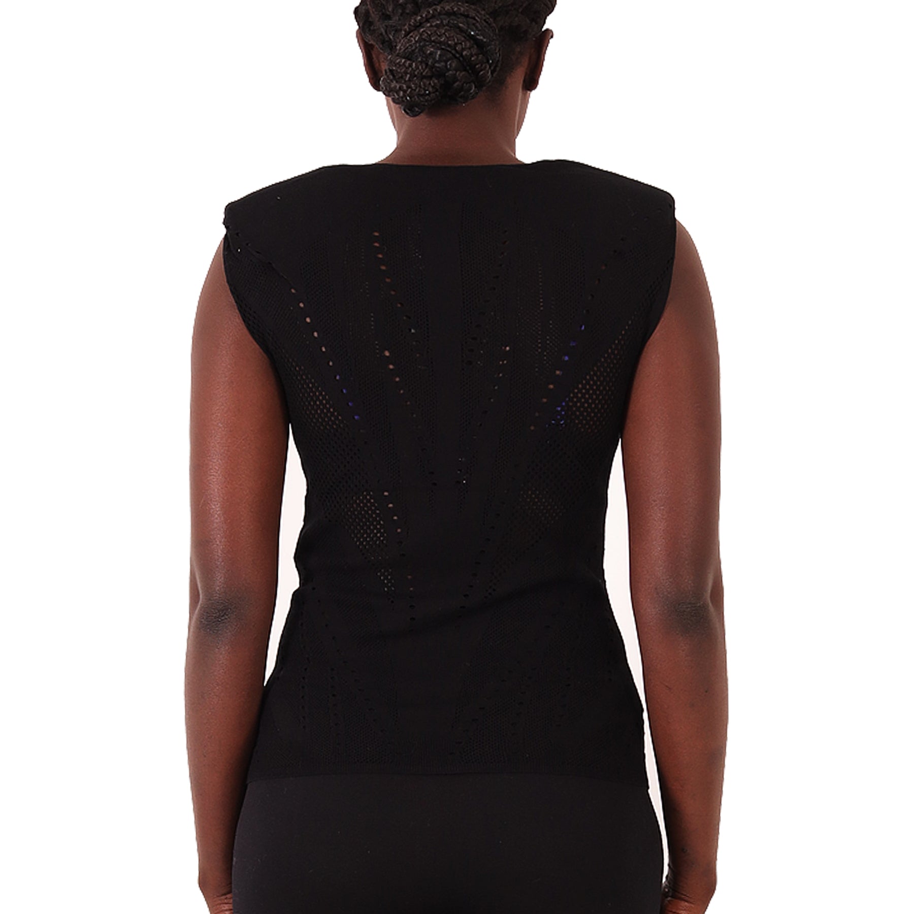 Mes Demoiselles black sleeveless top with padded shoulders, perforated, round neckline