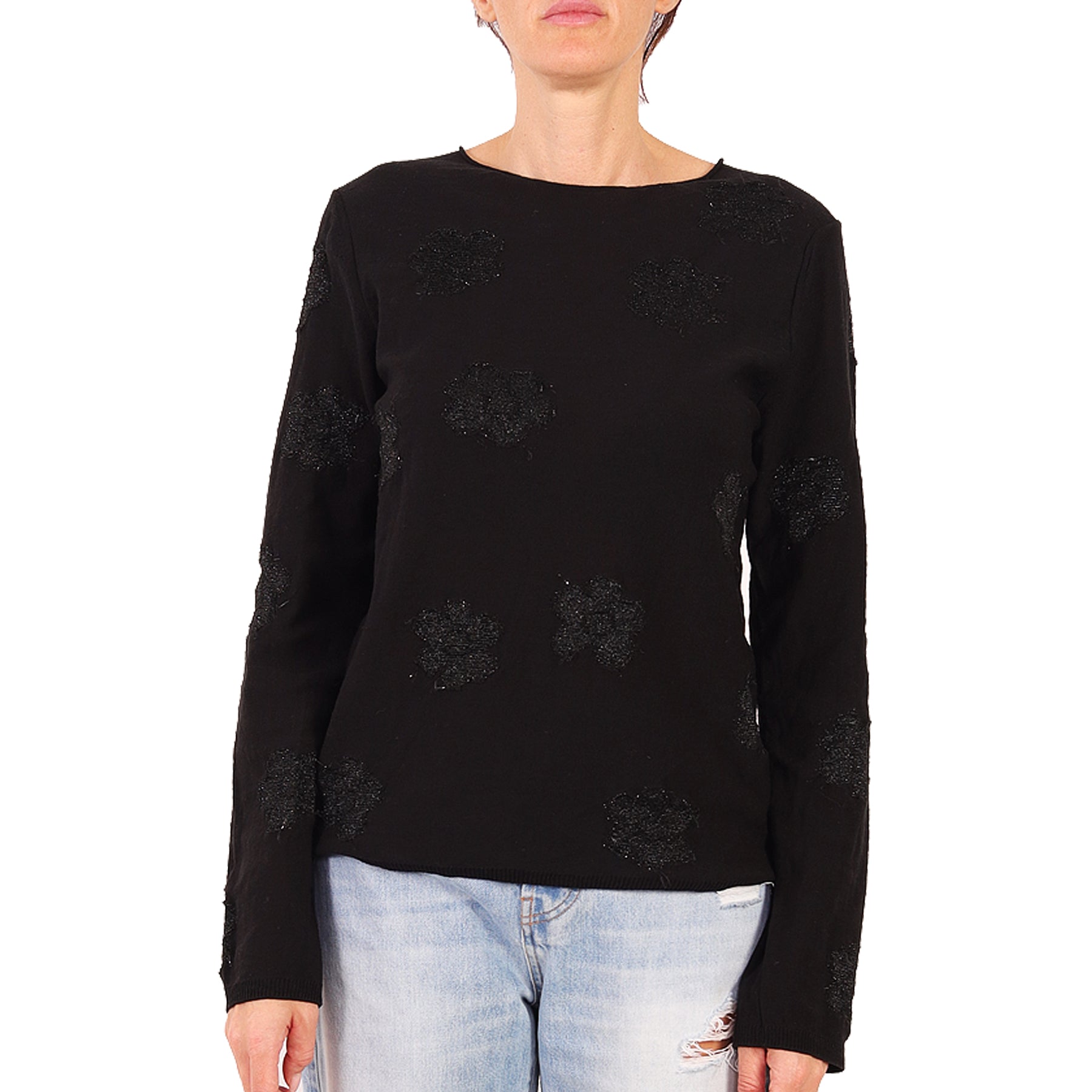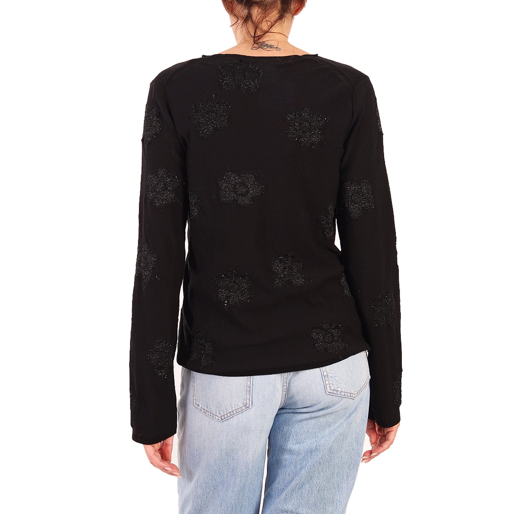 Comme des Garçons sweater, in acrylic and polyester, black, with tone-on-tone flowers, round neckline with raw cut, long sleeves