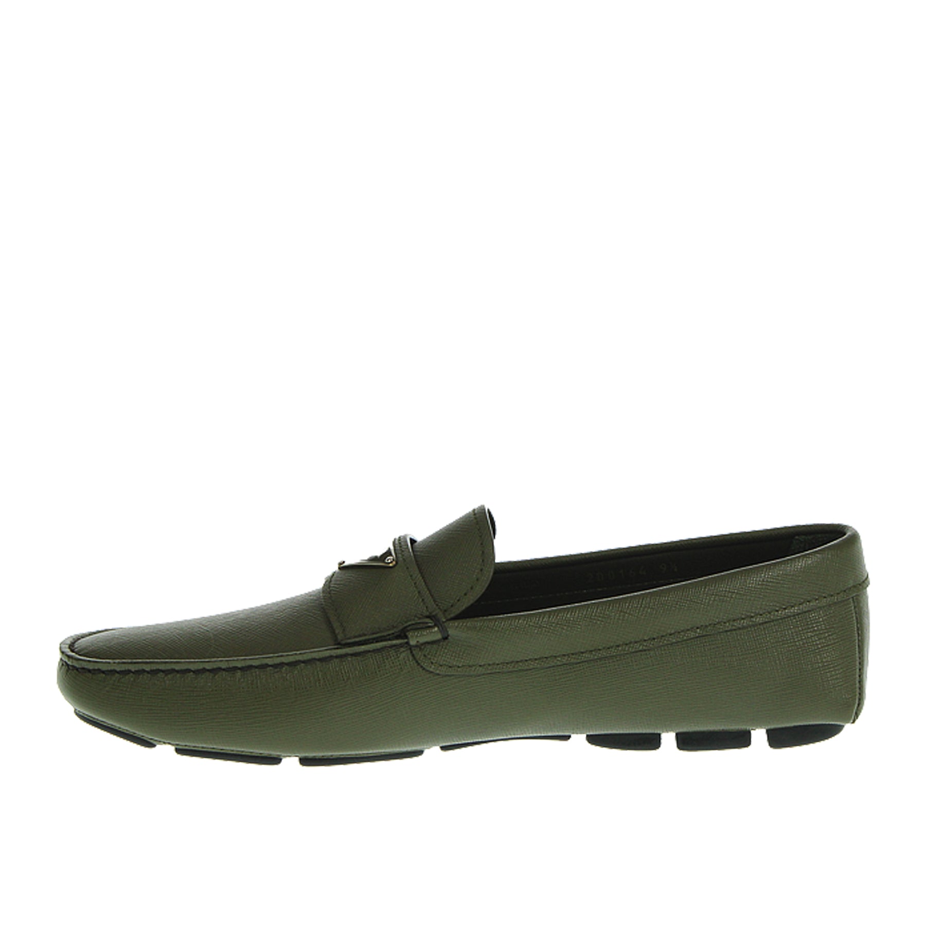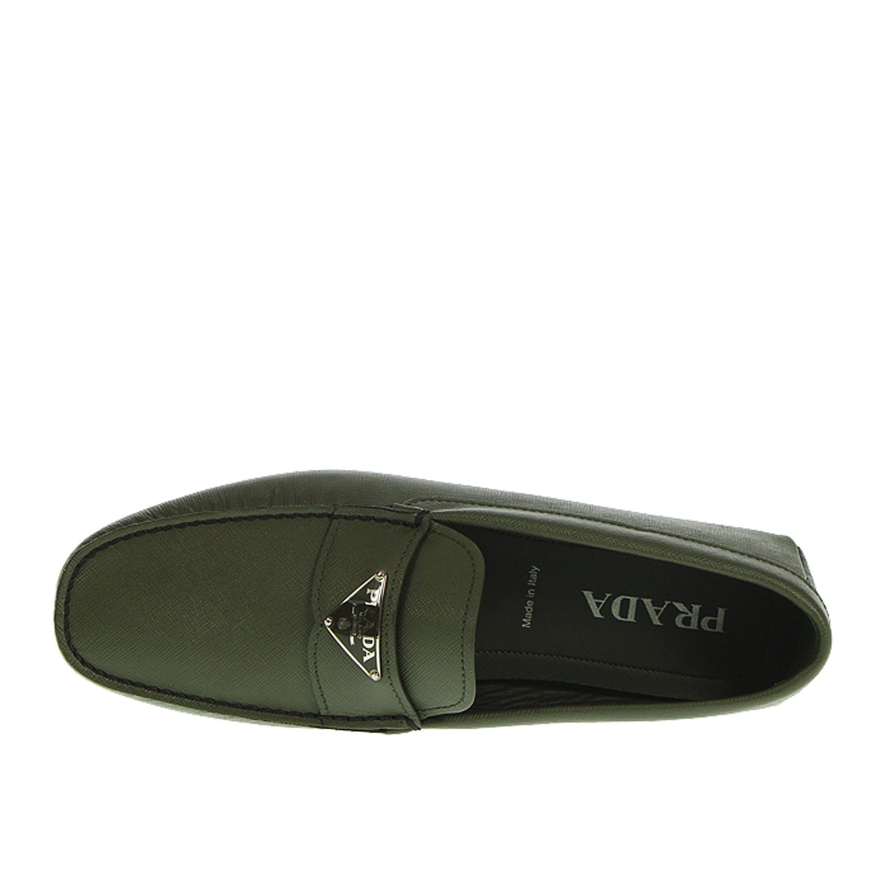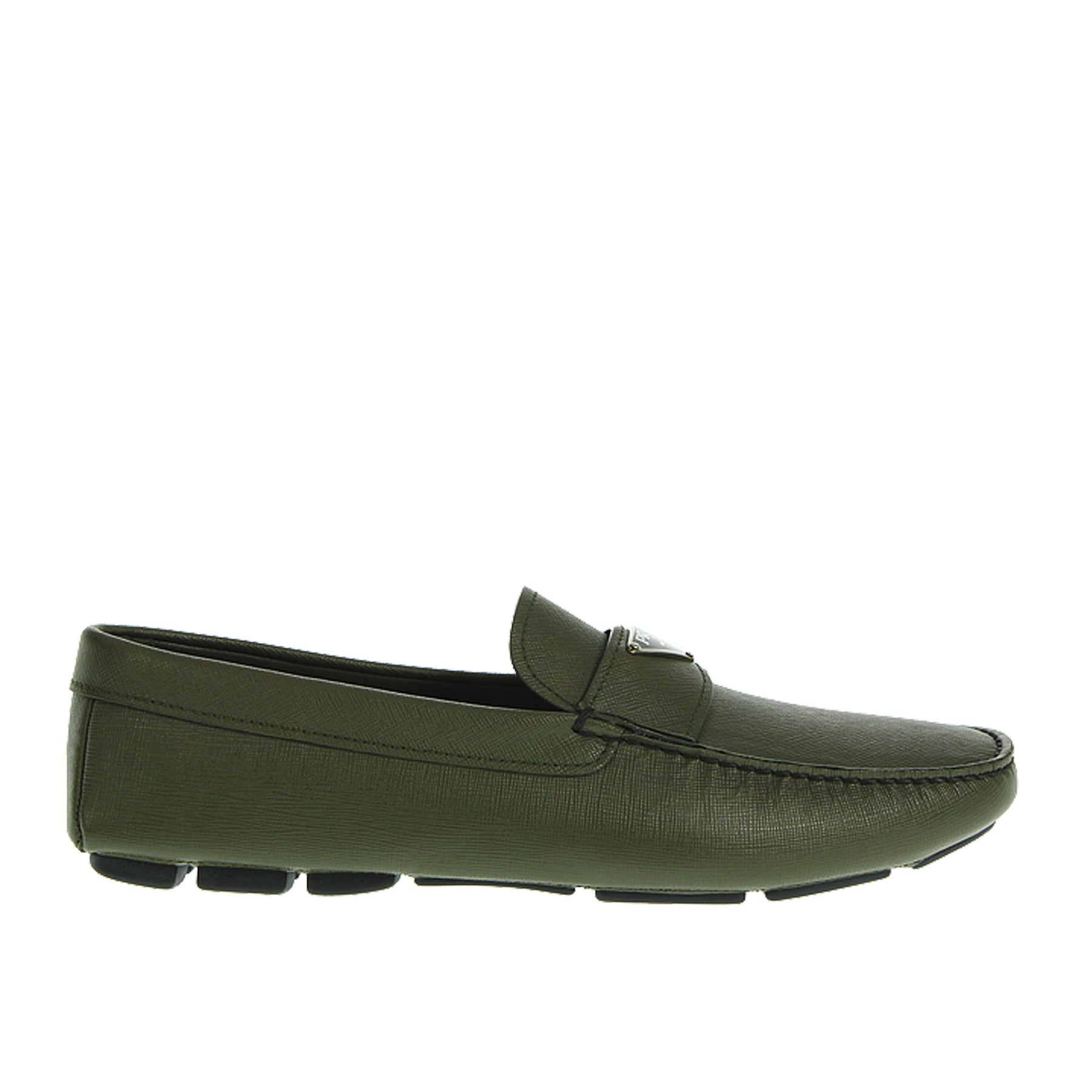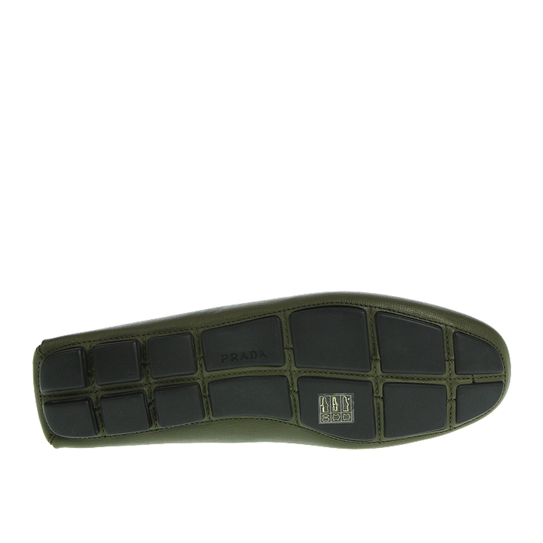 Mocassino Prada, in pelle saffiano, colore verde militare, con targhetta con logo sul davanti, suola in gomma