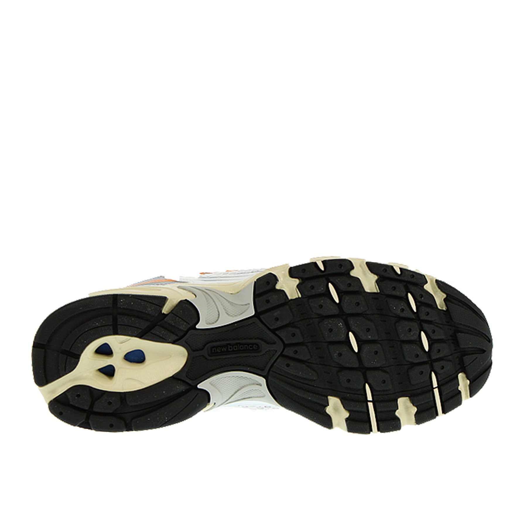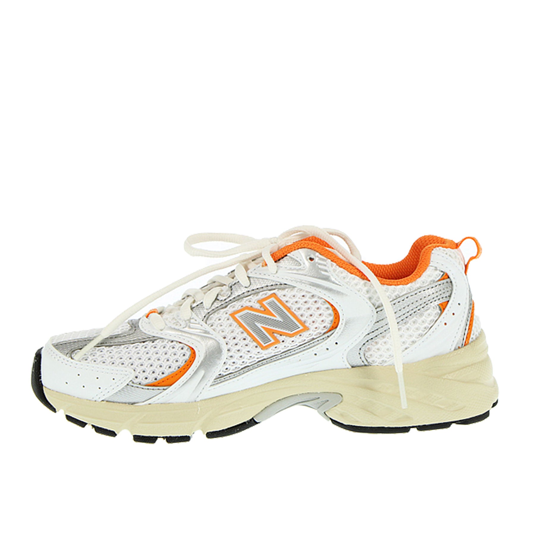 Sneakers, New Balance, model MR530EB, in fabric, white color, with silver and orange details, silver rubber logo on the side, with laces, rubber sole.