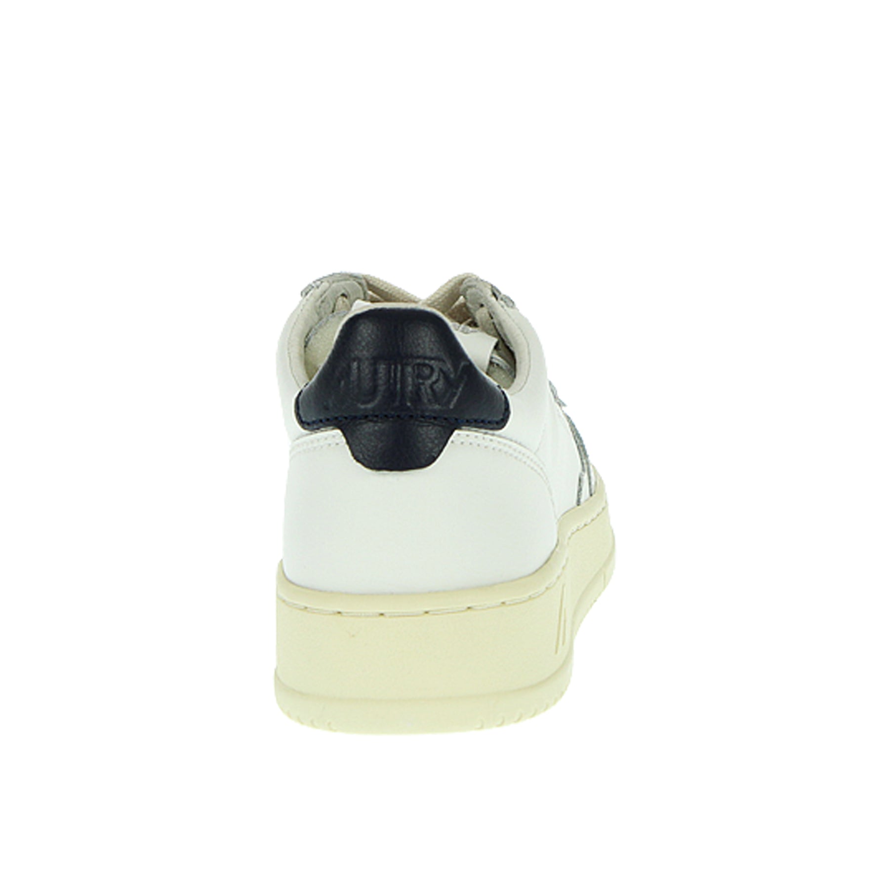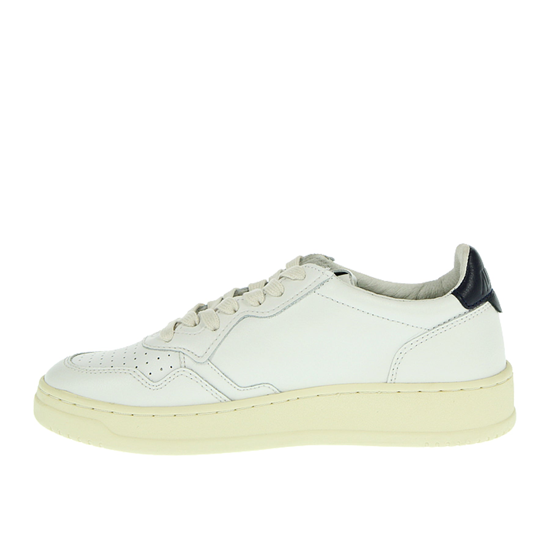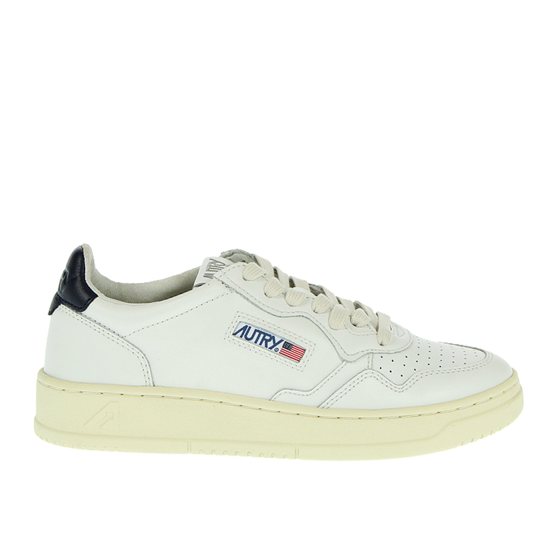 Autry Medalist sneakers in white leather with dark blue heel tab, laces, rubber sole, side logo