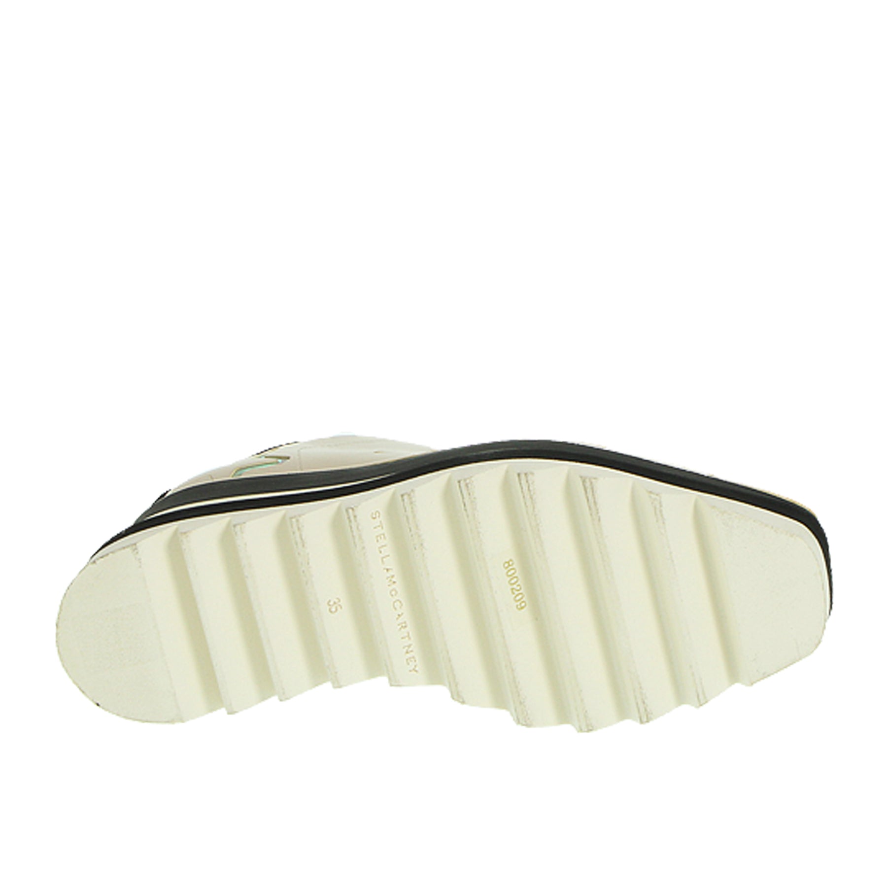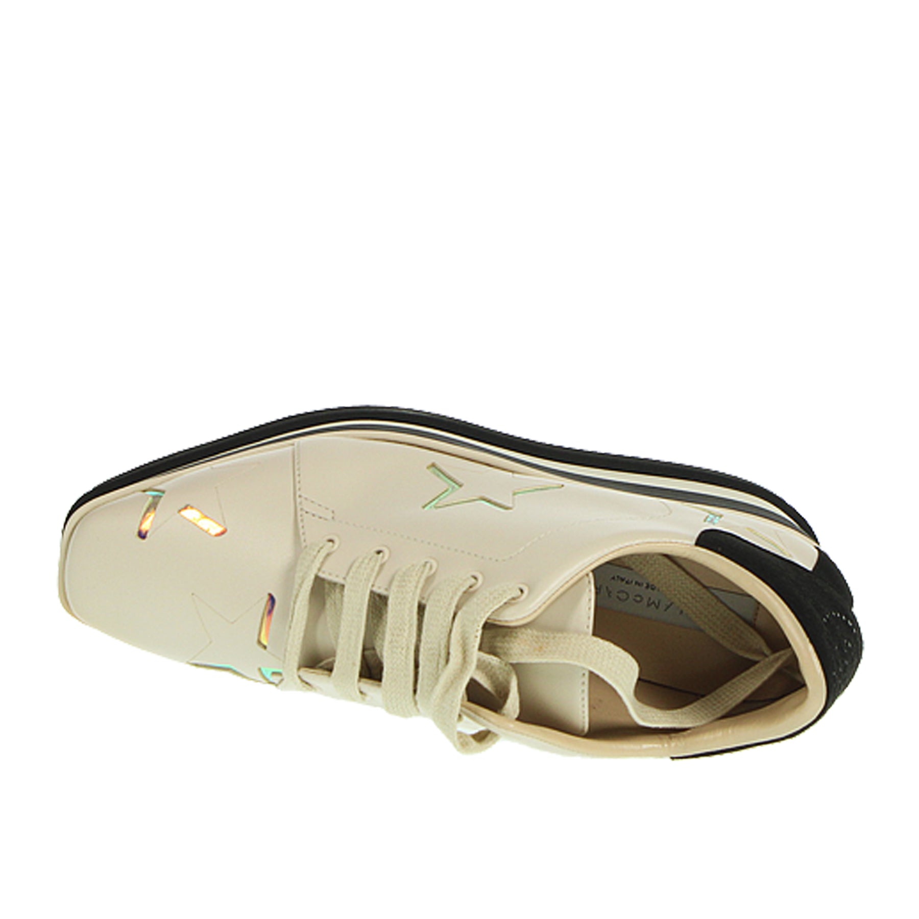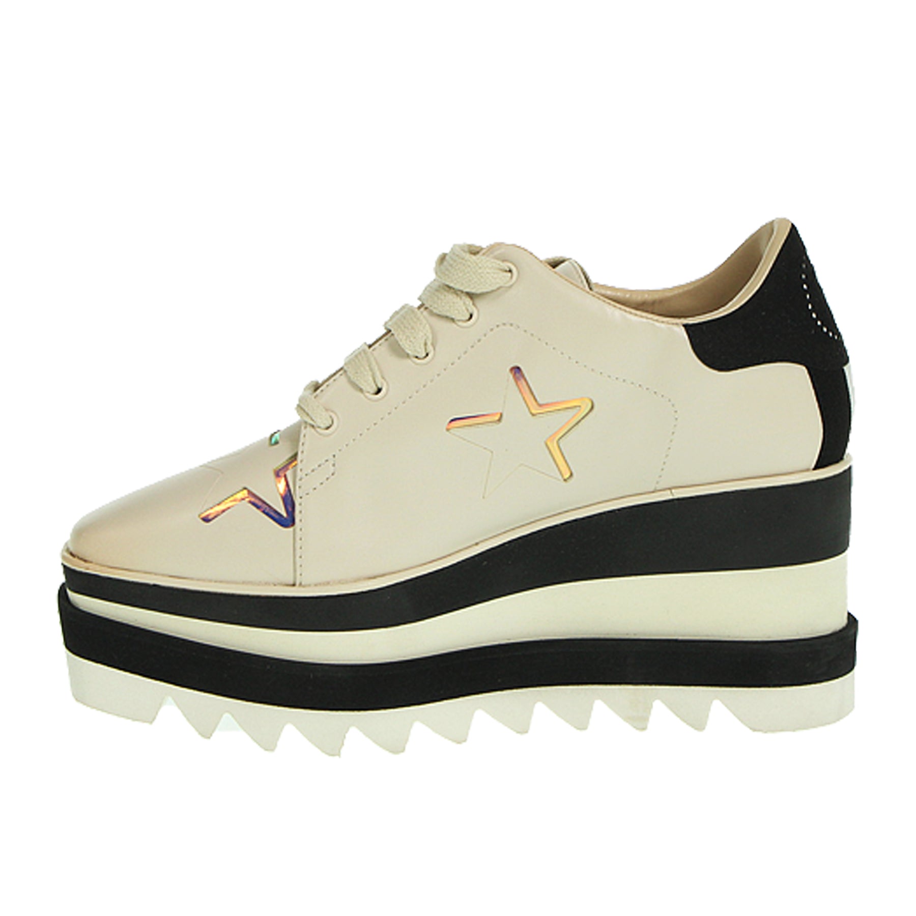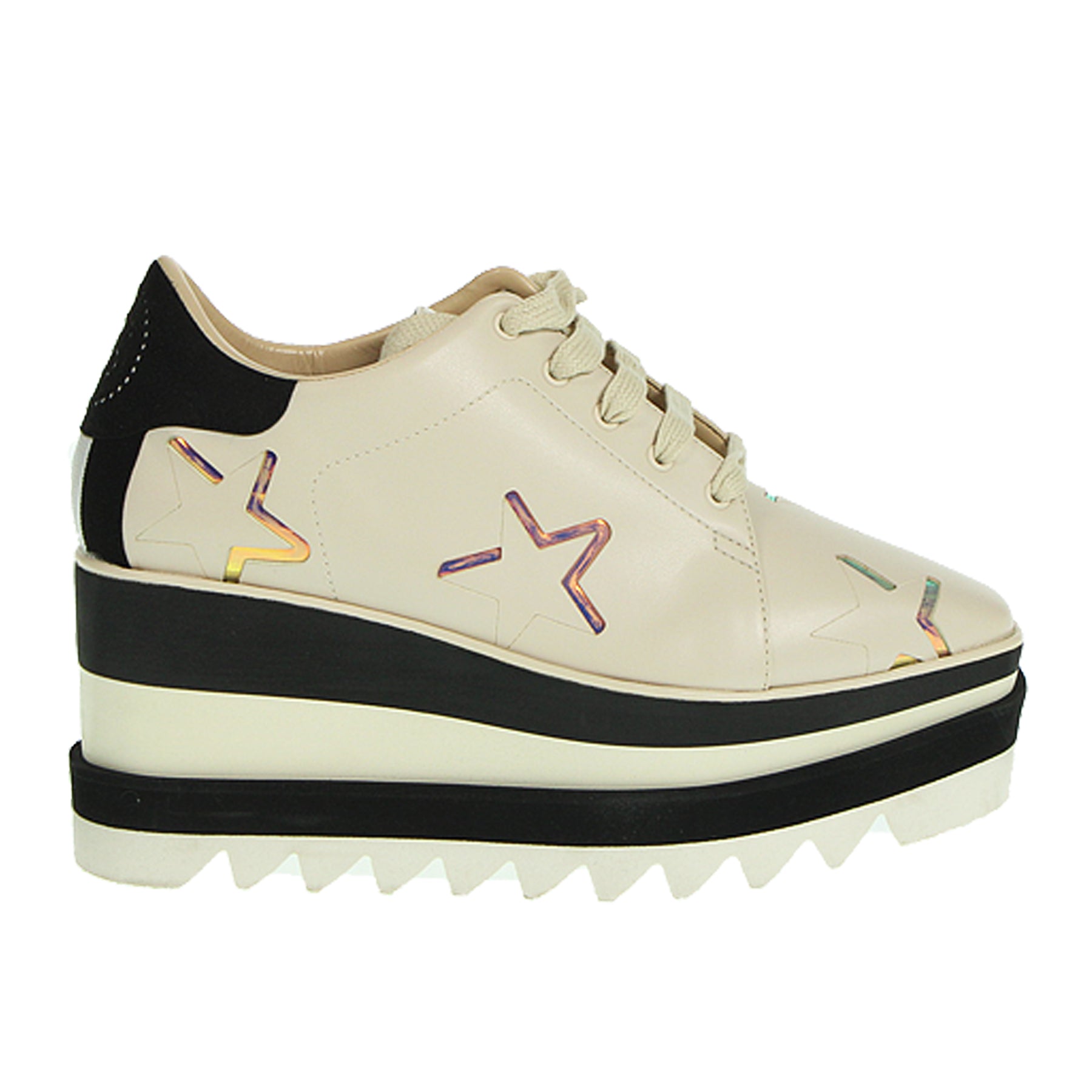 Stringata con zeppa Stella McCartney, modello Elyse, in ecopelle, colore cipria, con stelle olografiche, con micro imperfezioni. Altezza zeppa 8 cm, suola in gomma.