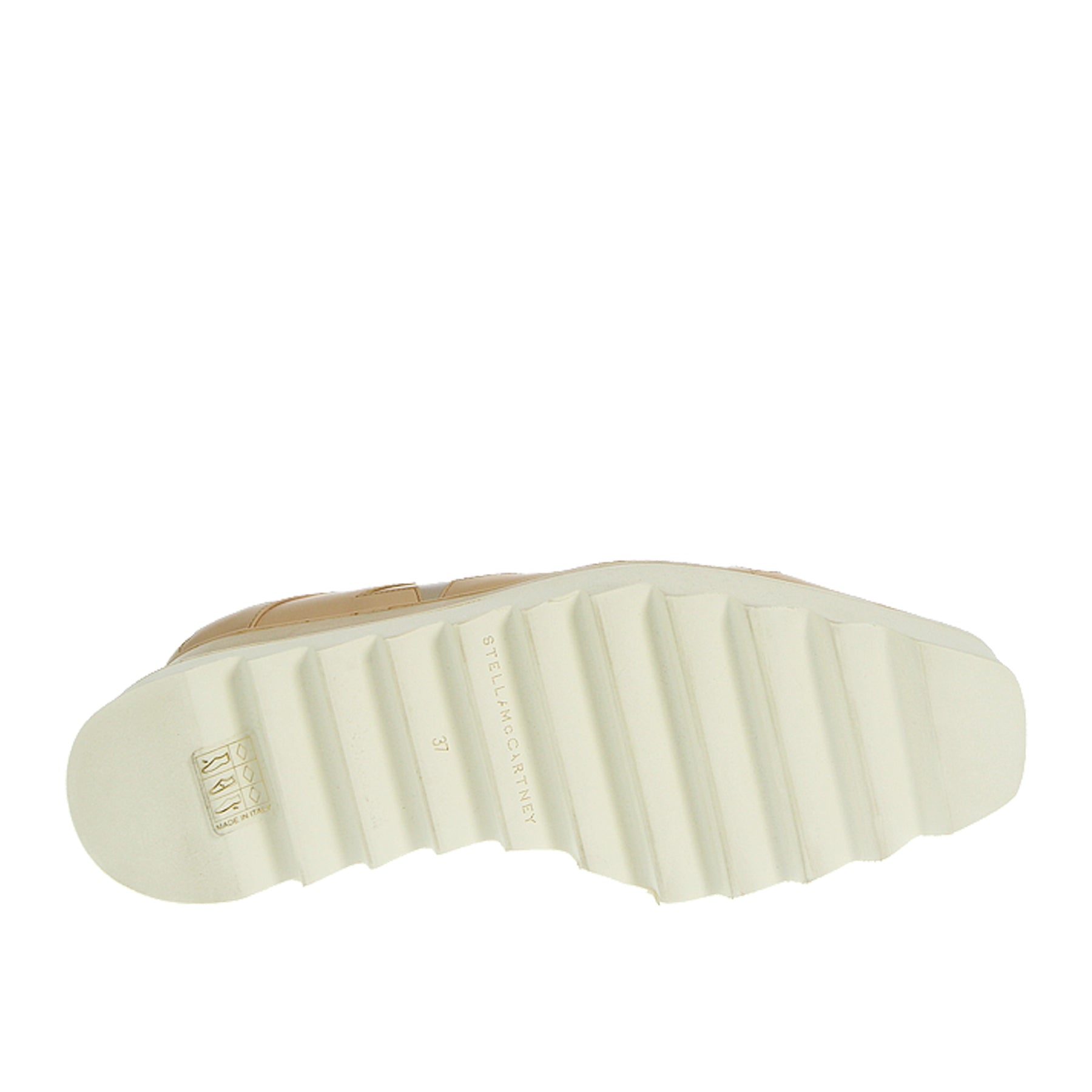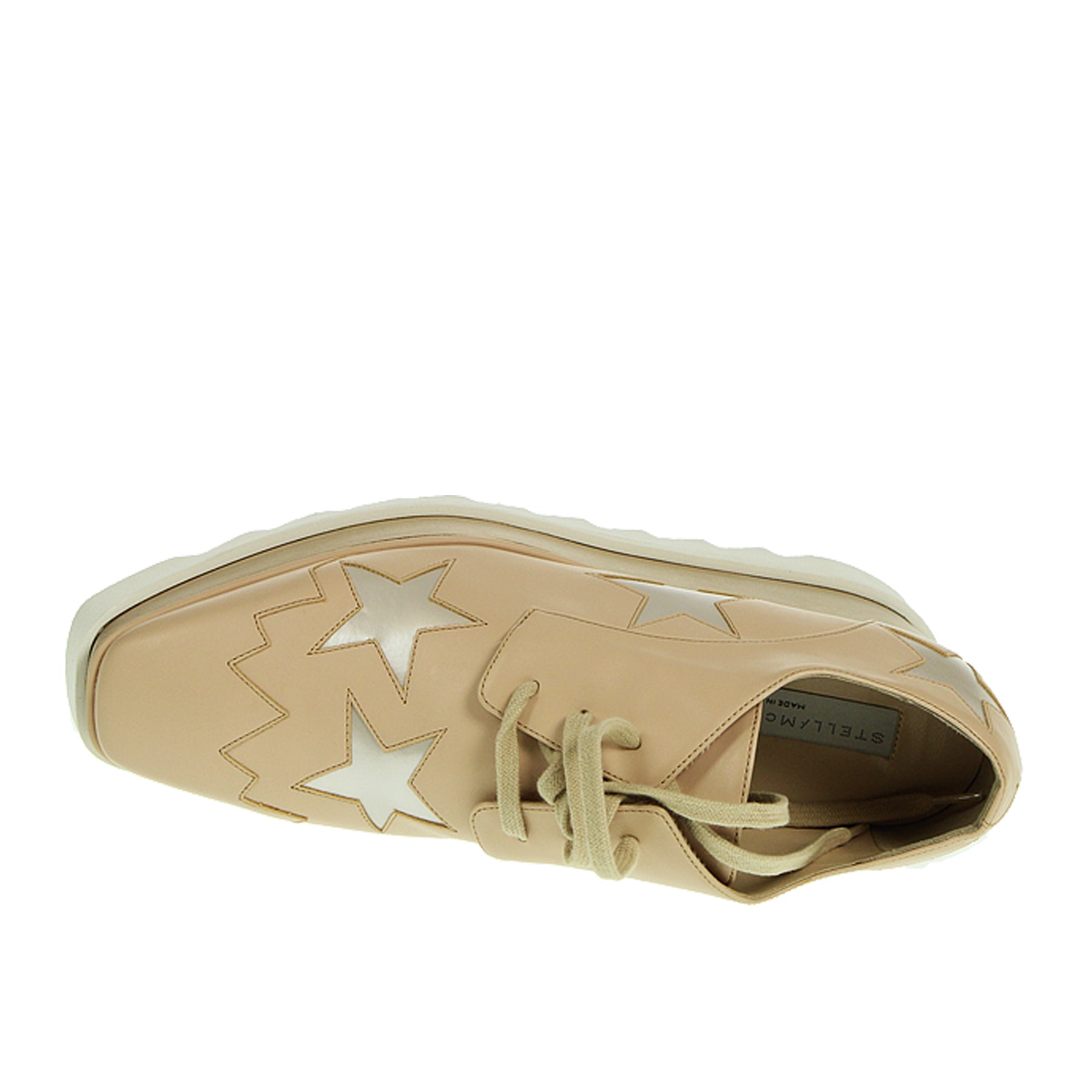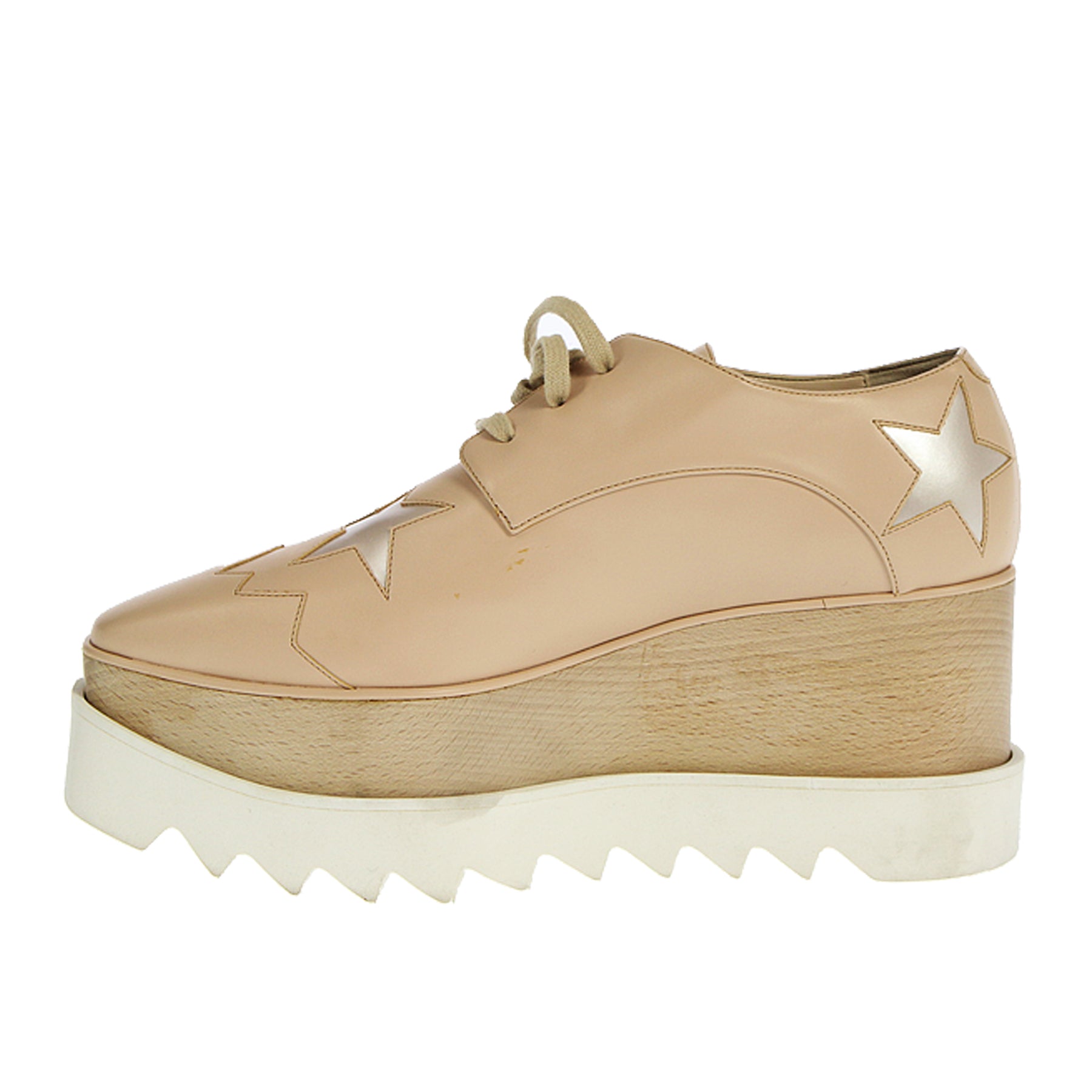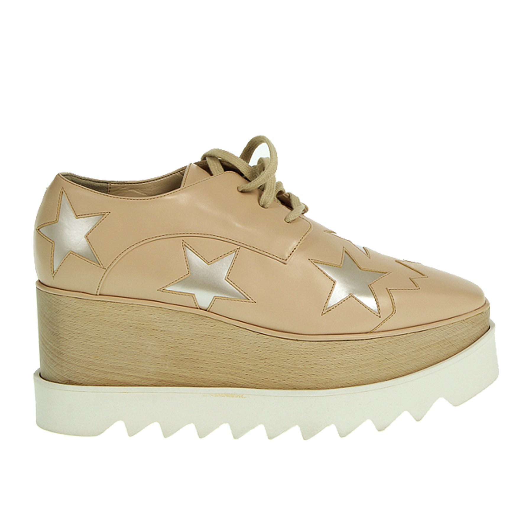Stringata con zeppa Stella McCartney, modello Elyse, in ecopelle, colore cipria, con stelle argentate, con micro imperfezioni. Altezza zeppa 8 cm, suola in gomma.