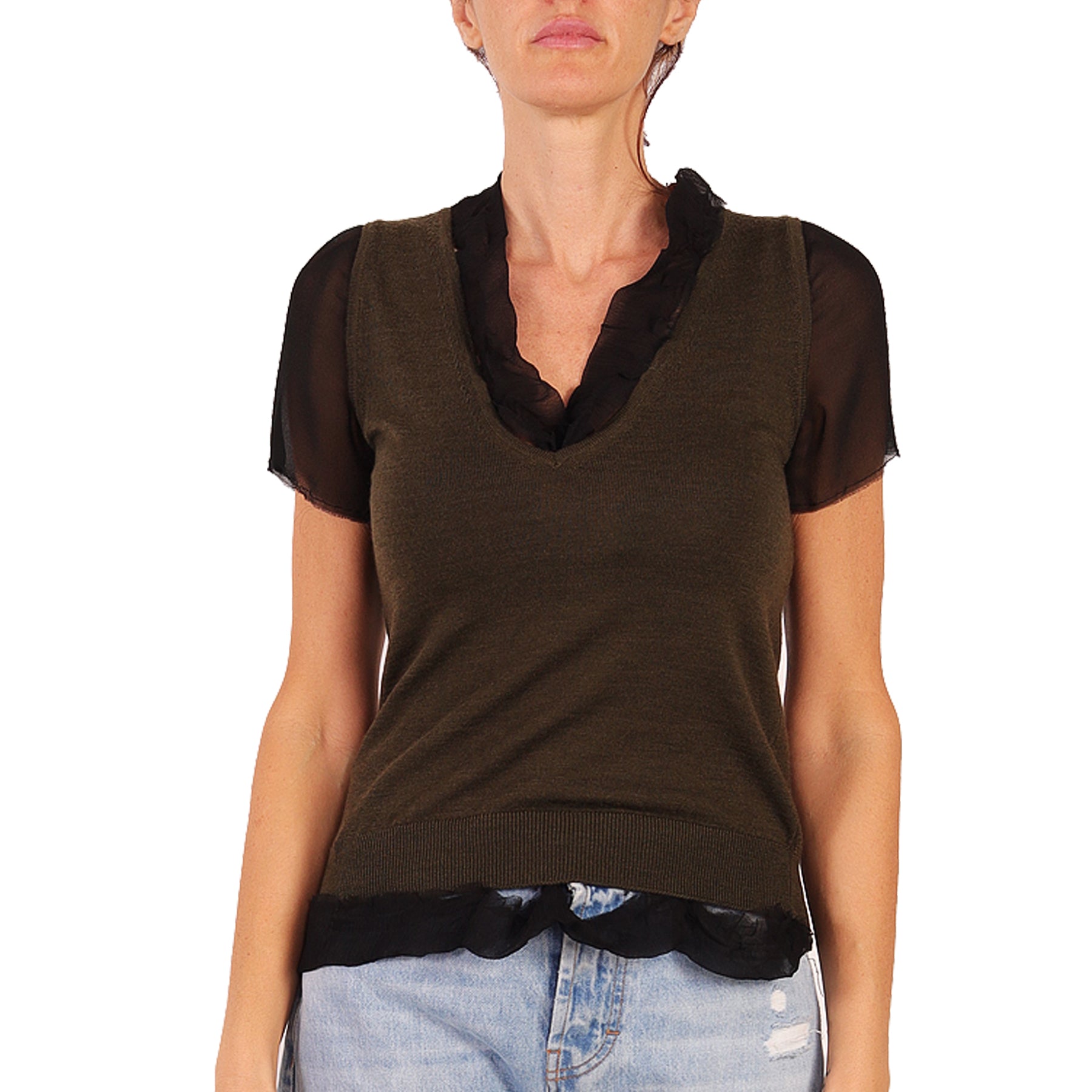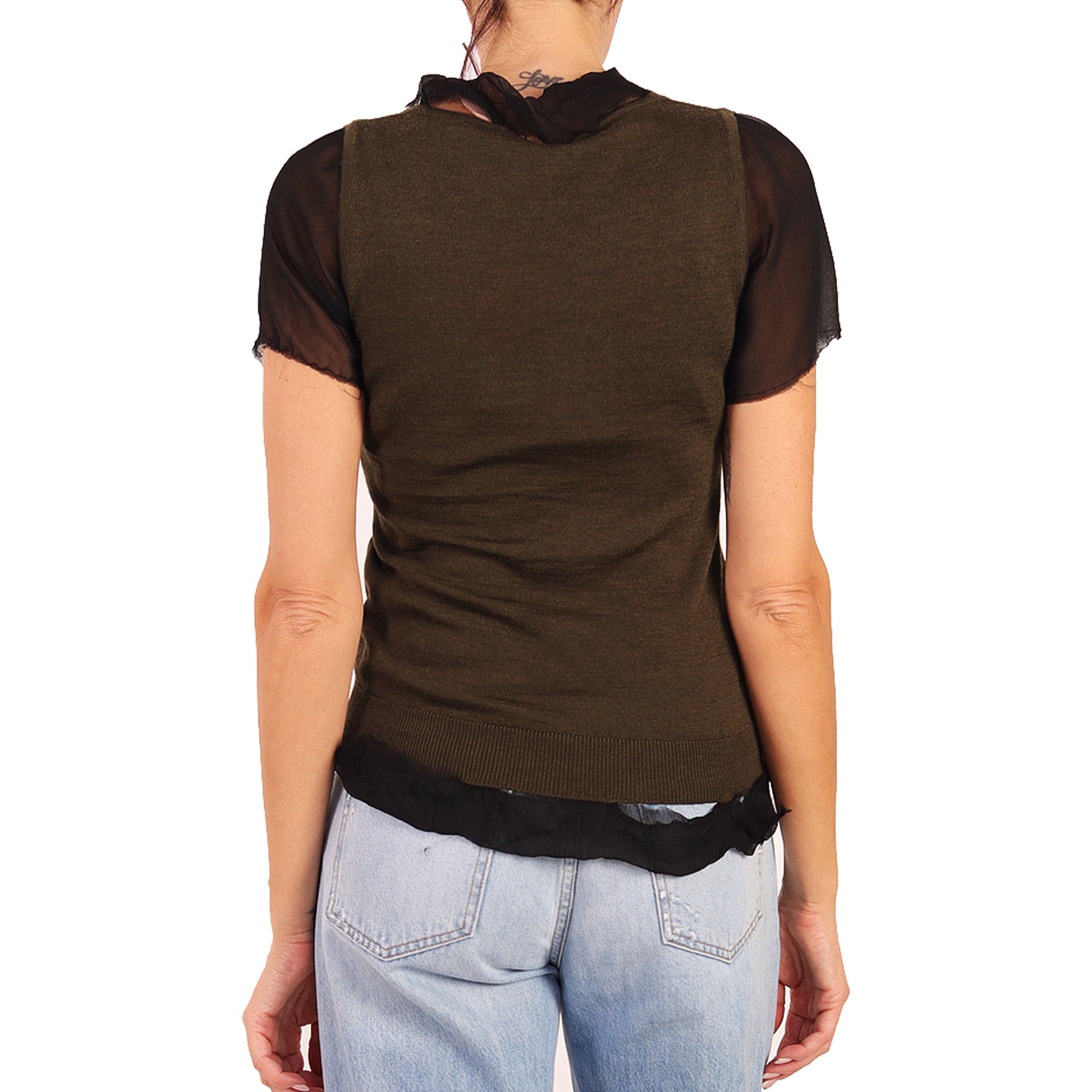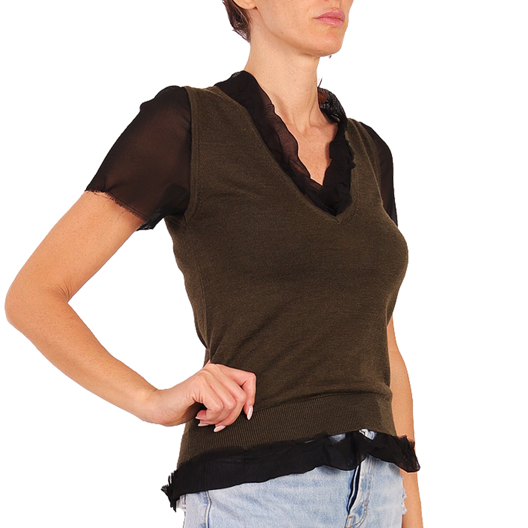 Top No. 21, in wool and silk, green and black, V-neck, elastic waist