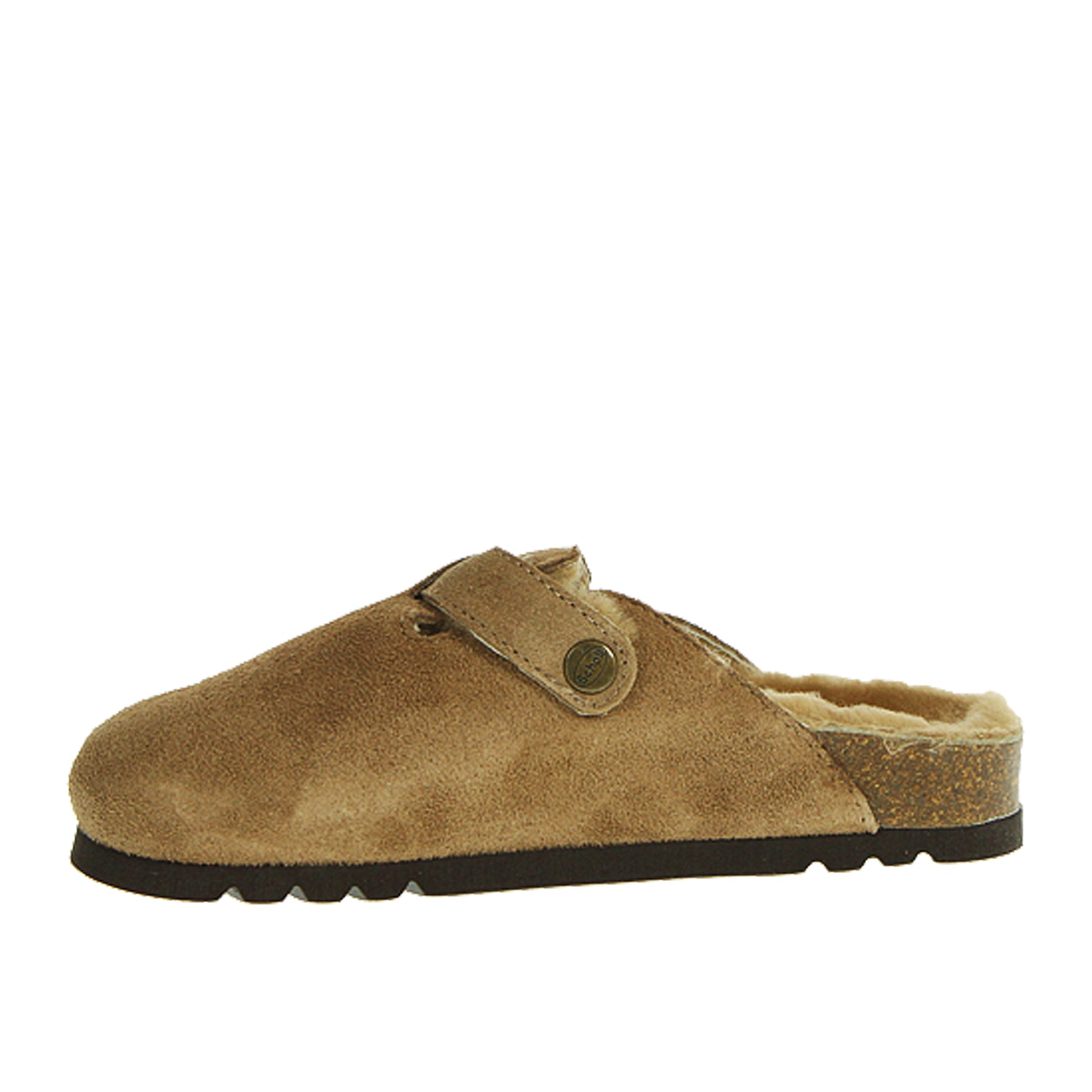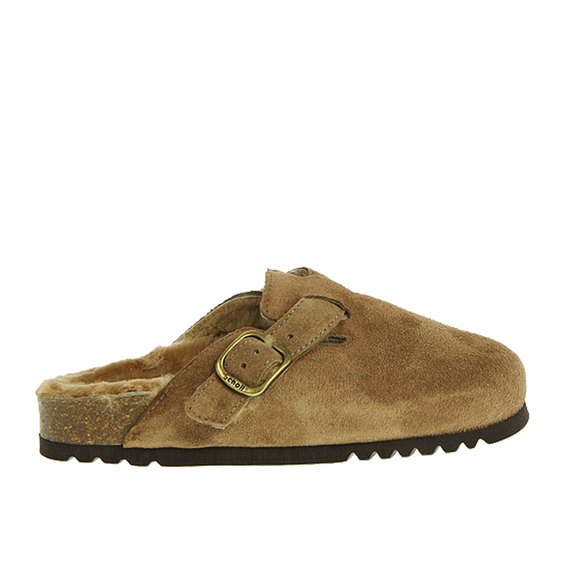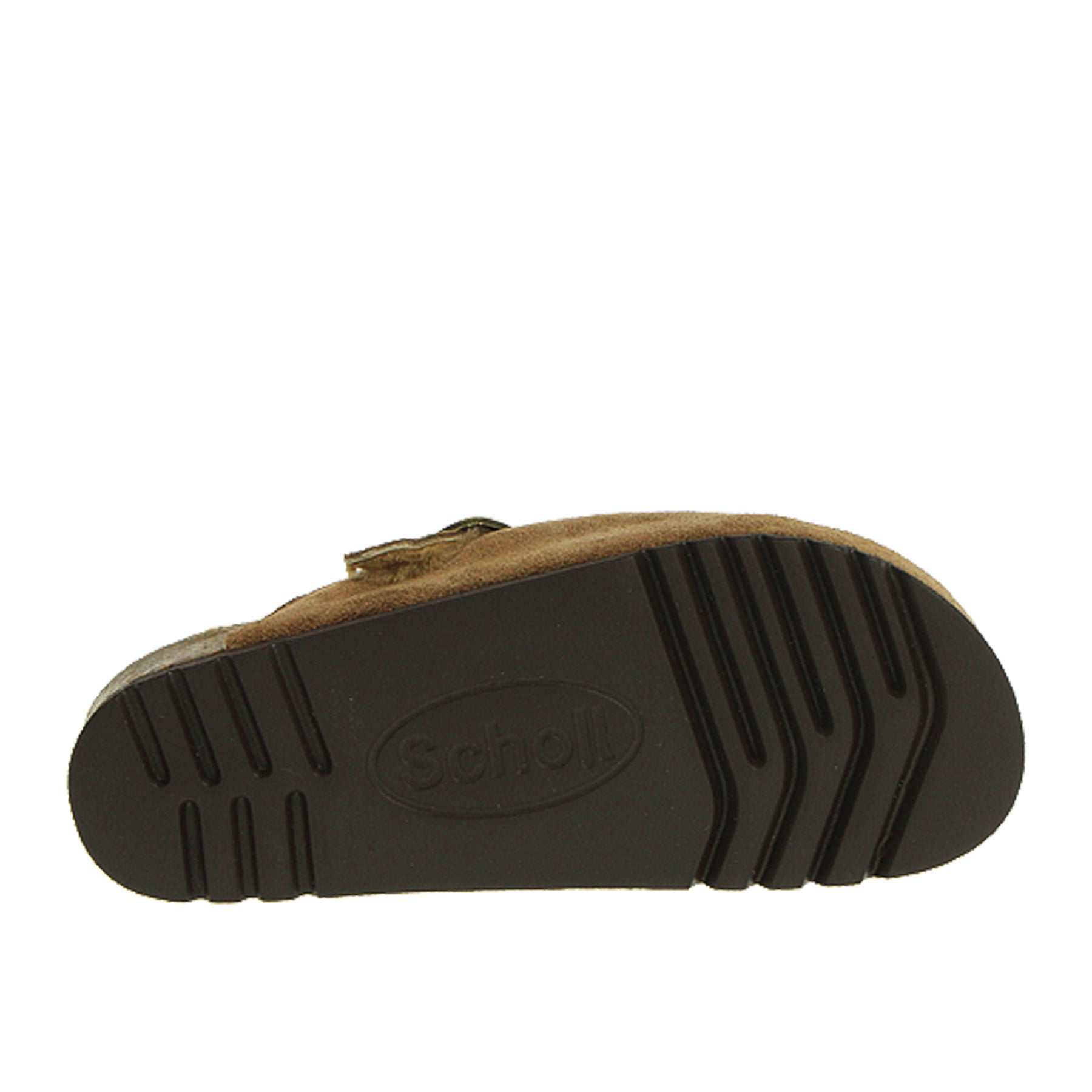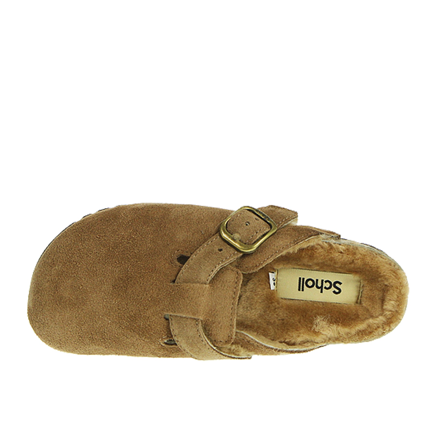 Zoccolo Scholl, modello Fae New F, con esterno in camoscio, color nocciola, con fibbia laterale, interno in pelliccia, suola in gomma