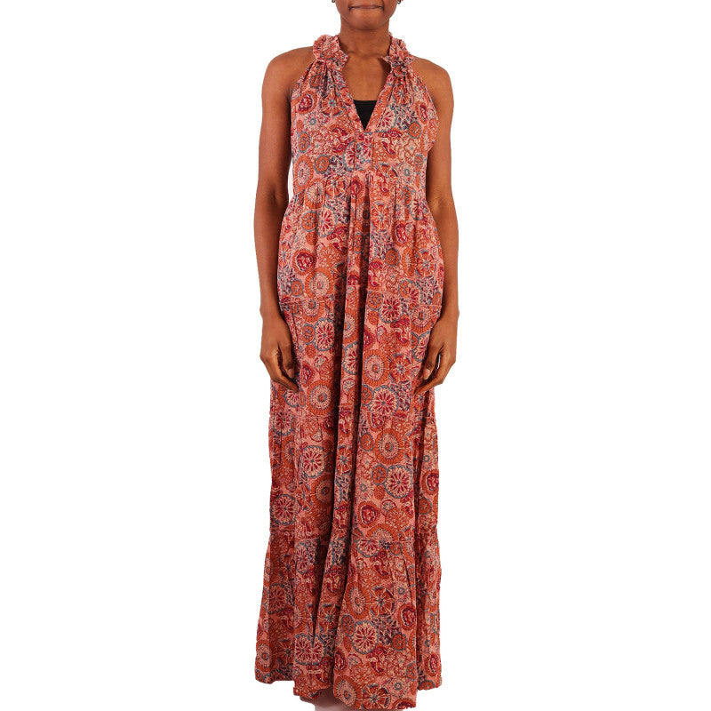 Abito, Maison Hotel, lungo, a fantasia, sui toni del rosso, senza maniche, scollo a v, fodera interna, in cotone.