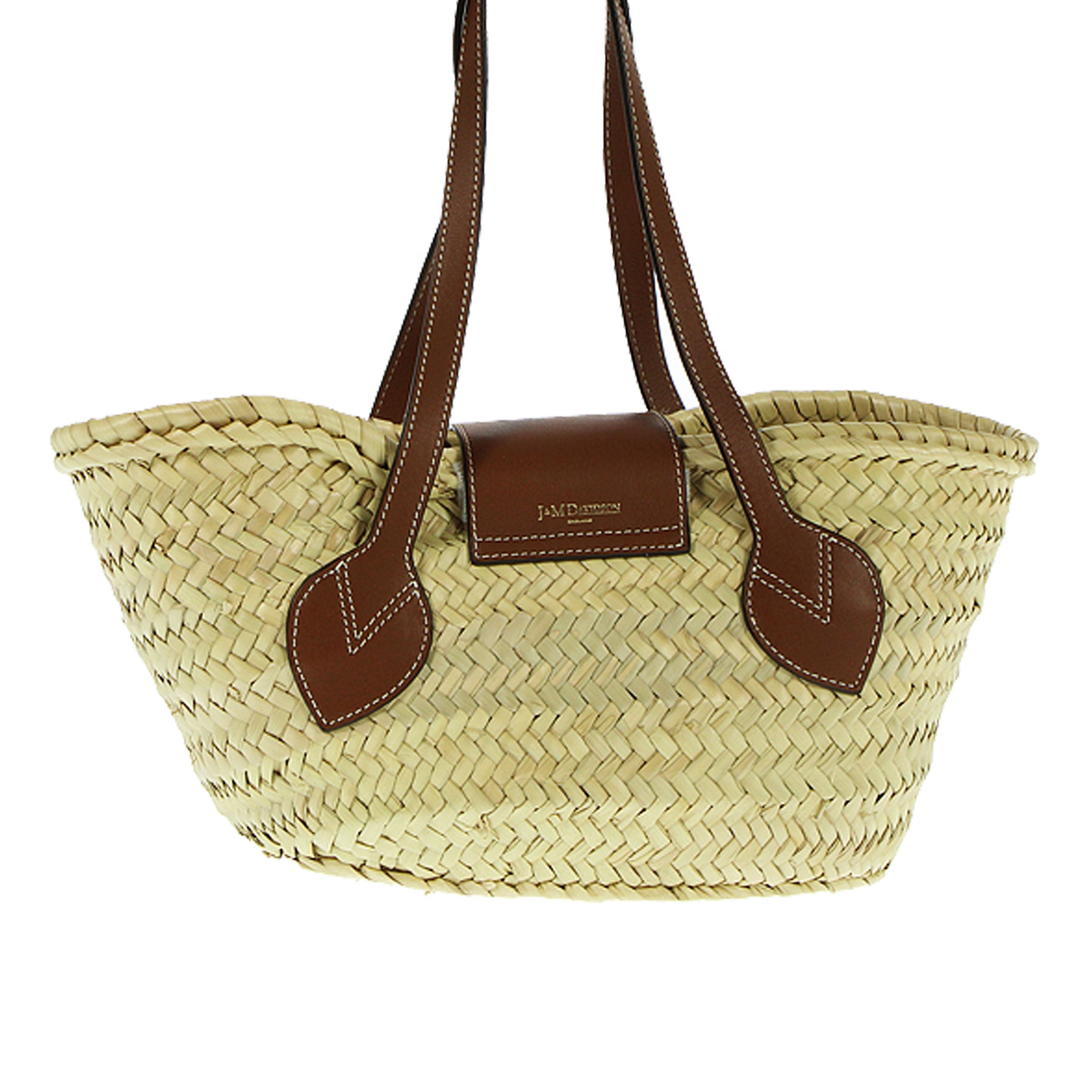 Borsa, J&ampM Davidson, a cestino, in rafia intrecciata, con doppi manici in pelle marrone, chiusura con fibbia dorata.