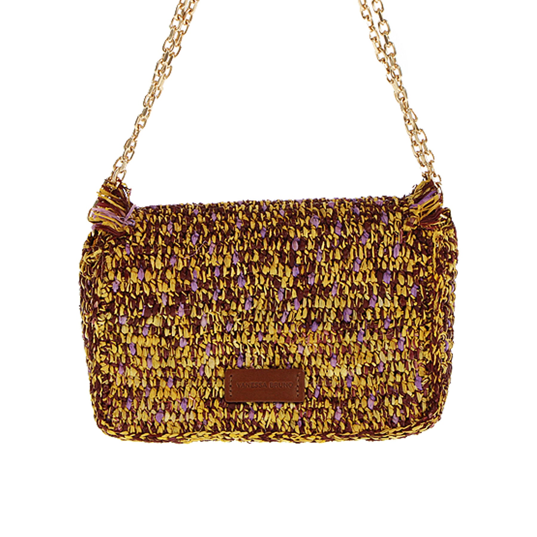 Borsa, Vanessa Bruno, in rafia intrecciata, bordeaux giallo e lilla, con ffrange sui bordi, con tracolla in catena dorata, chiusra con gancio, tasca interna con zip, fodera interna.