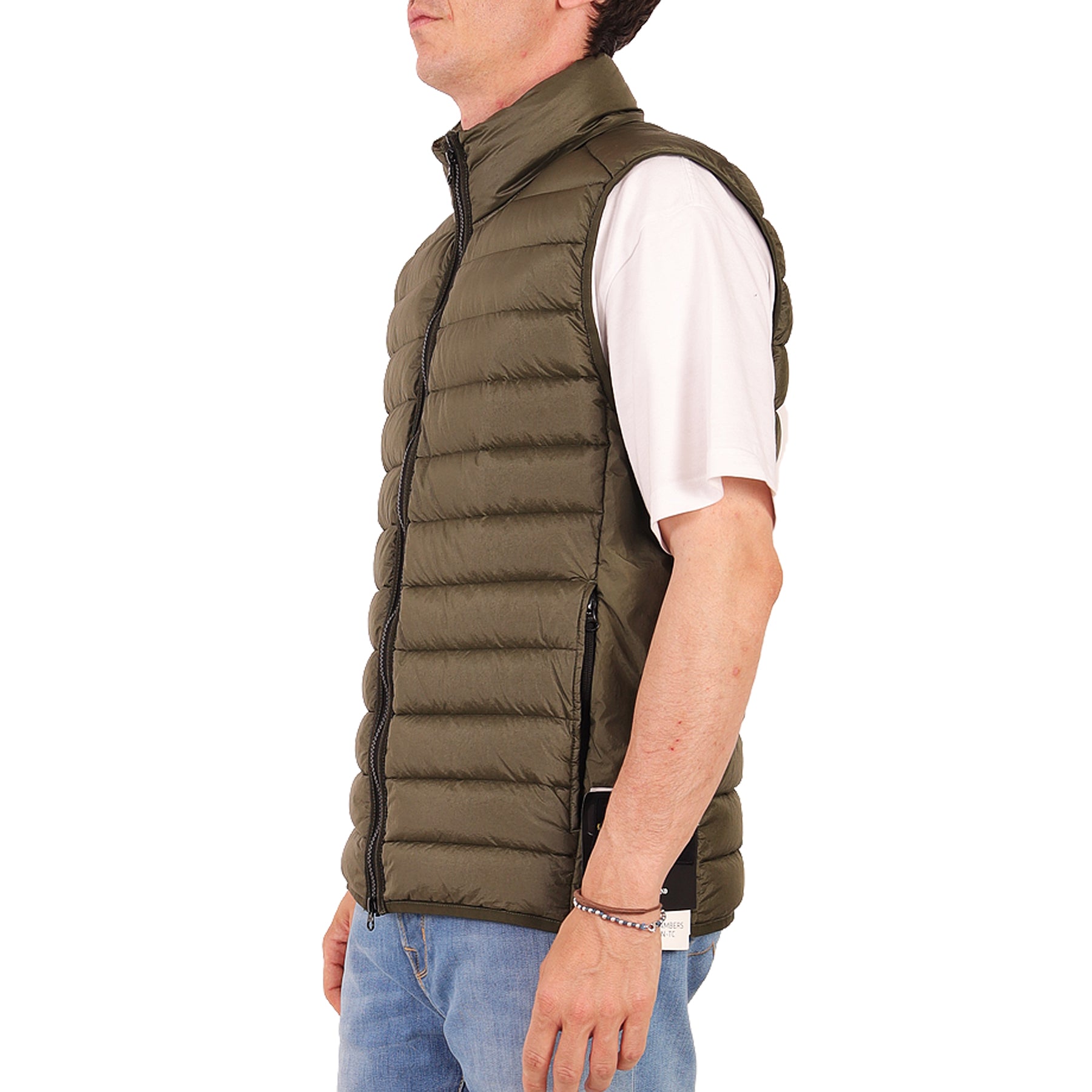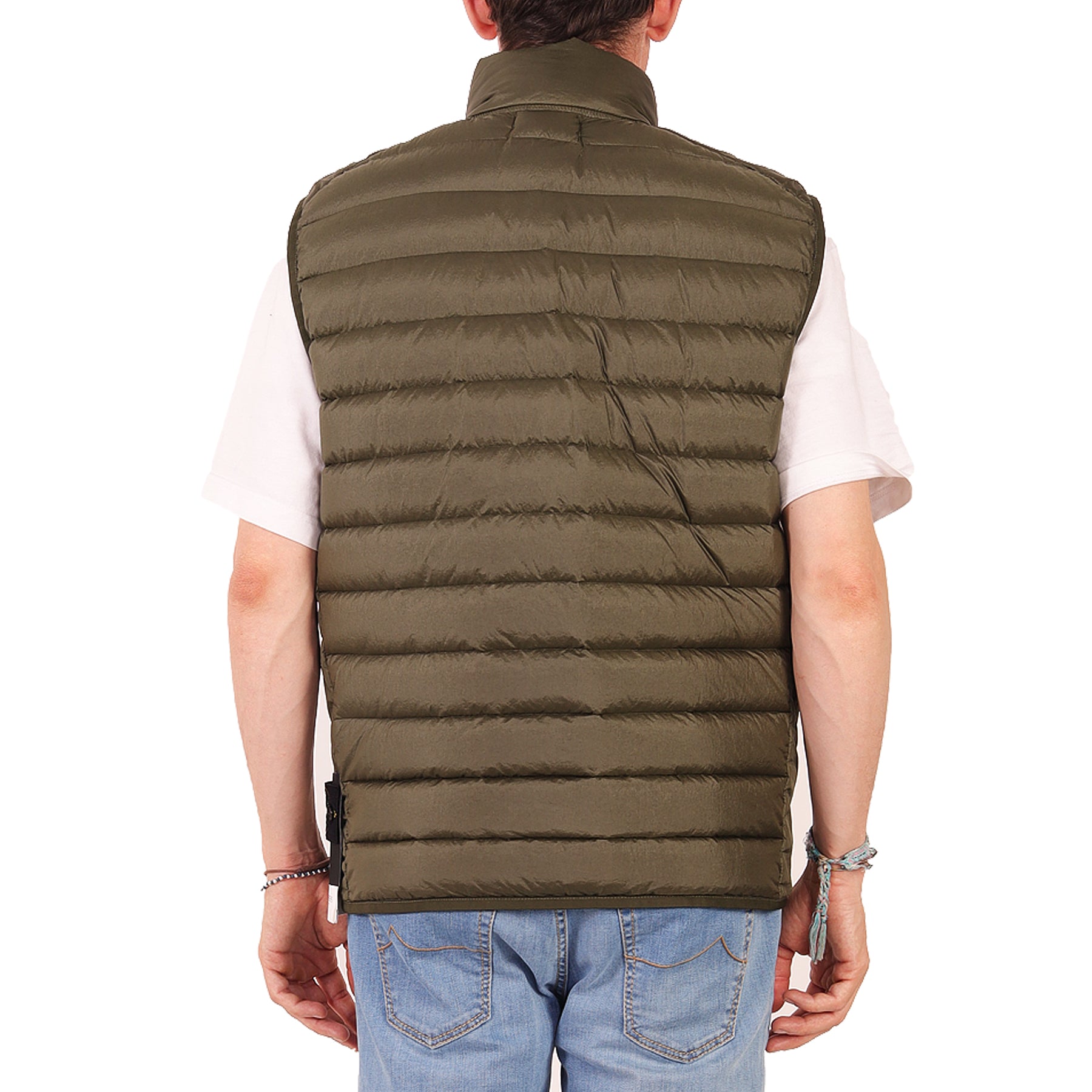 Gilet Stone Island, imbottito, colore verde, collo alto, tasche con zip, chiusura con cerniera