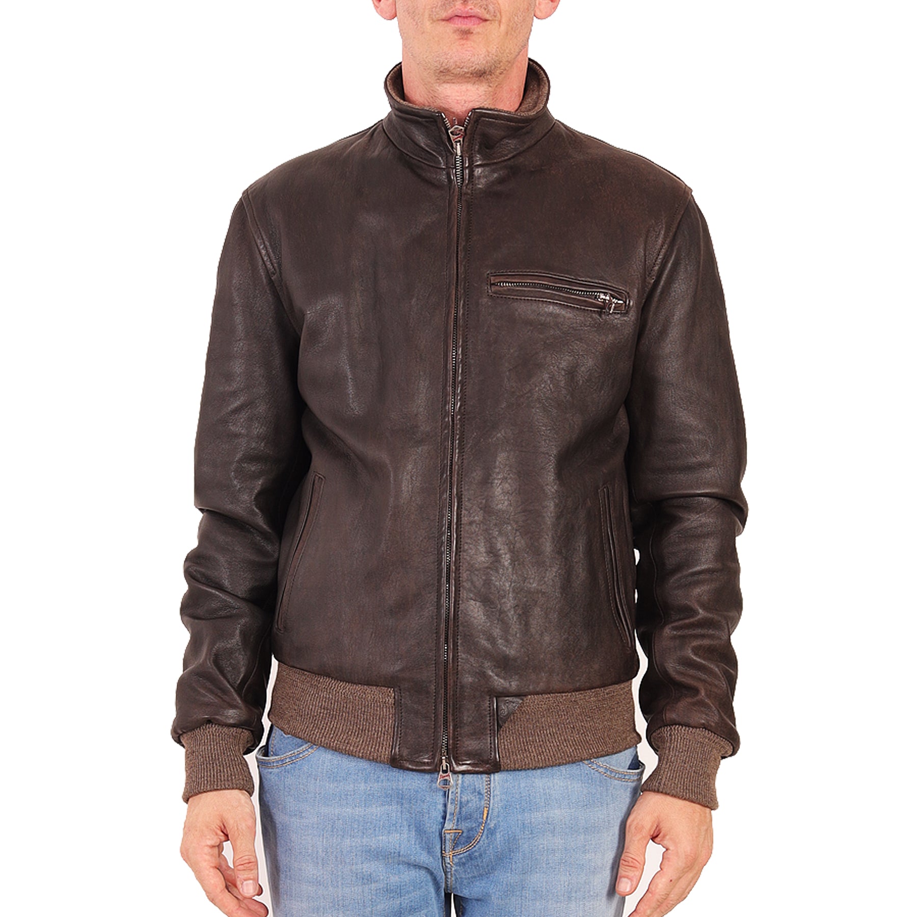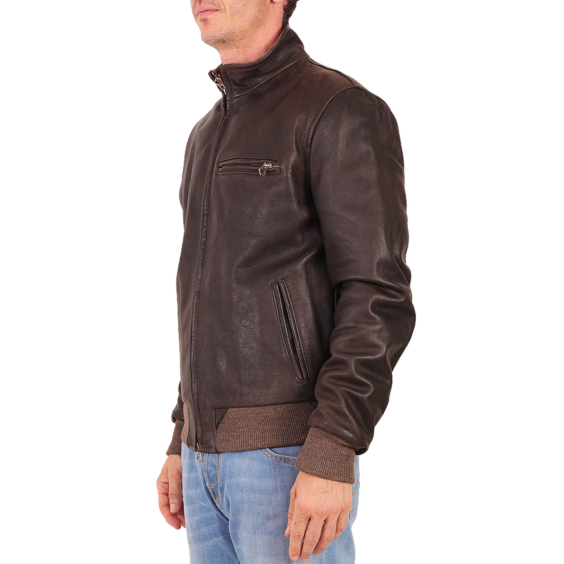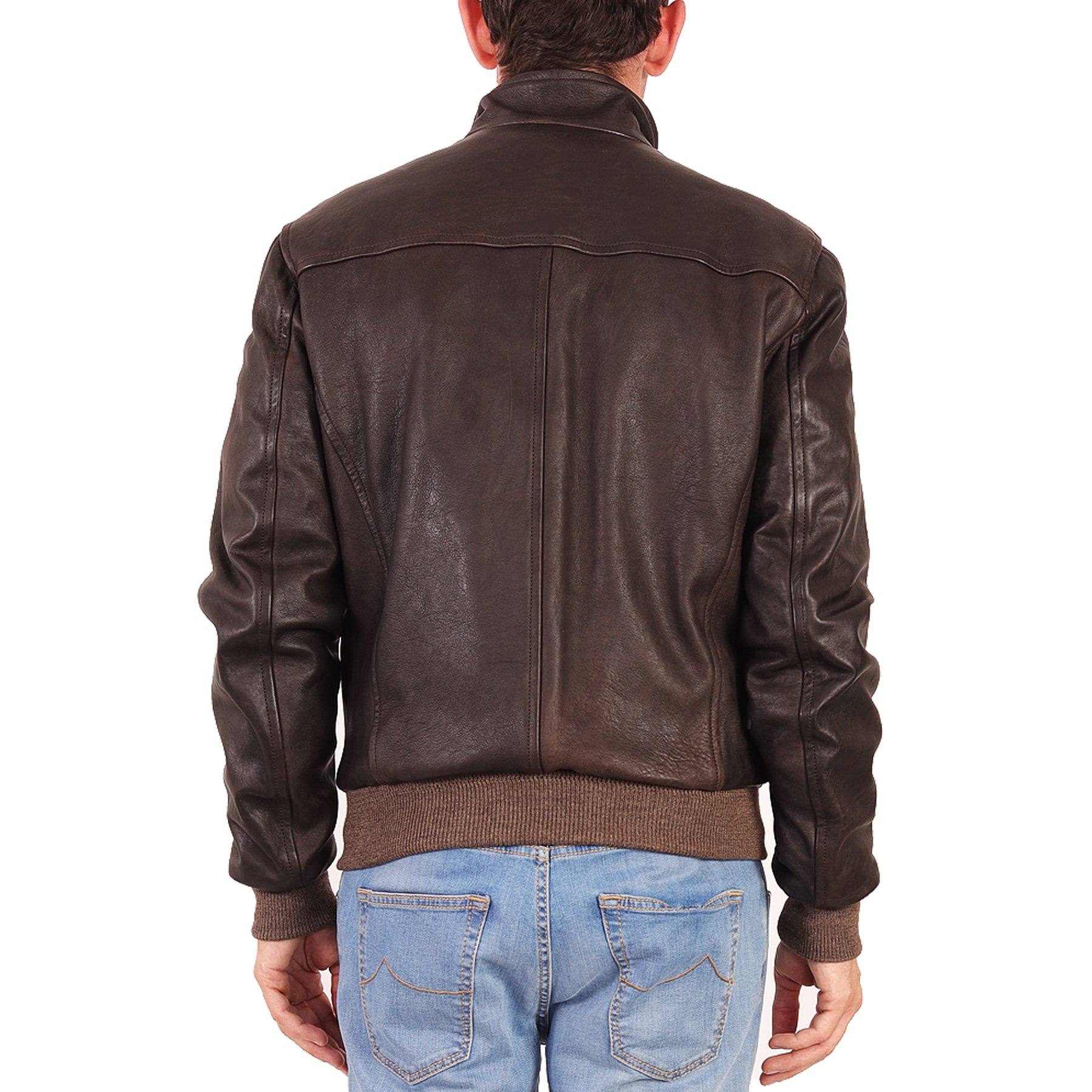 Giubbino Stewart, in pelle, colore marrone, con tasche, chiusura con cerniera