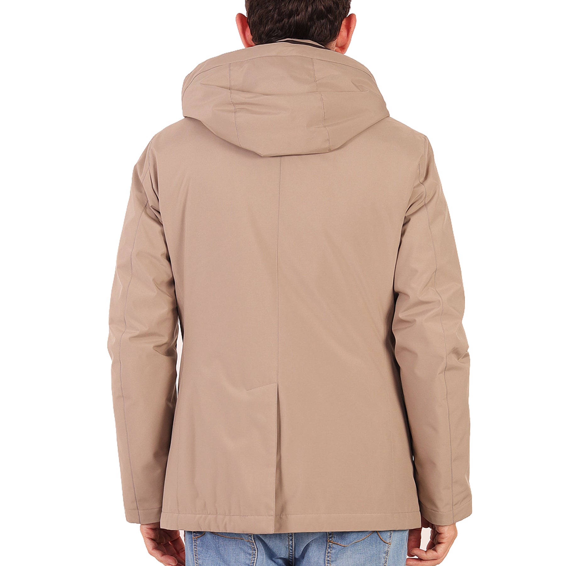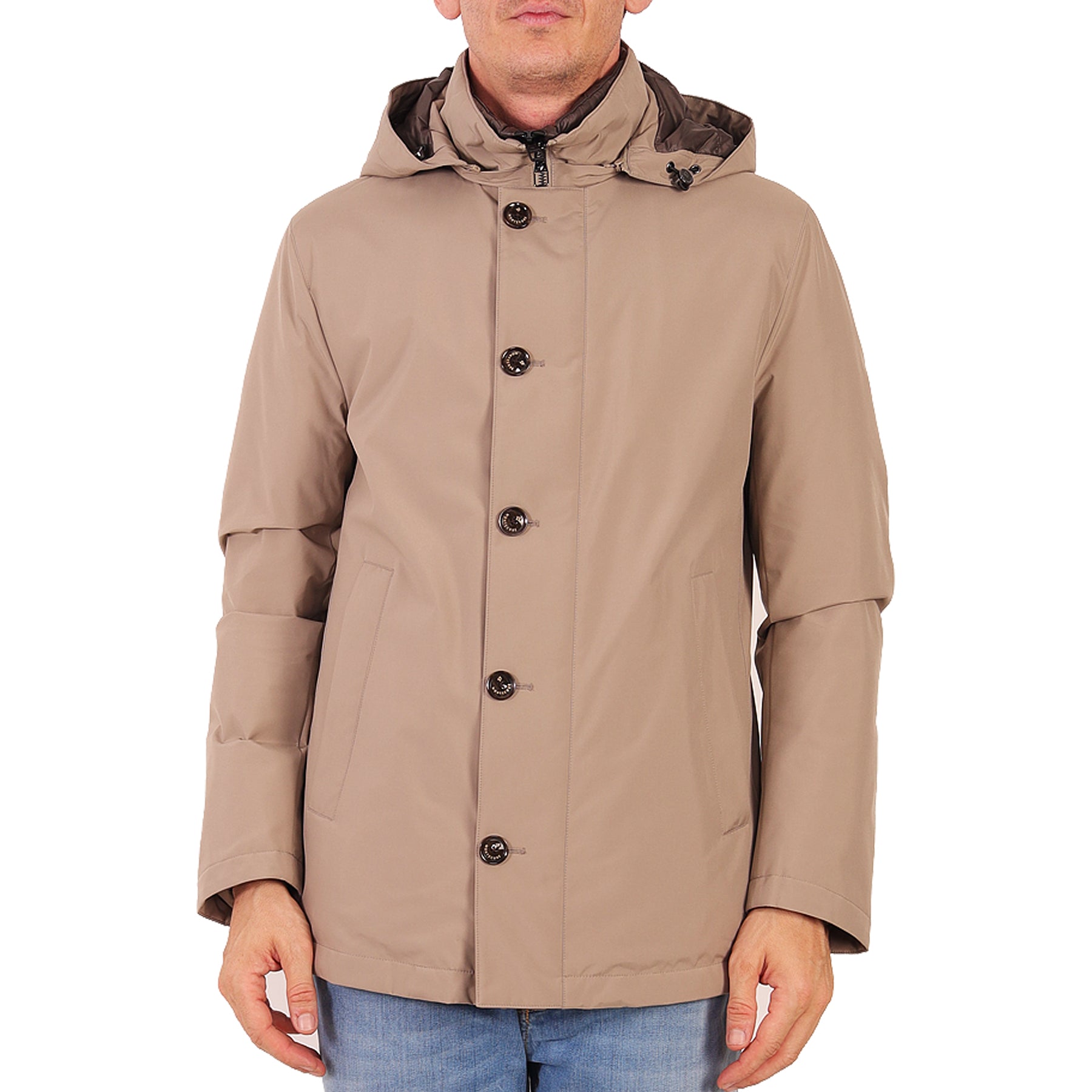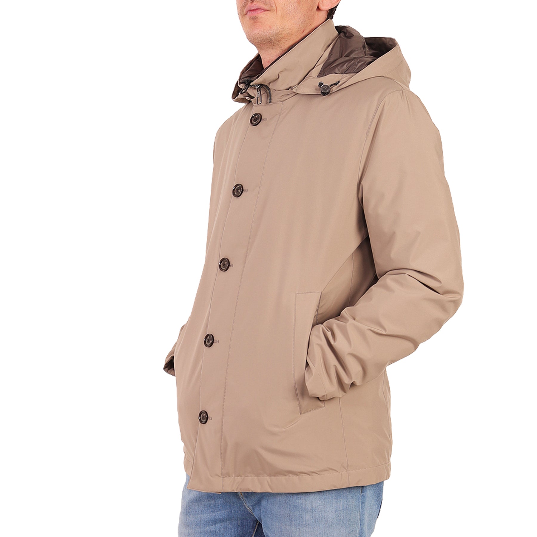 Giubbino Montecore, colore beige, collo alto, cappuccio staccabile, tasche con cerniera, chiusura con cerniera e bottoni
