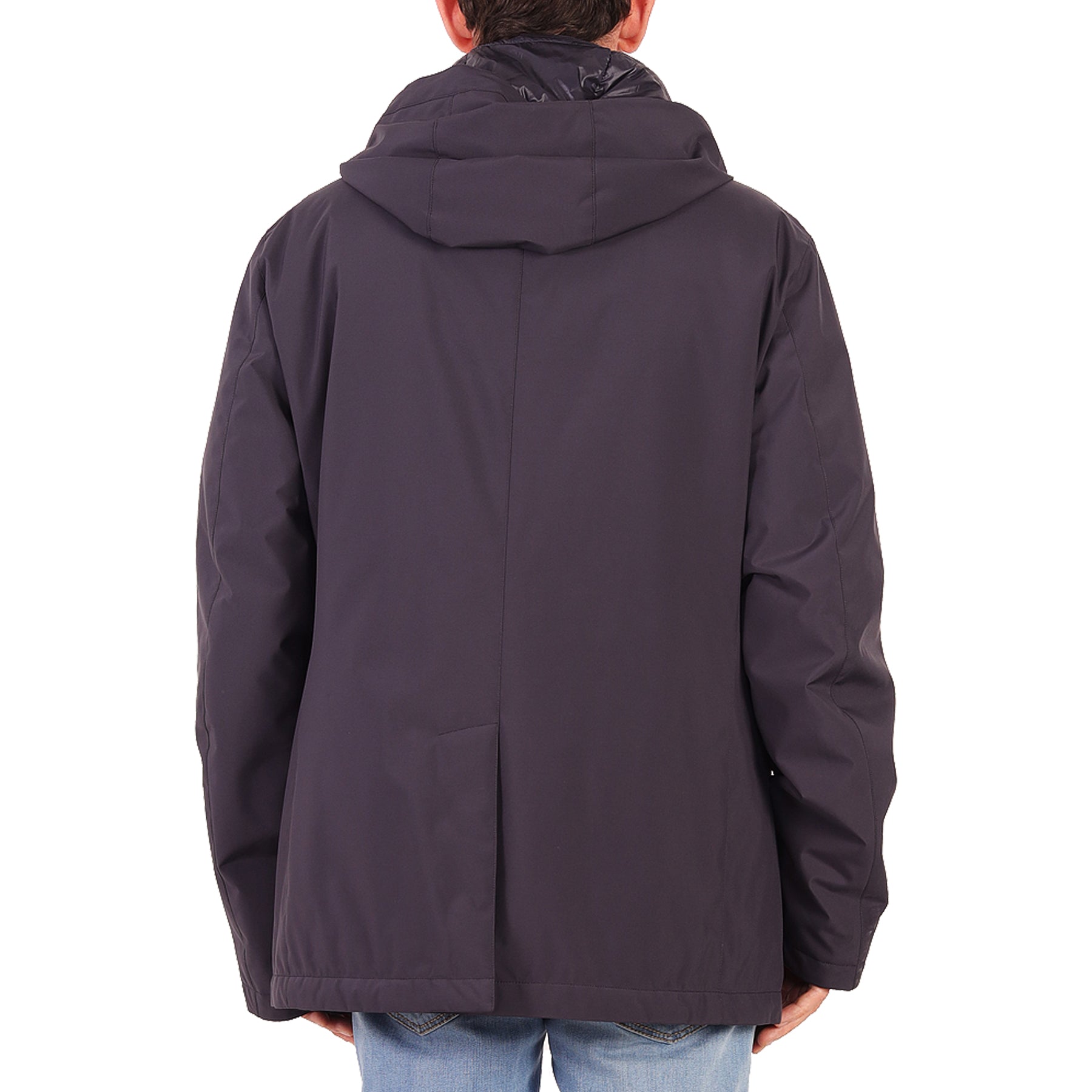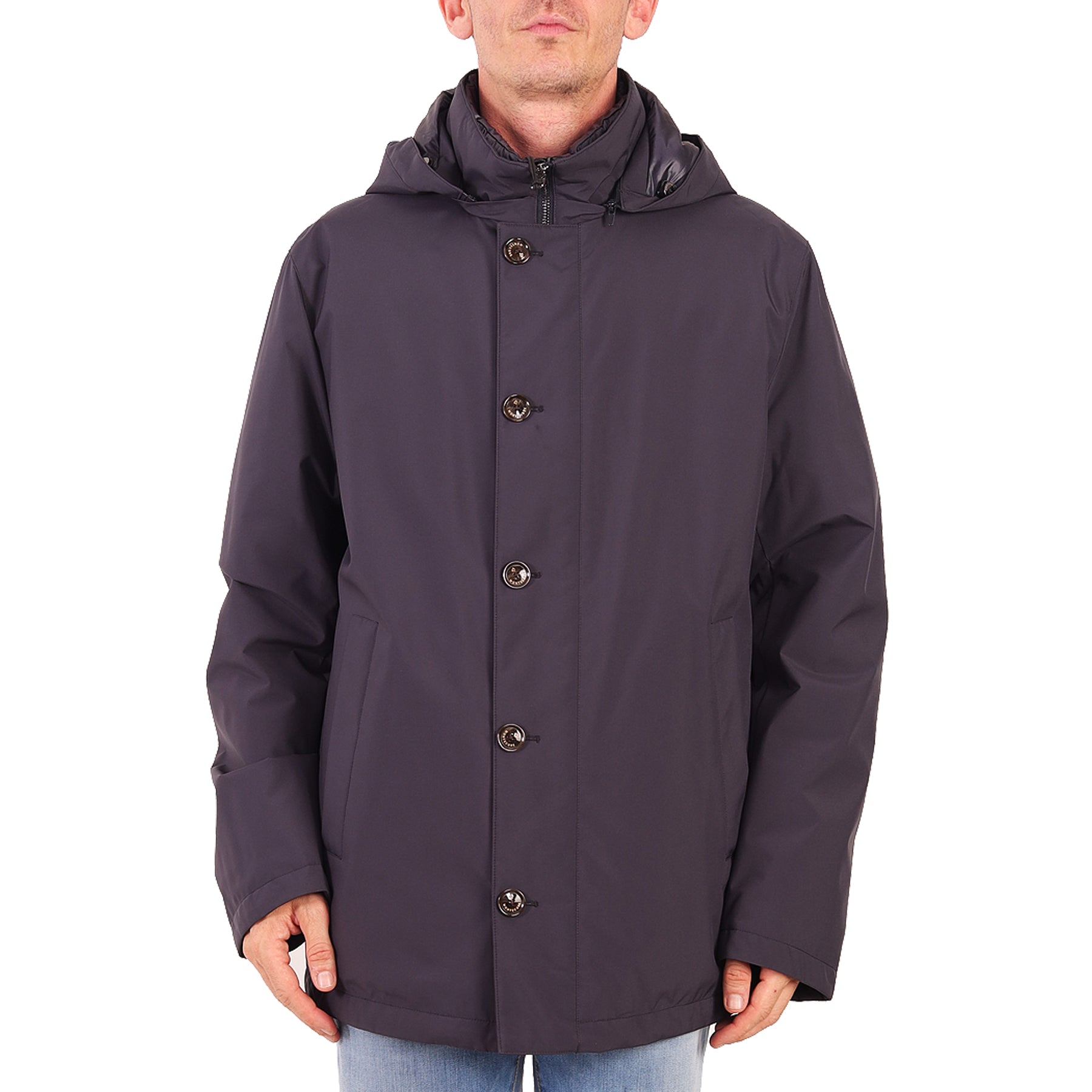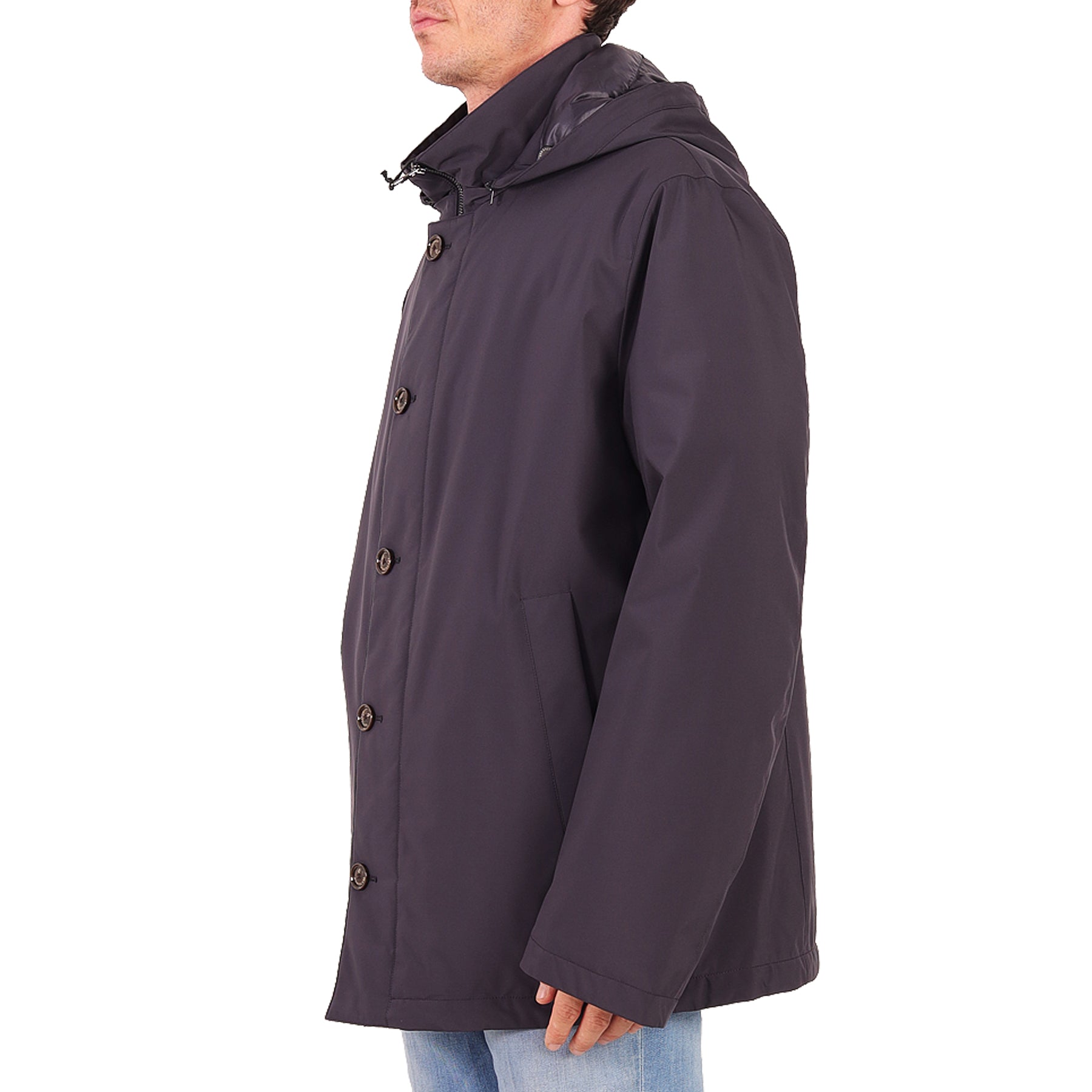 Giubbino Montecore, colore beige, collo alto, cappuccio staccabile, tasche con cerniera, chiusura con cerniera e bottoni