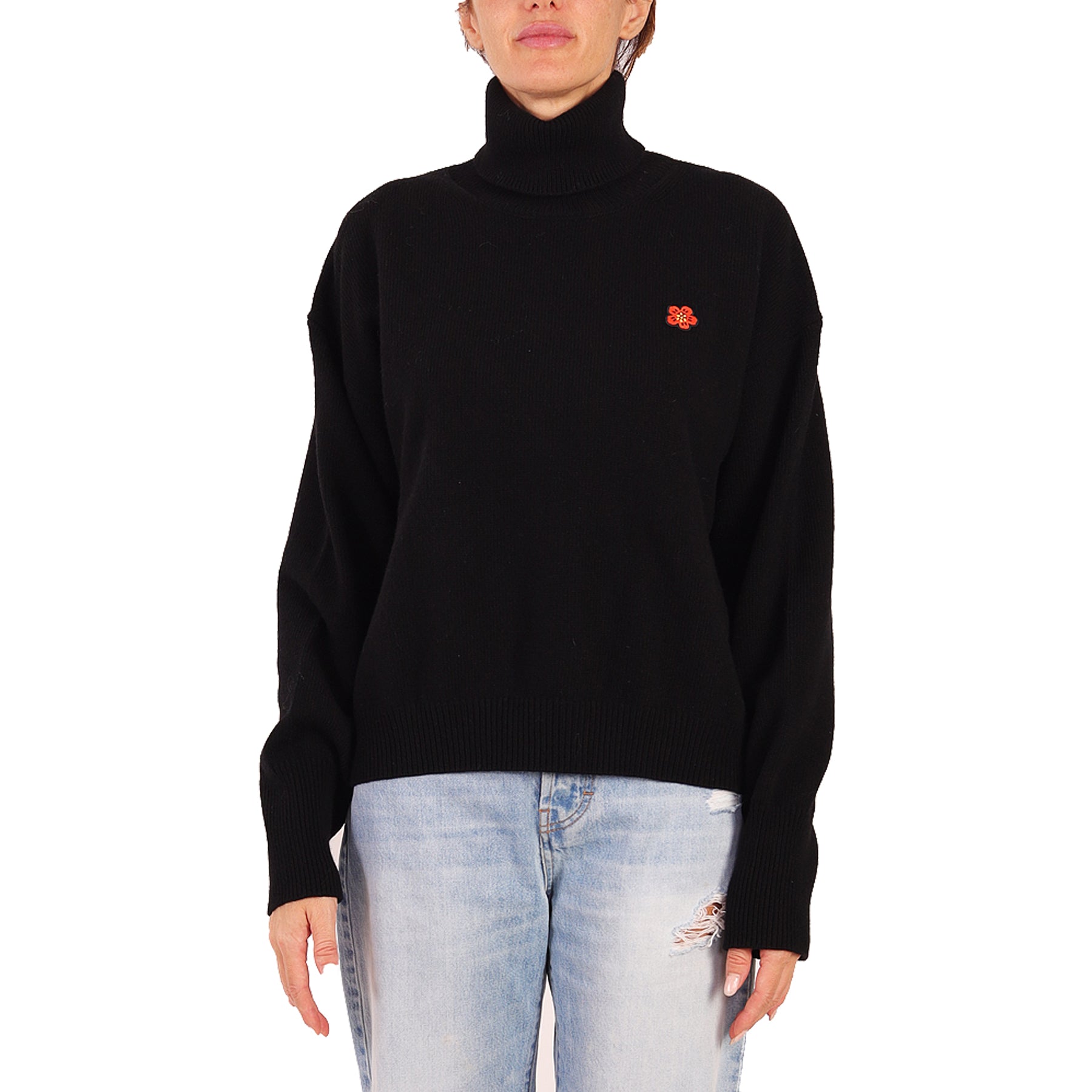 Maglia a collo alto Kenzo, nera, in lana, con fiore ricamato sul davanti