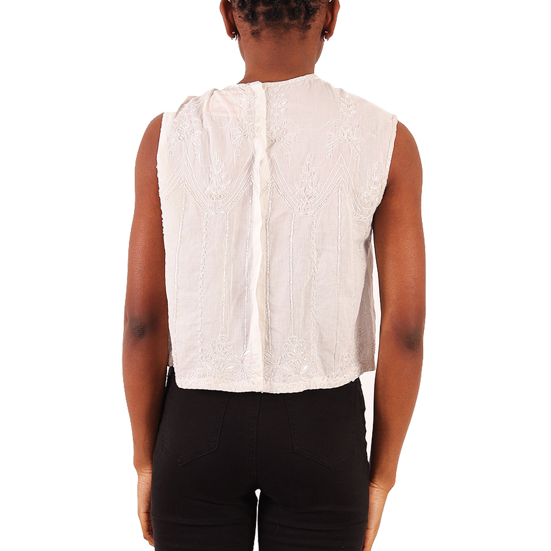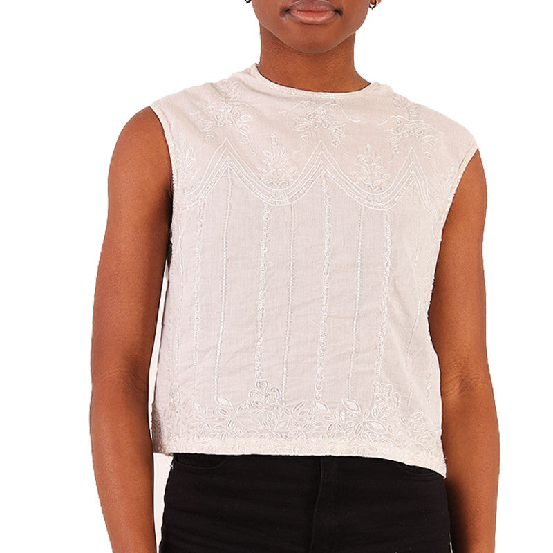 Top, Laurence Bras, bianco, con ricami in perline, senza maniche, girocollo, con bottoni sul retro.