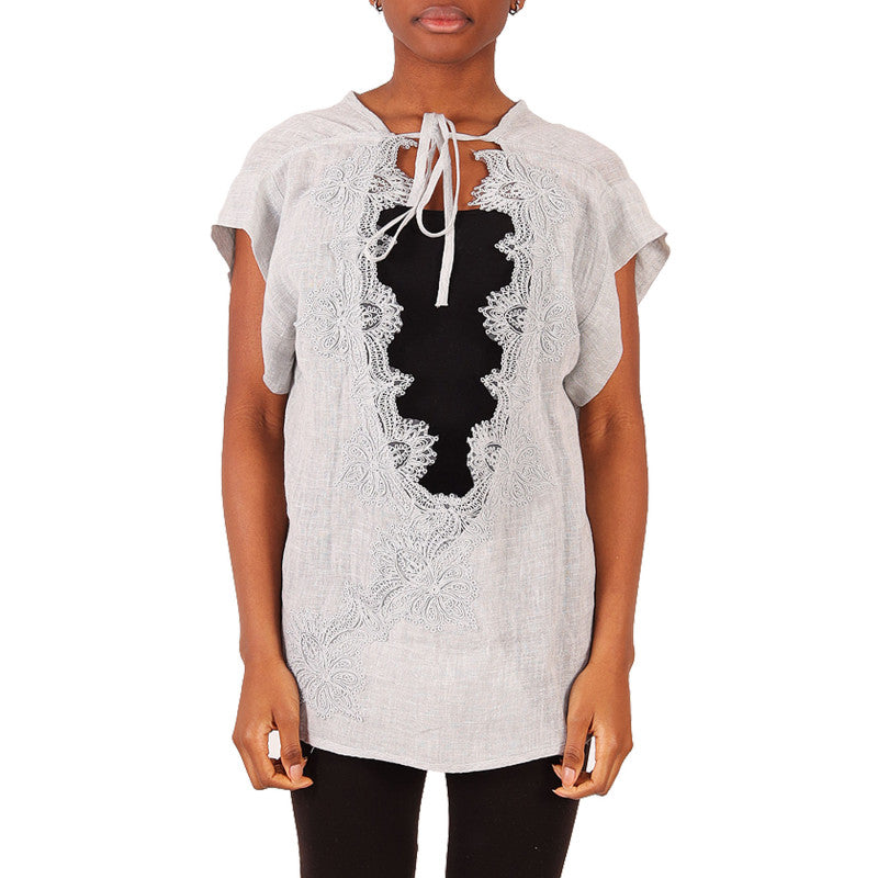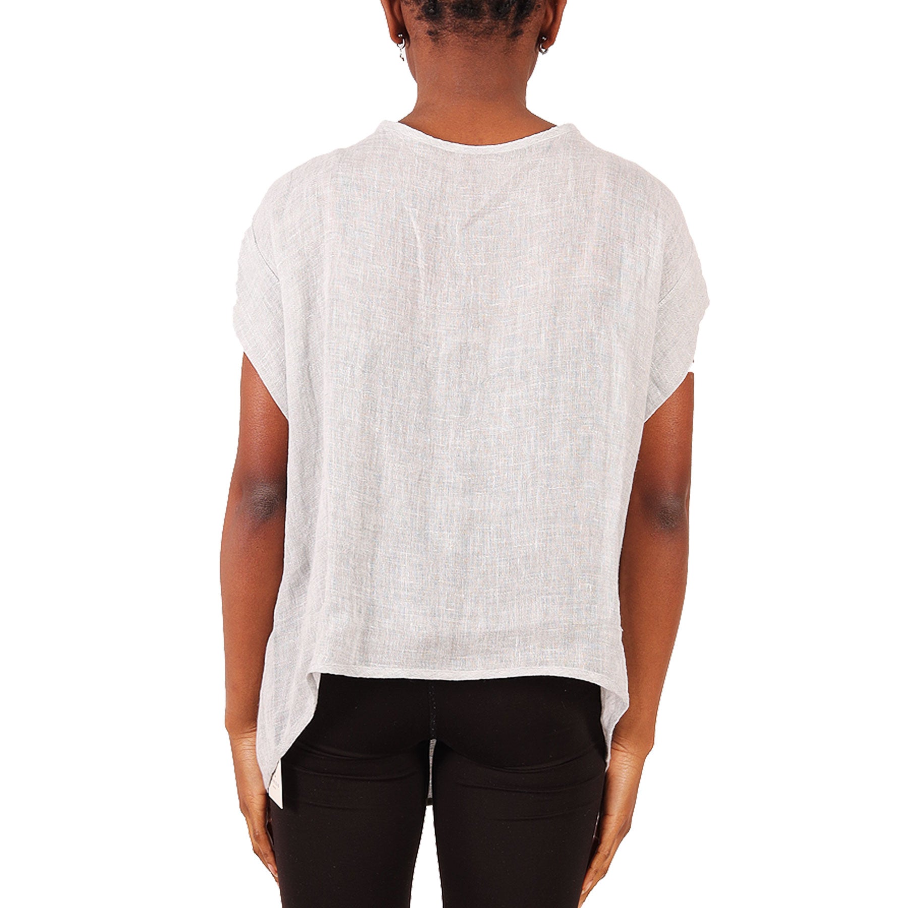 Top, Maurizio Mykonos, a maniche lunghe, in lino, girocollo, a righe, bianca e beige.