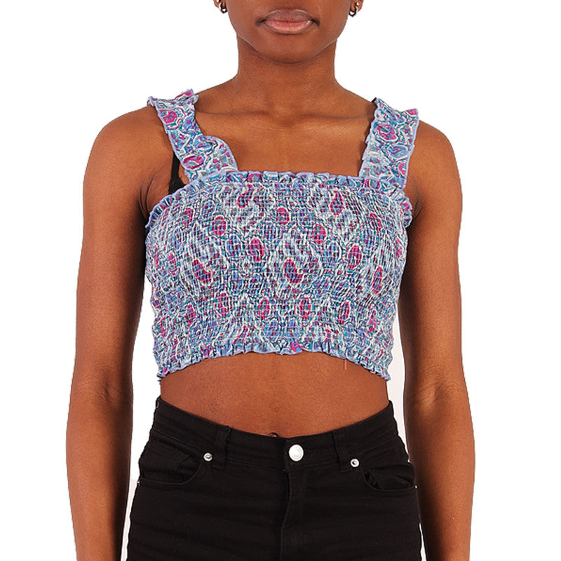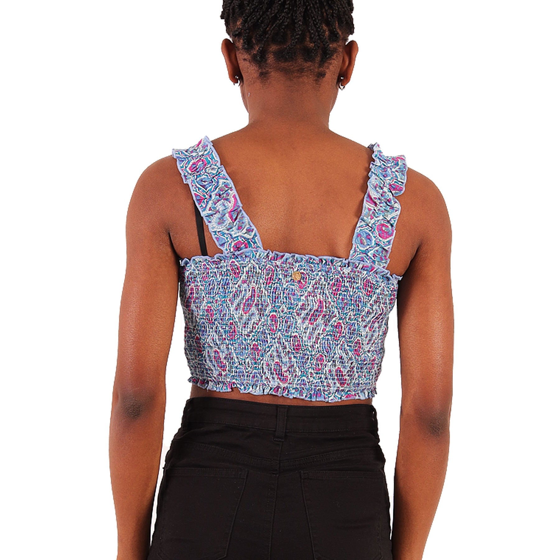 Top, Antik Batik, a fantasia, blu azzurro e fucsia, senza maniche, con corpetto elastico, in cotone.