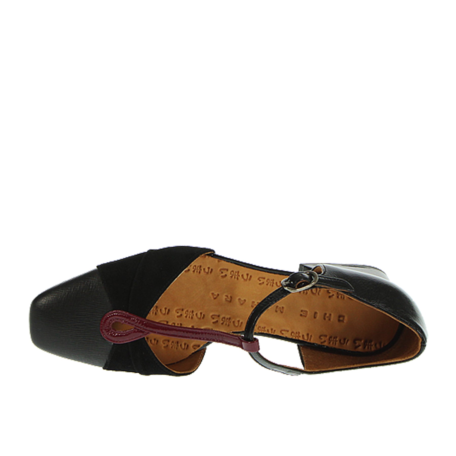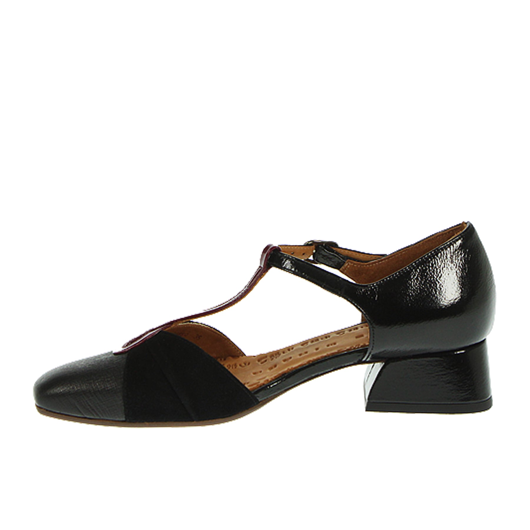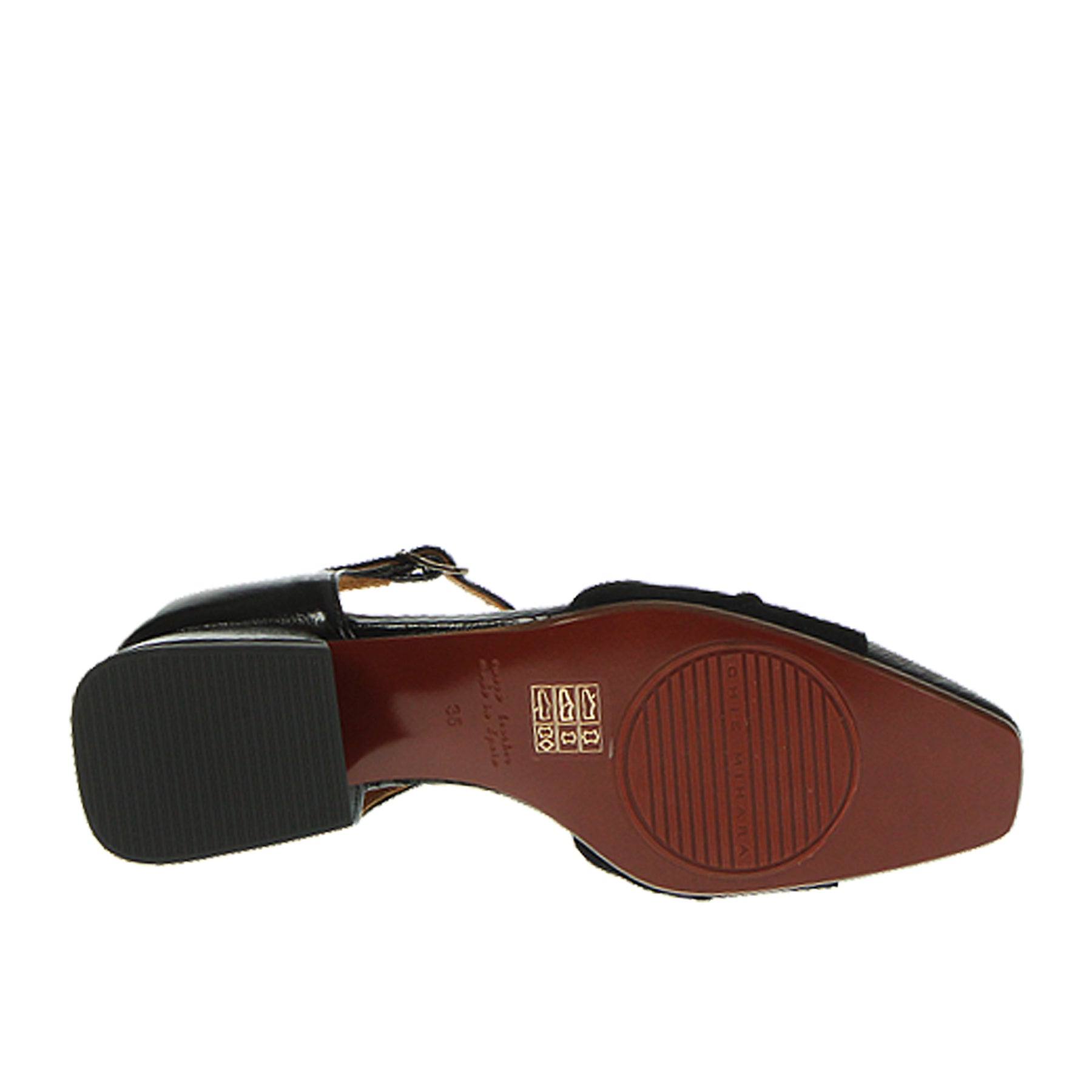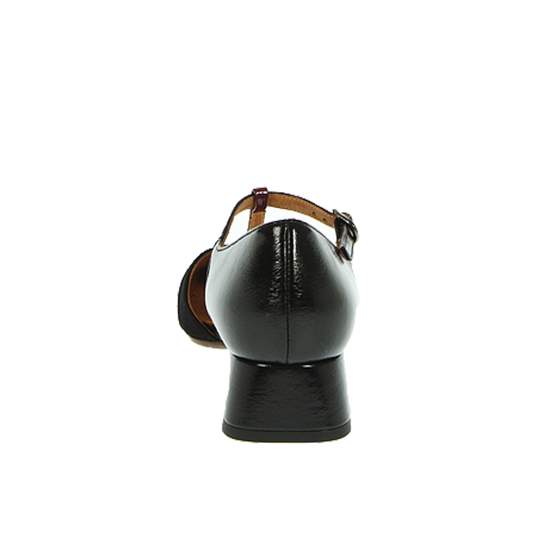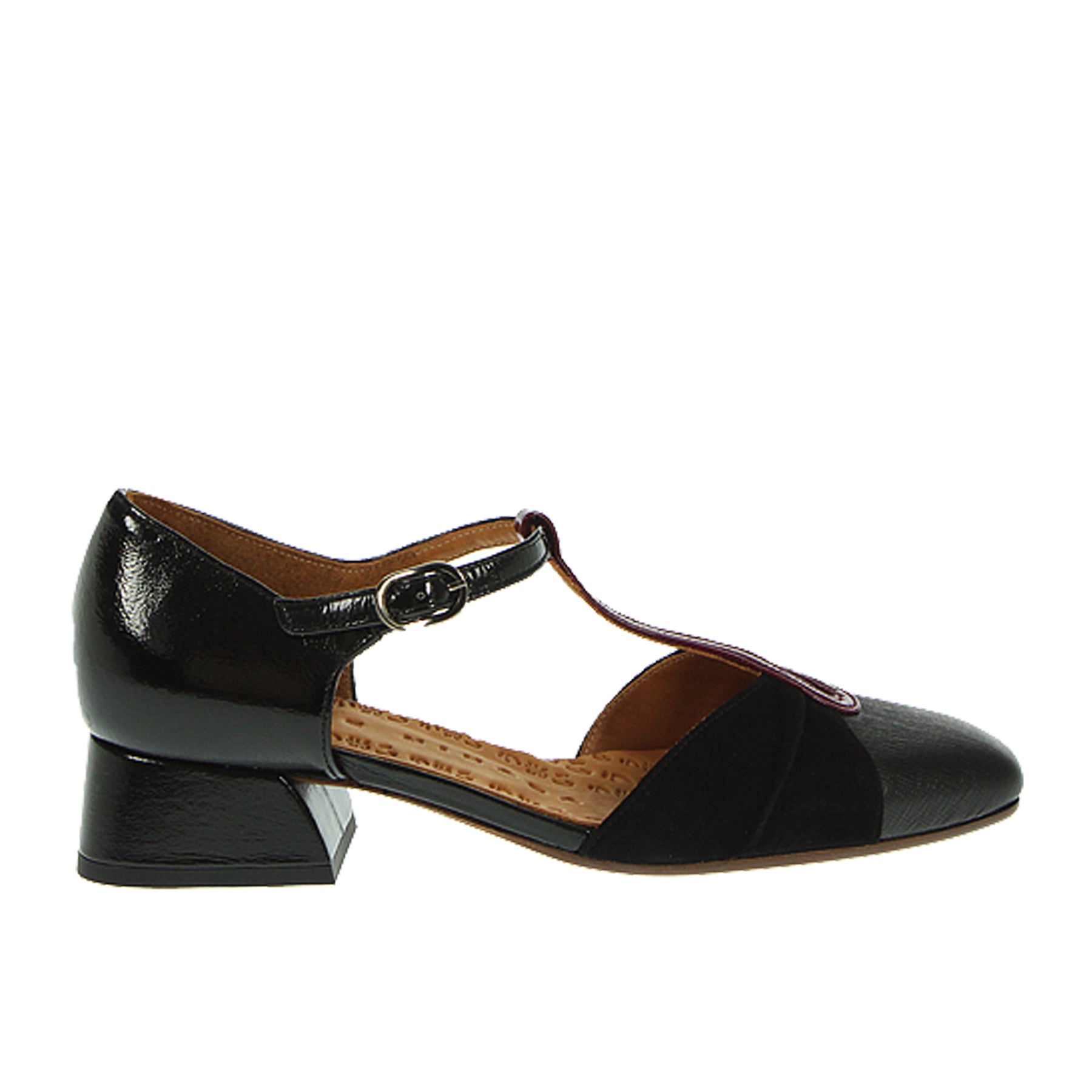 Mary jane Chie Mihara, nera, in vernice, con inserto in camoscio e pelle in punta, con cinturino, suola in cuoio e gomma, altezza tacco 3 cm