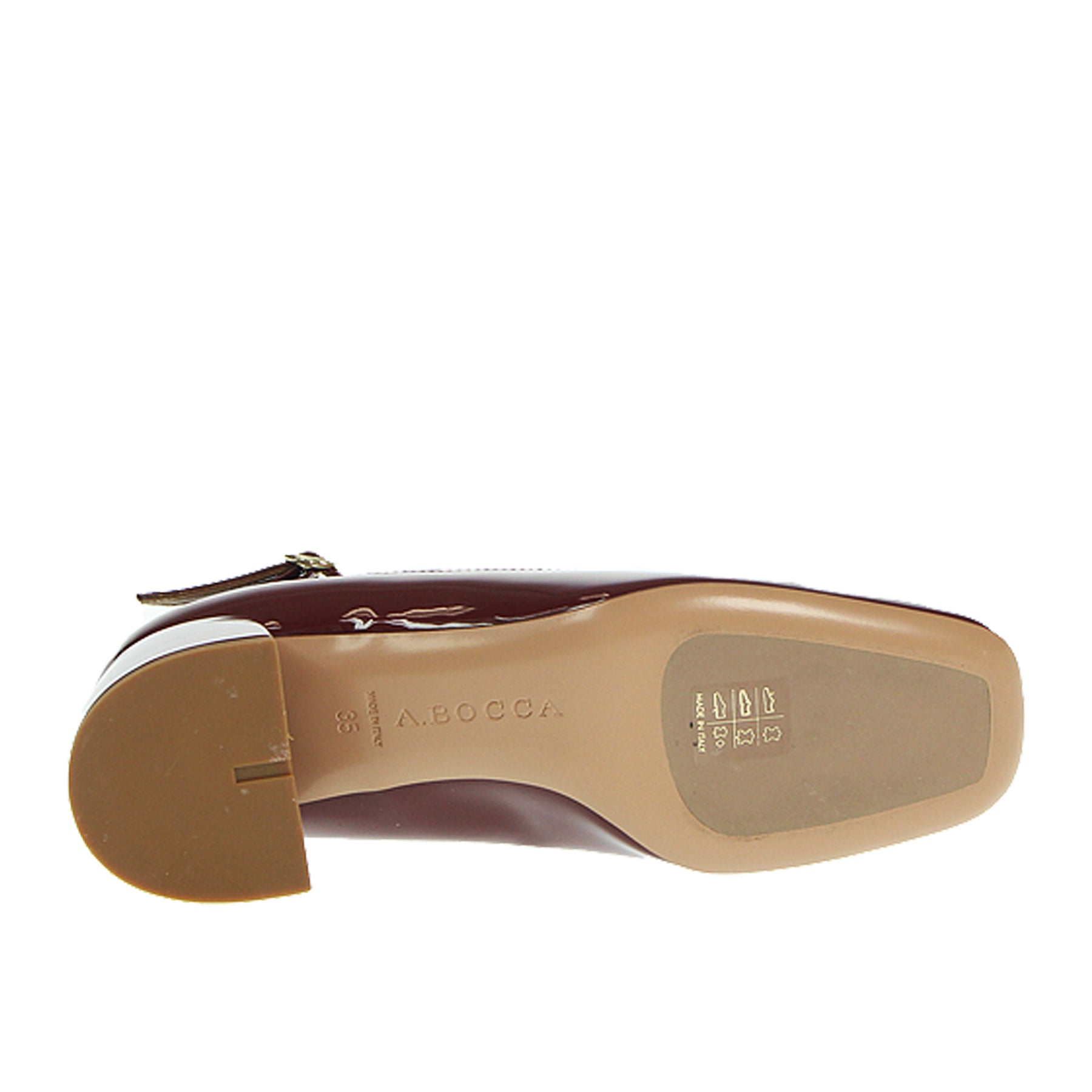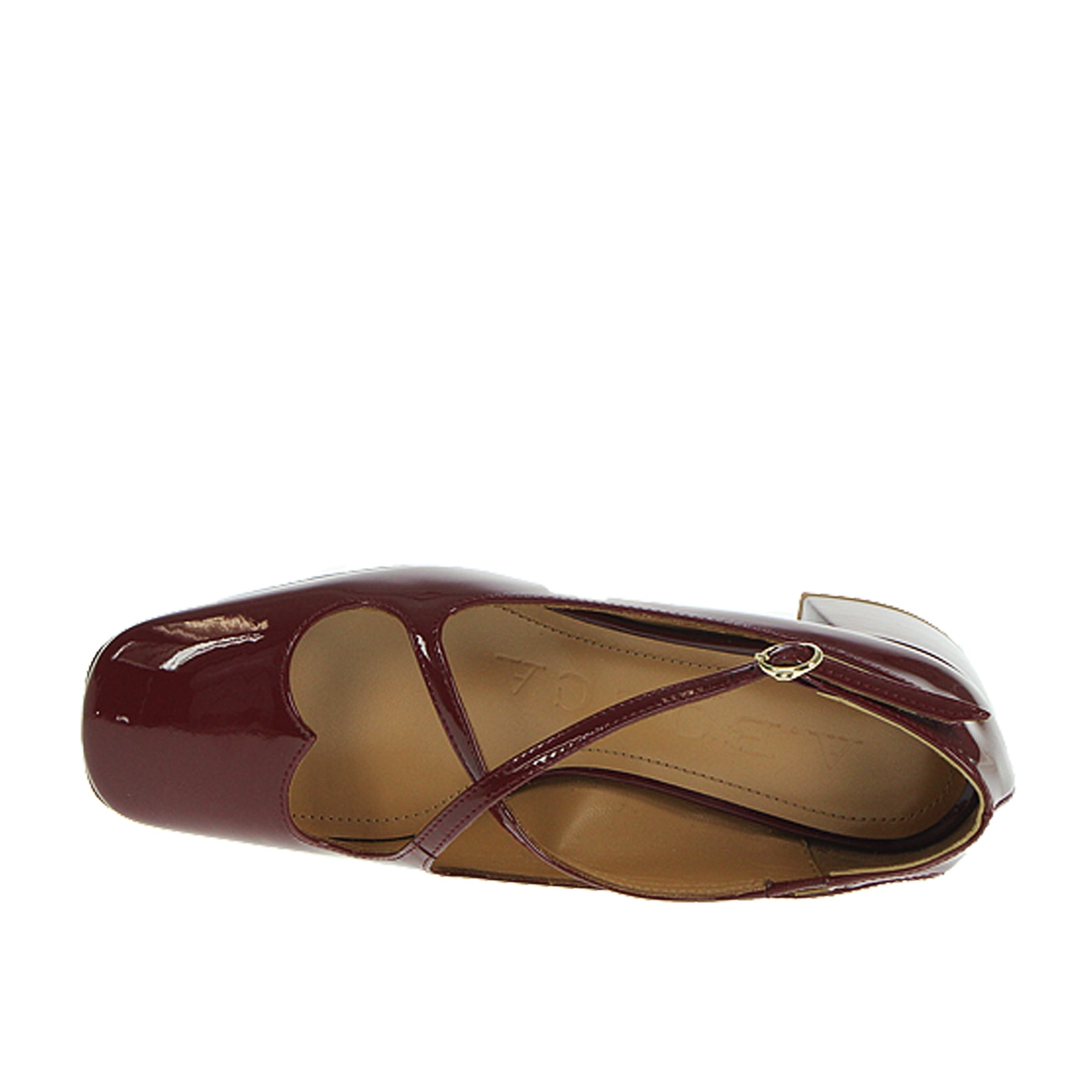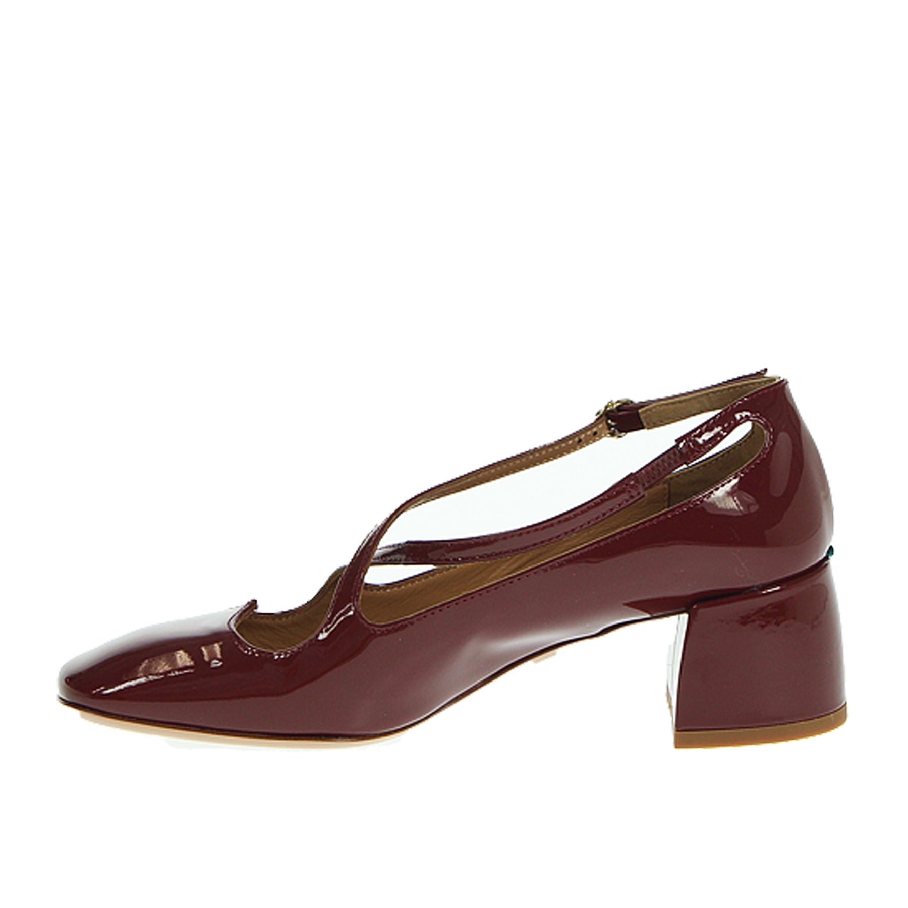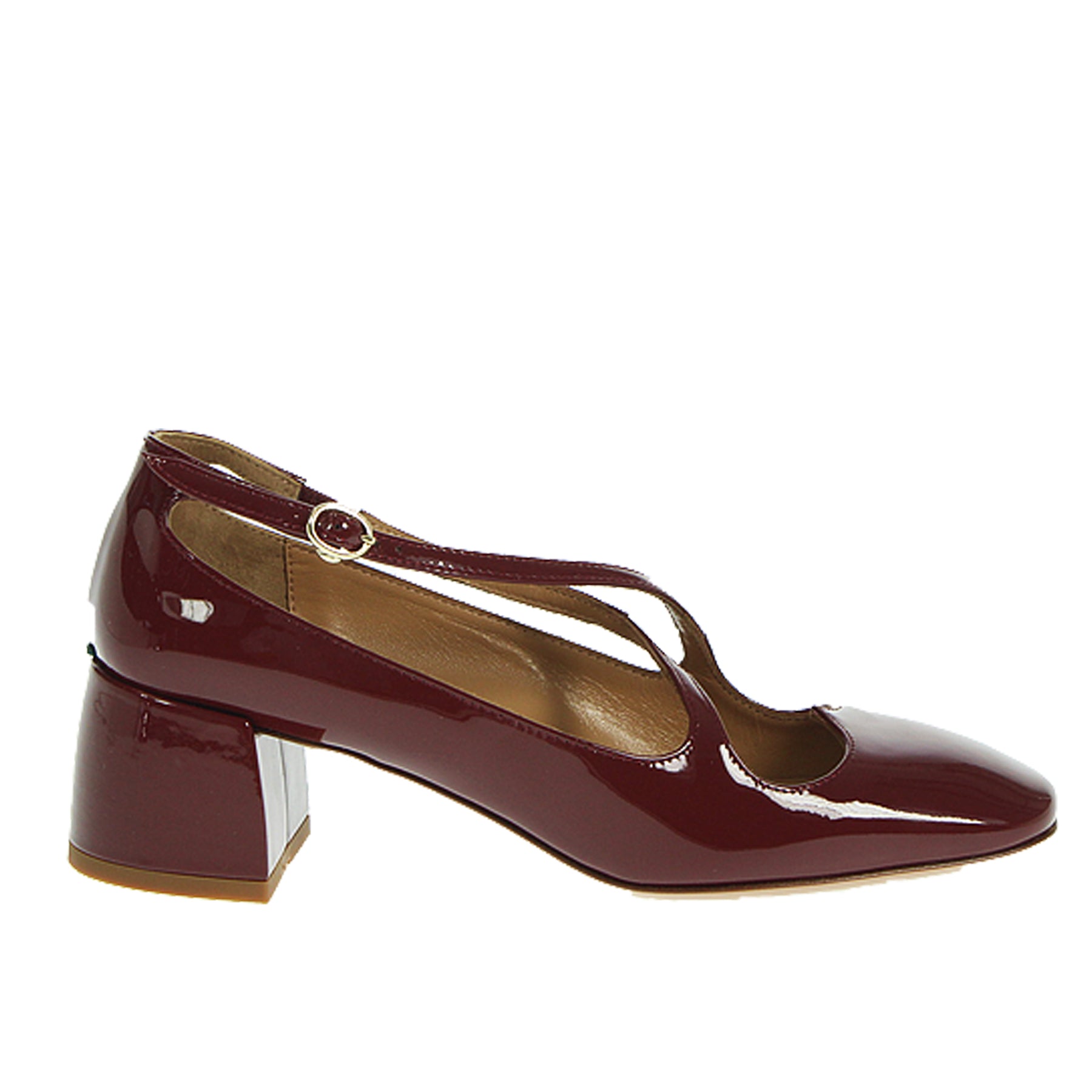Mary jane A. Bocca, in vernice, colore bordeaux, cinturini intrecciati sul dorso, tacco ampio, altezza tacco 5 cm, suola in cuoio con inserto in gomma