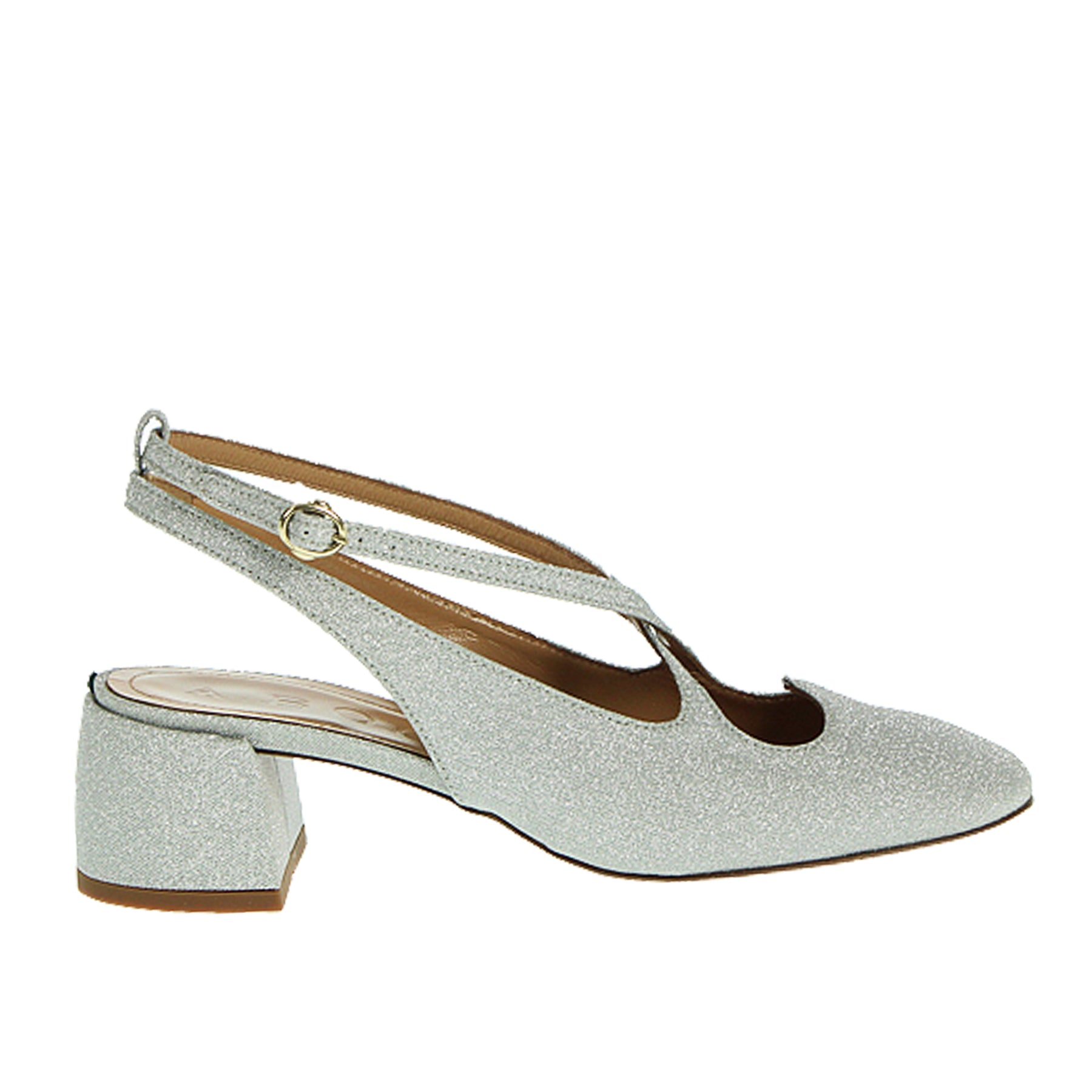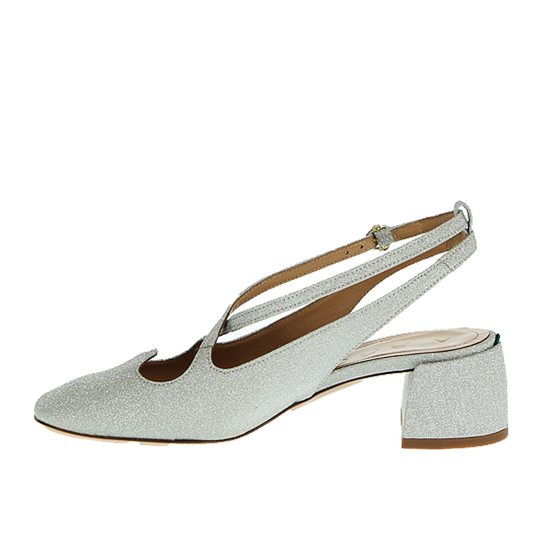 Mary jane A. Bocca, in tessuto brillantinato, colore argento, cinturini intrecciati sul dorso, aperta sul tallone, cinturino alla caviglia, tacco ampio, altezza tacco 5 cm, suola in cuoio