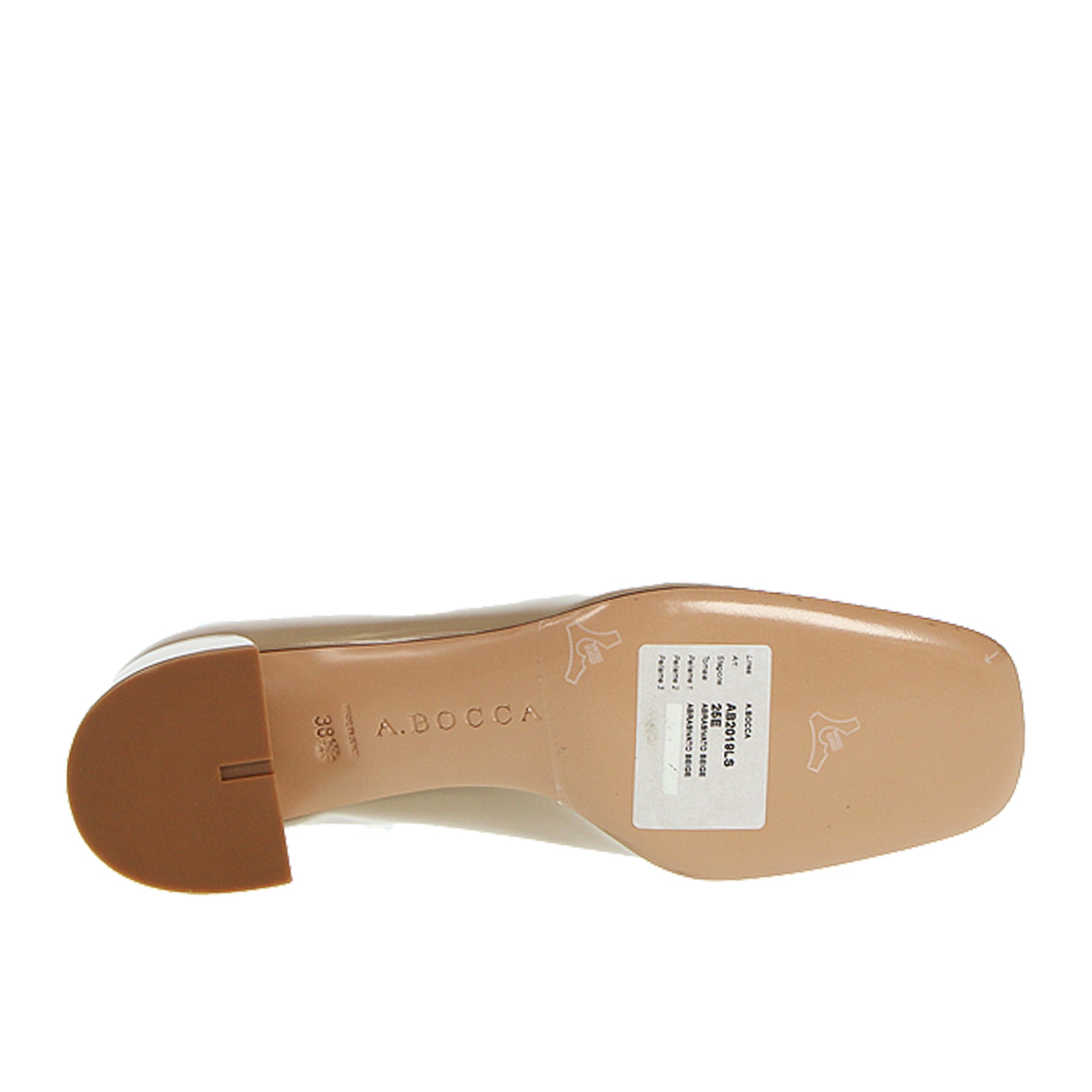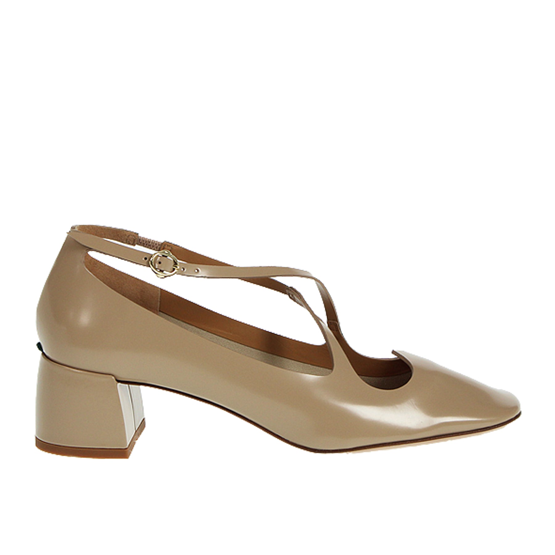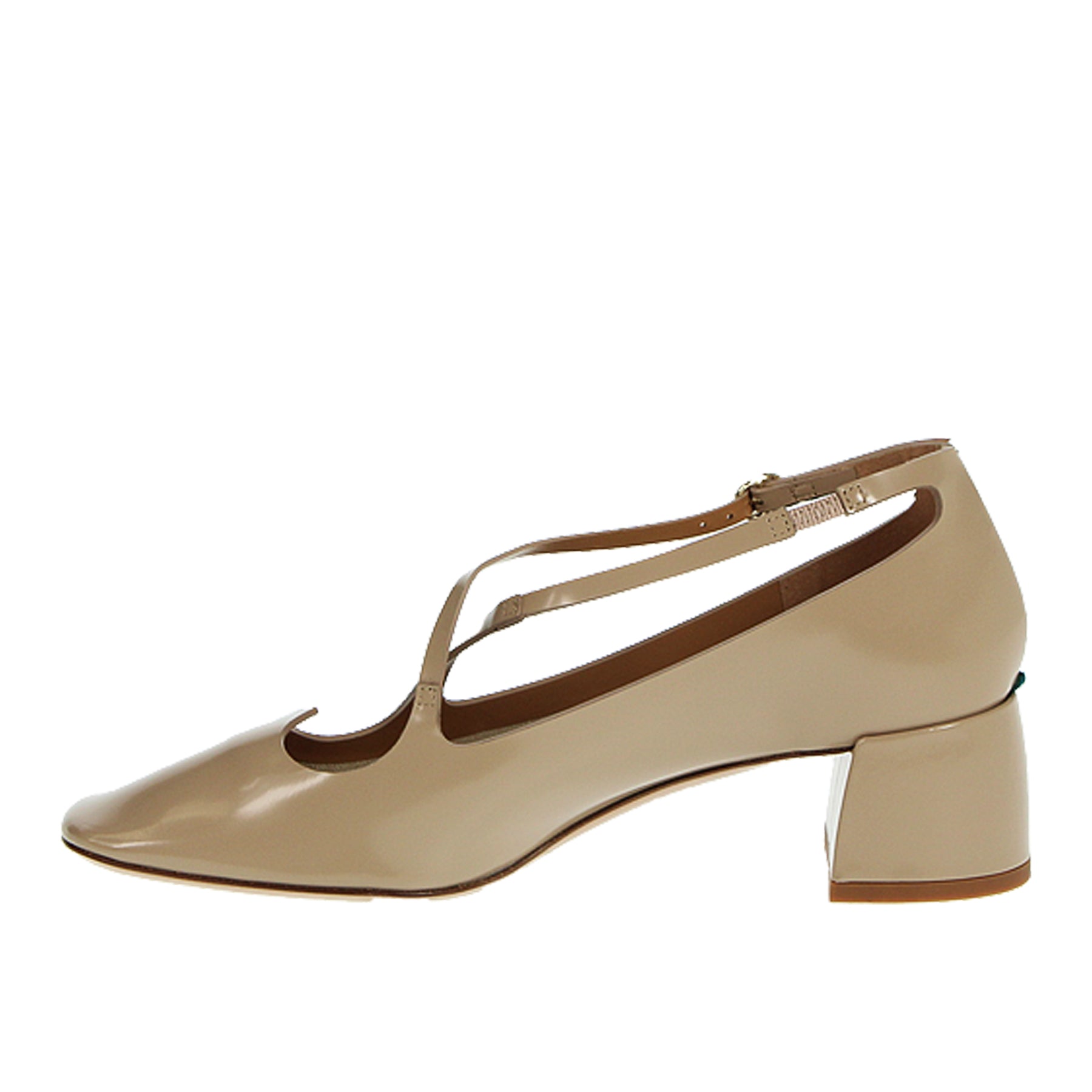 Mary jane A. Bocca, in ecopelle, colore beige, con punta squadrata, con cinturini incrociati sul dorso, altezza tacco 5 cm, suola in cuoio