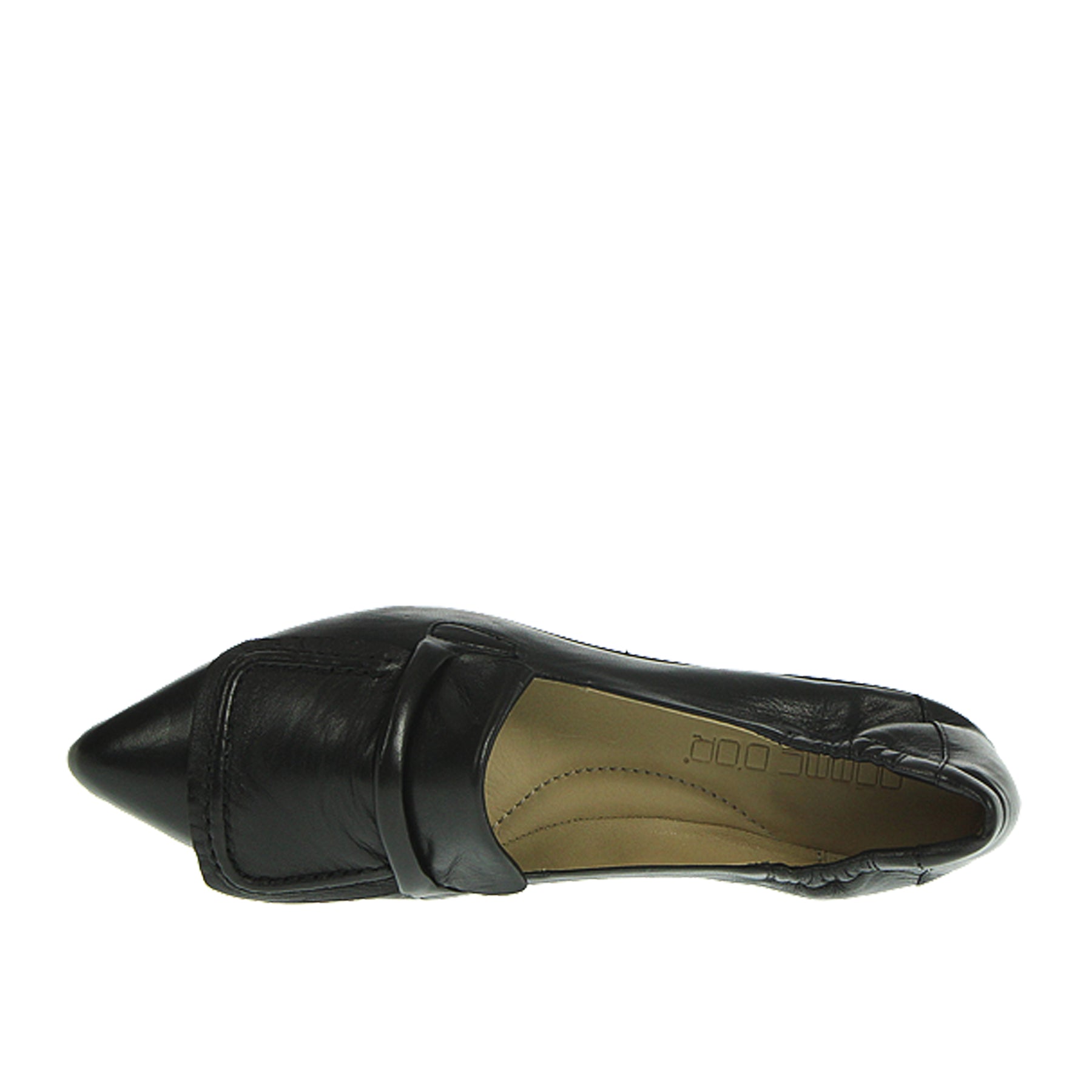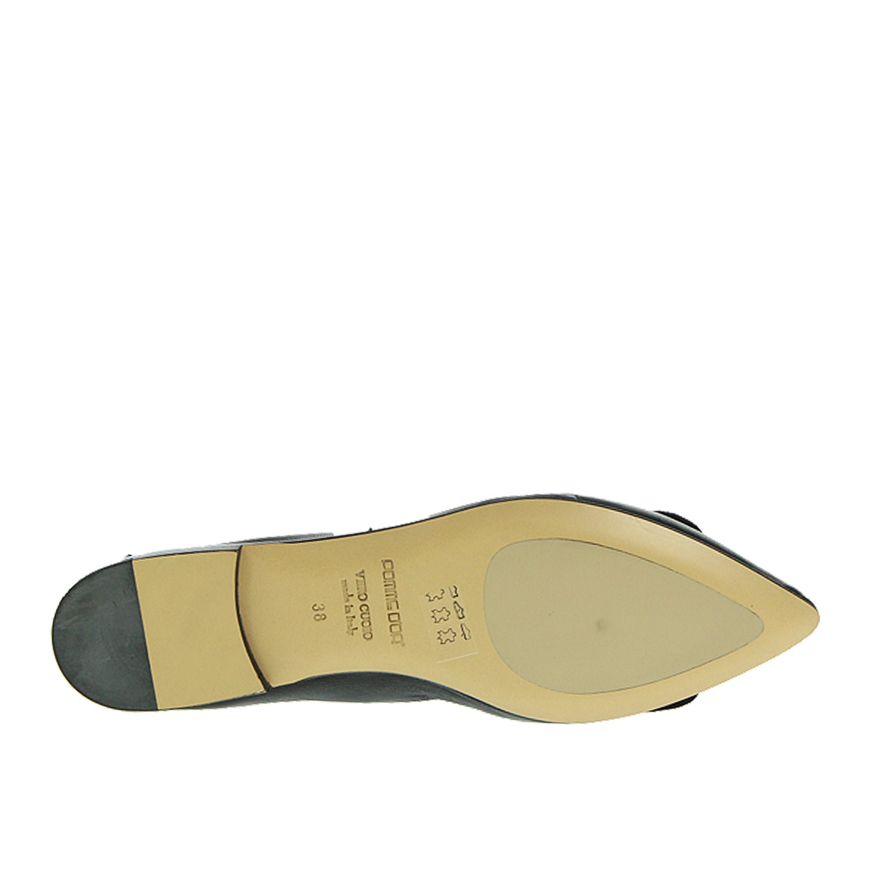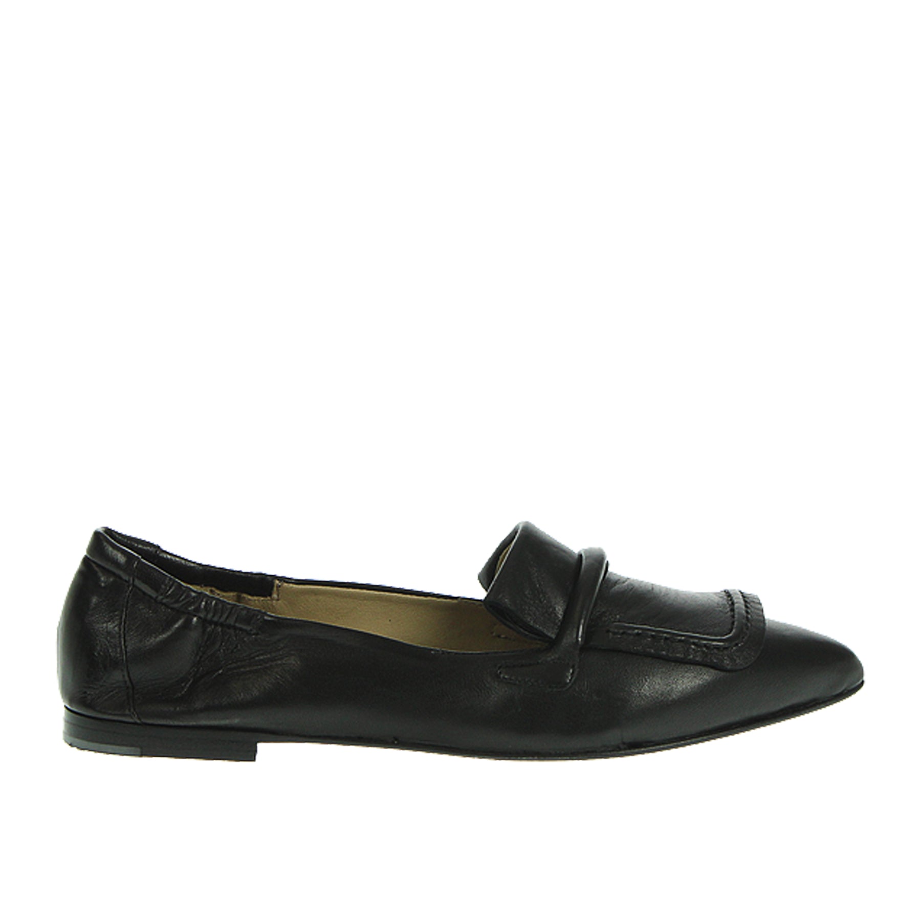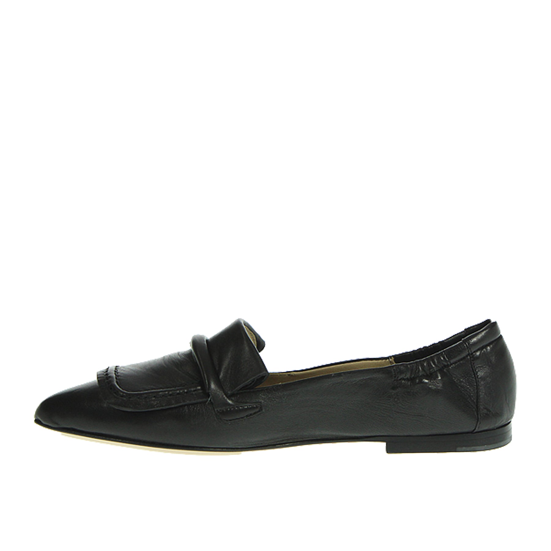 Mocassino in pelle, colore nero, a punta, elastico al tallone, con applicazione frontale, suola in cuoio