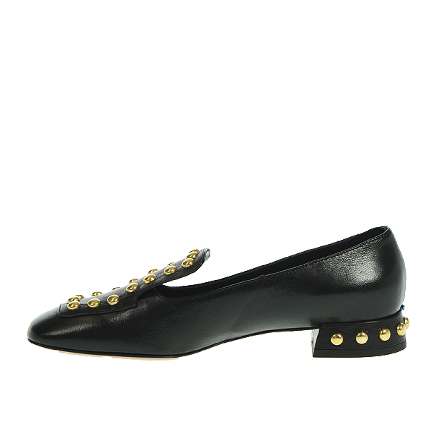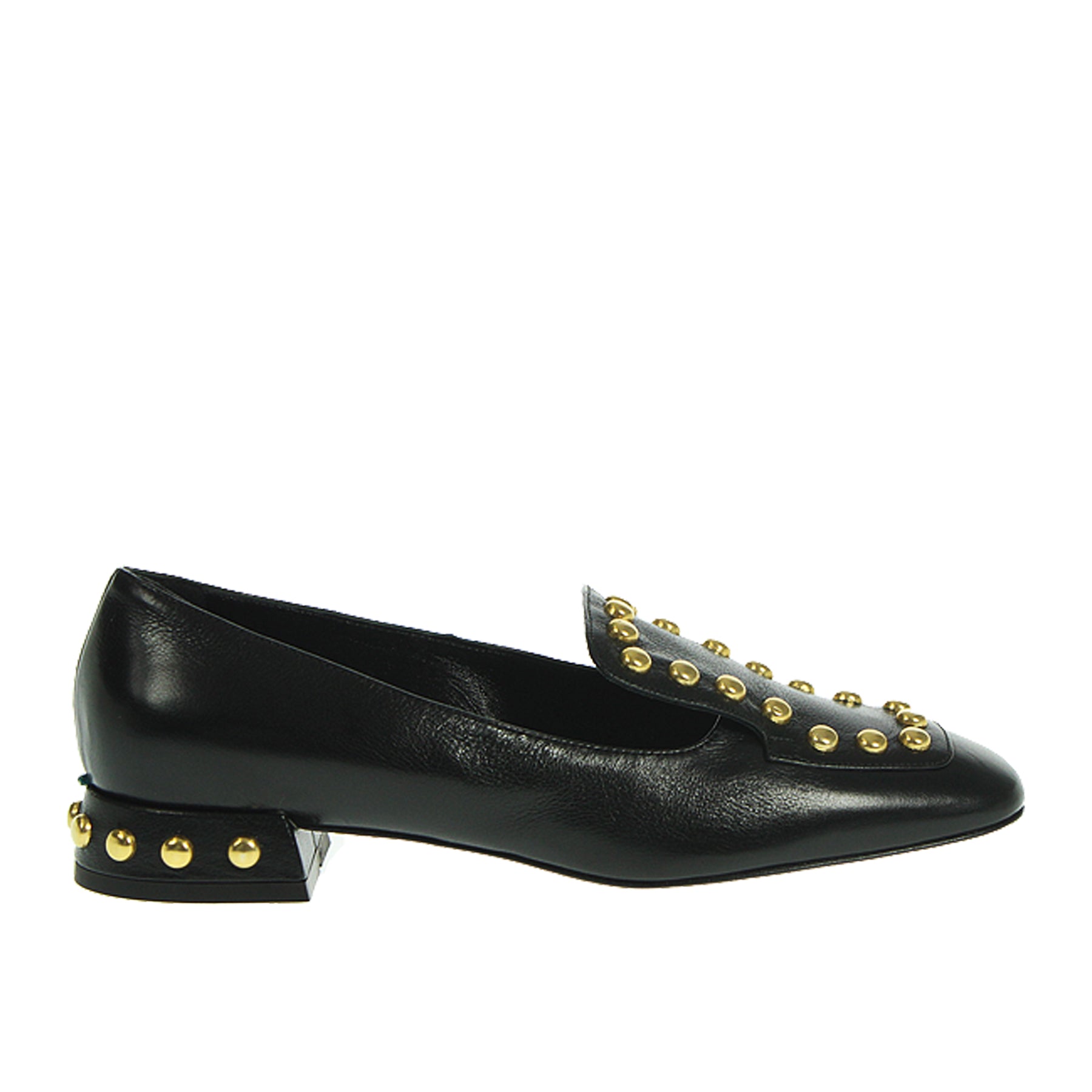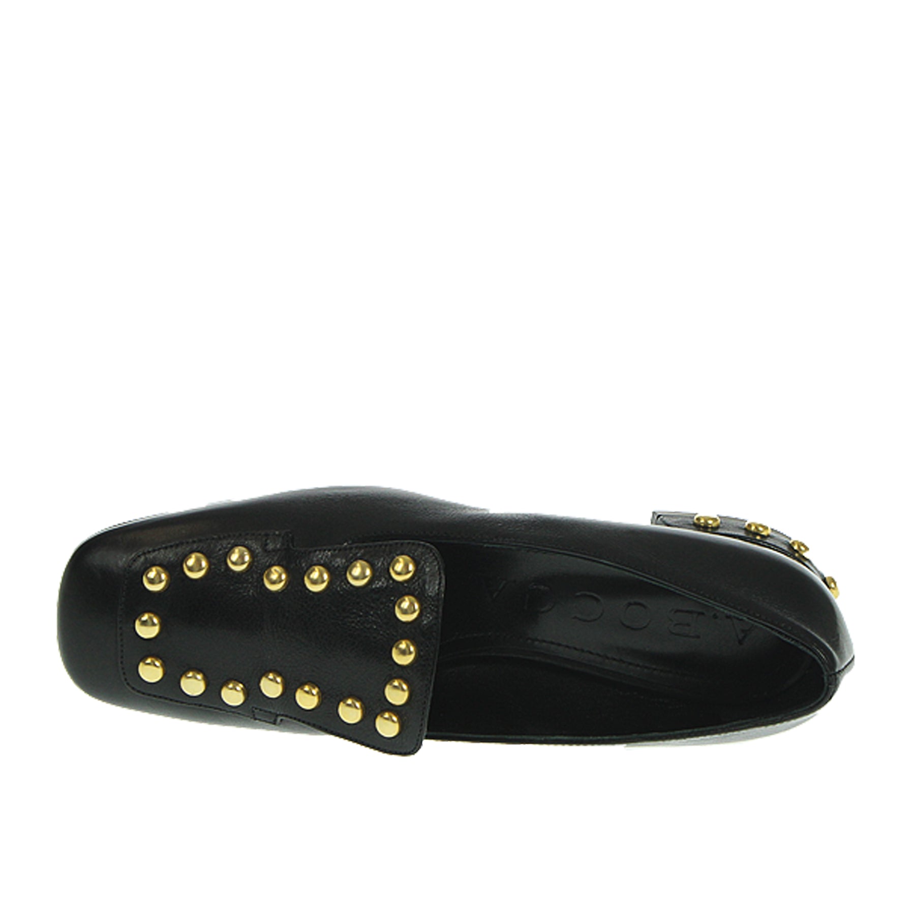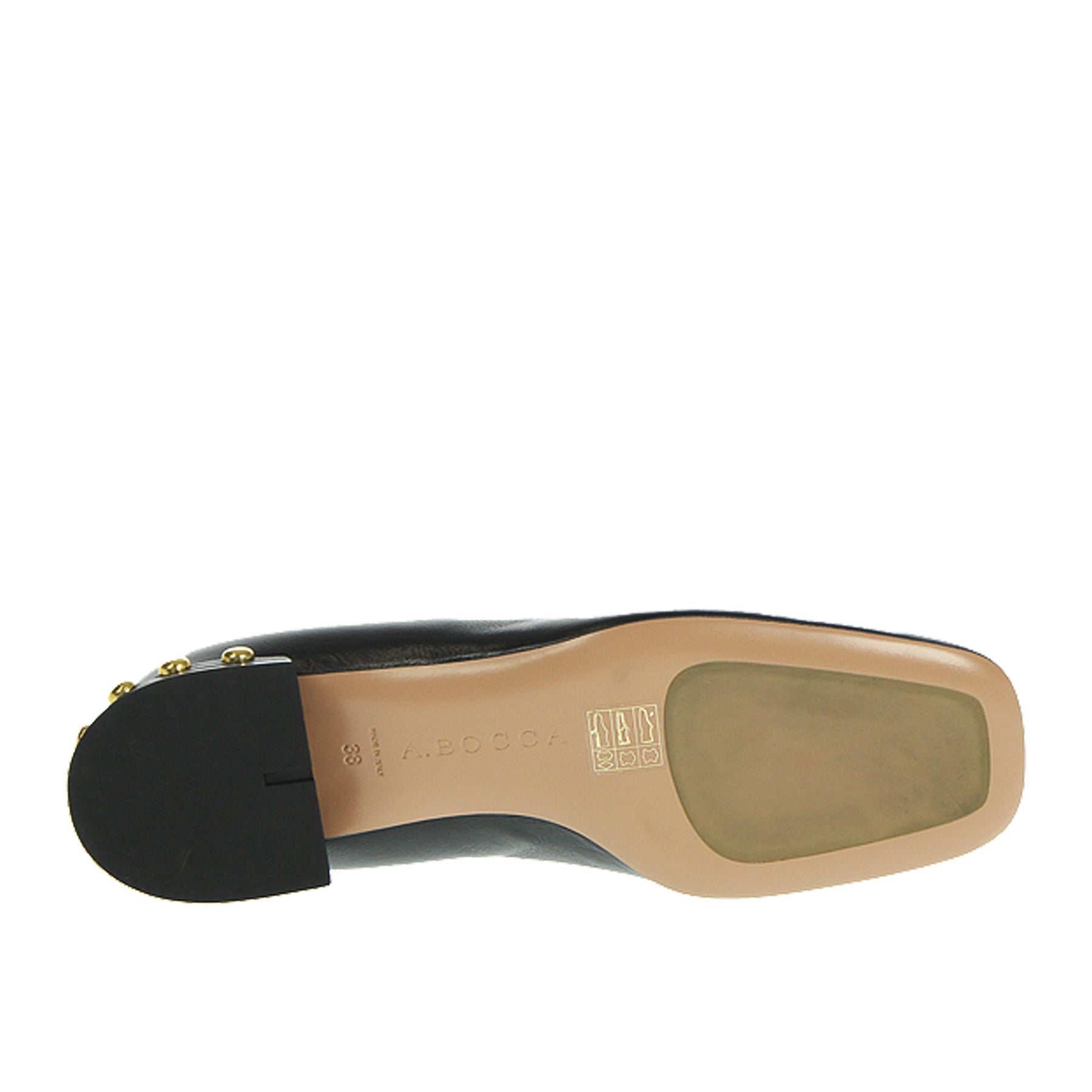 Mocassino A. Bocca, in pelle nera, con borchie dorate sul davanti e sul tacco, suola in cuoio con inserto in gomma
