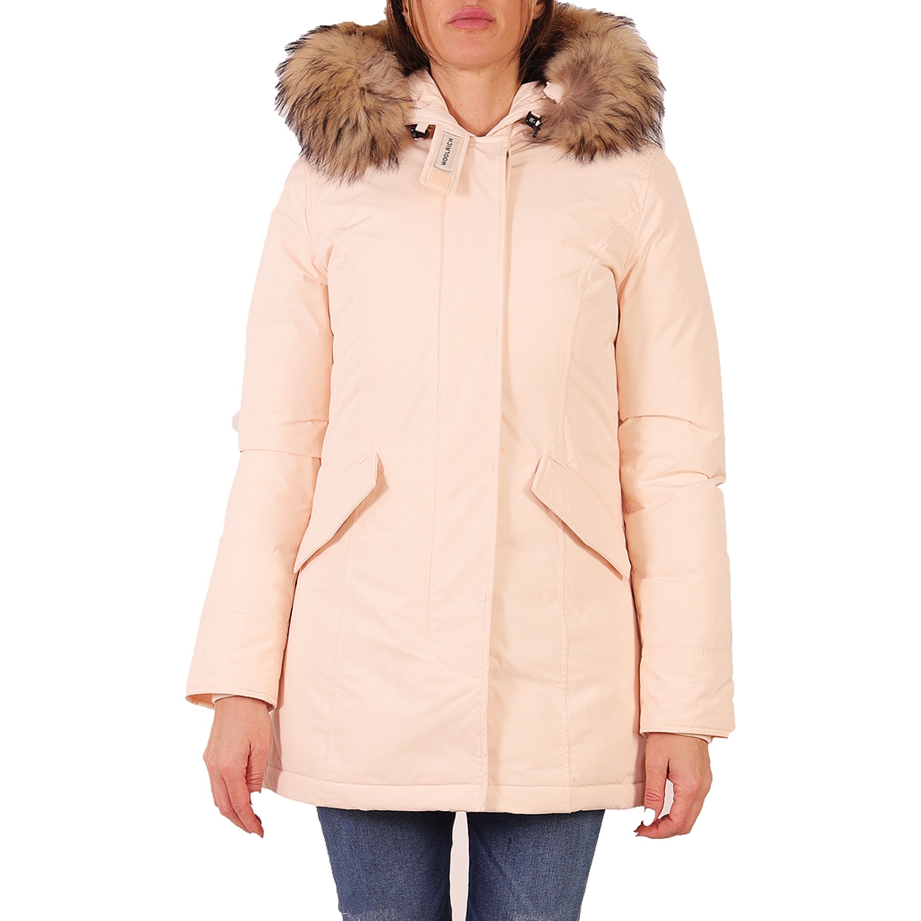 Piumino Woolrich, sfiancato, cappuccio con pelliccia, con tasche, chiusura con cerniera e bottoni a pressione